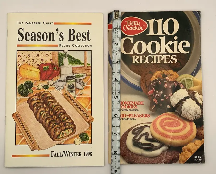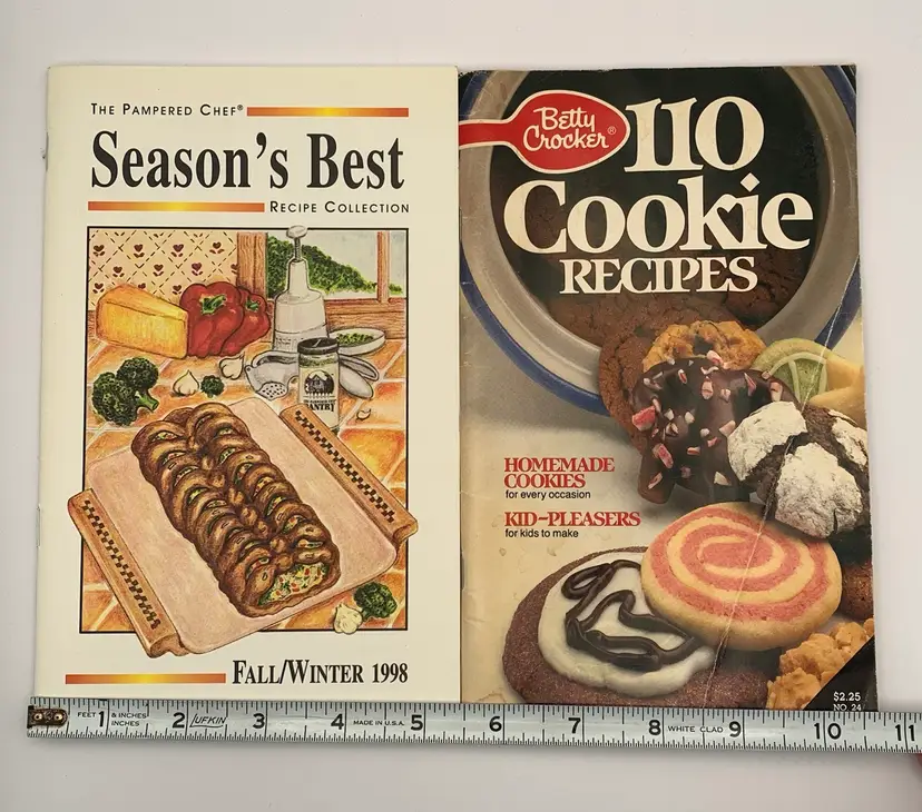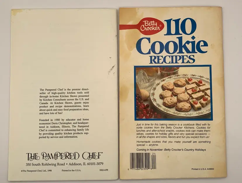 The cookie book does have some food stains from previous use. All pages are intact. Pampered chef fall/winter 1998 Betty Crocker 1987 See all photos for condition details and measurements. I am happy to answer any questions. Thanks for checking out my listings.
