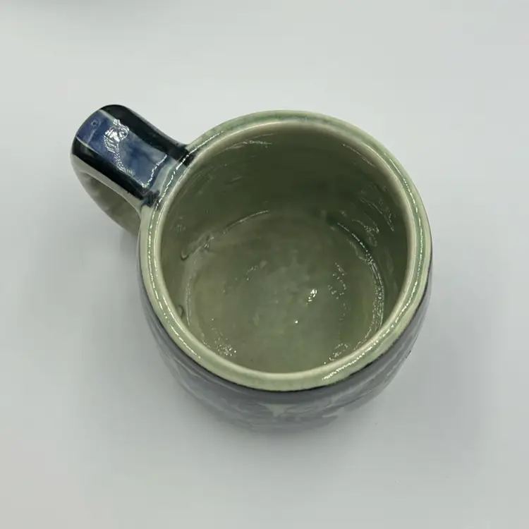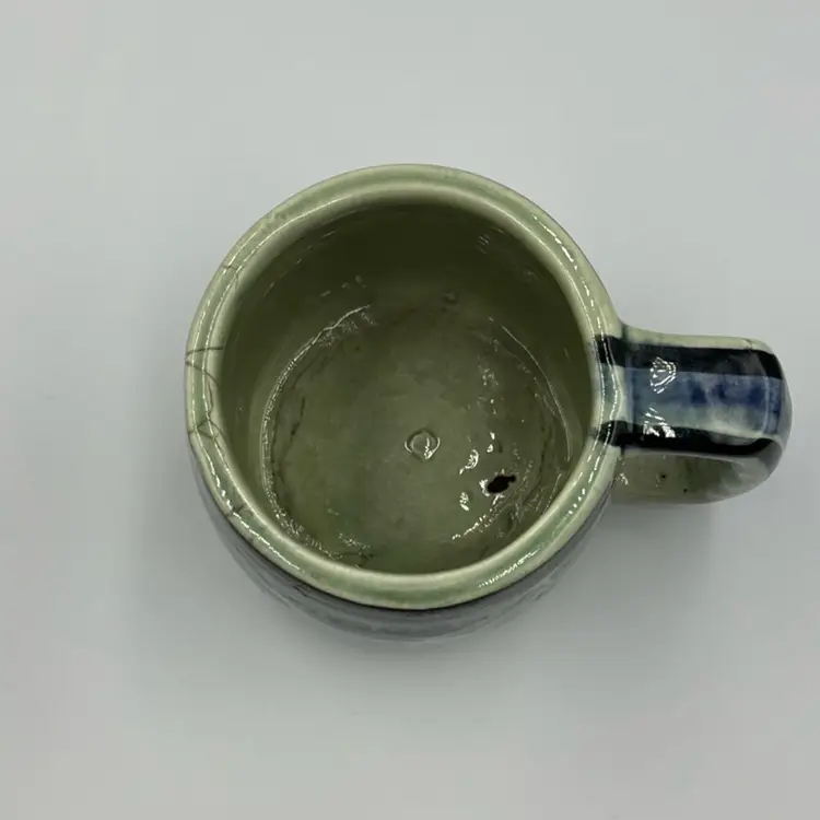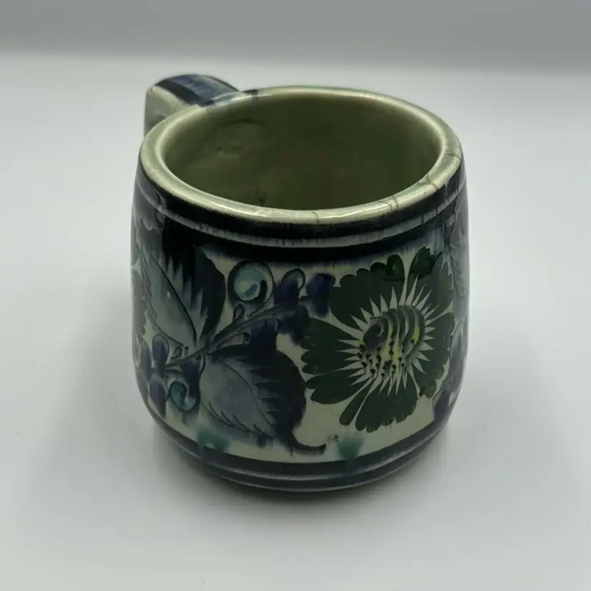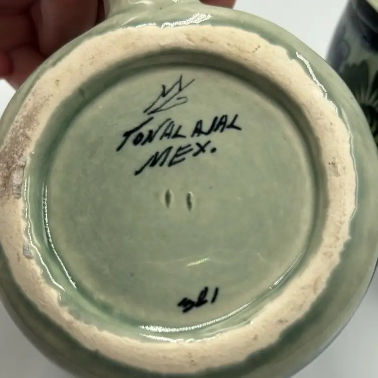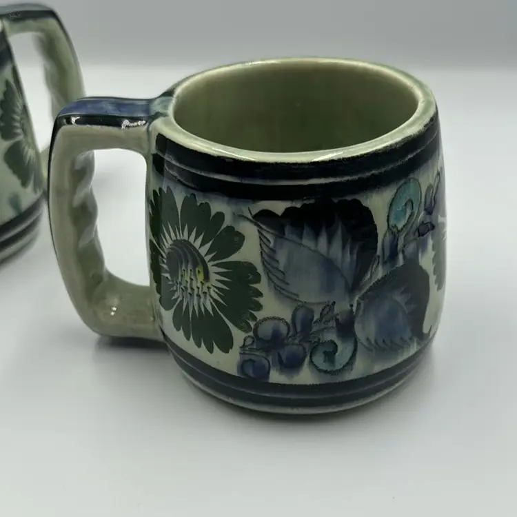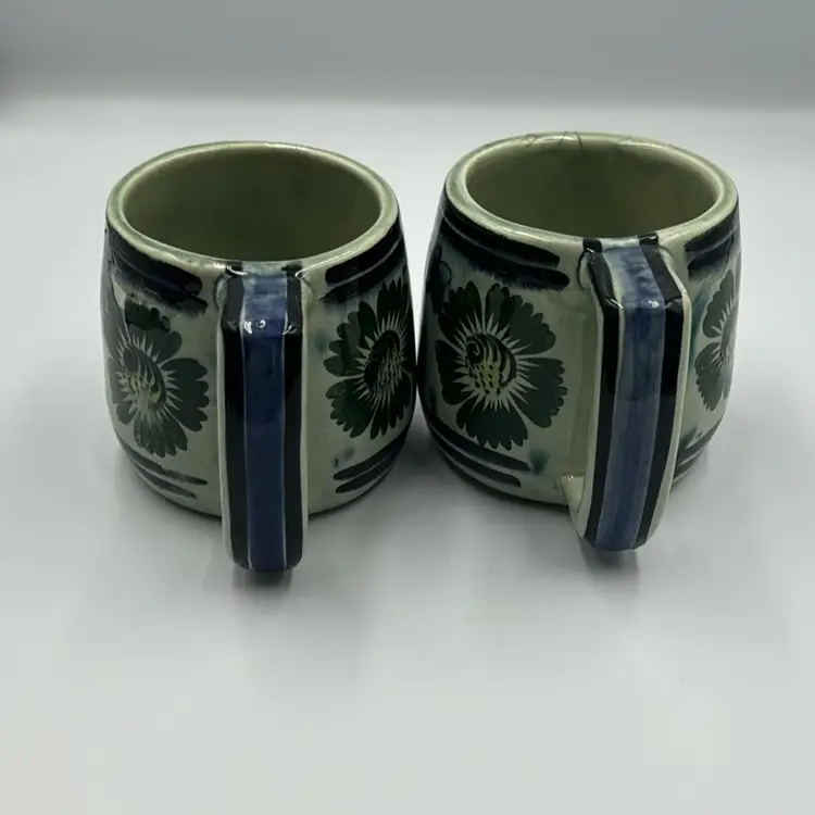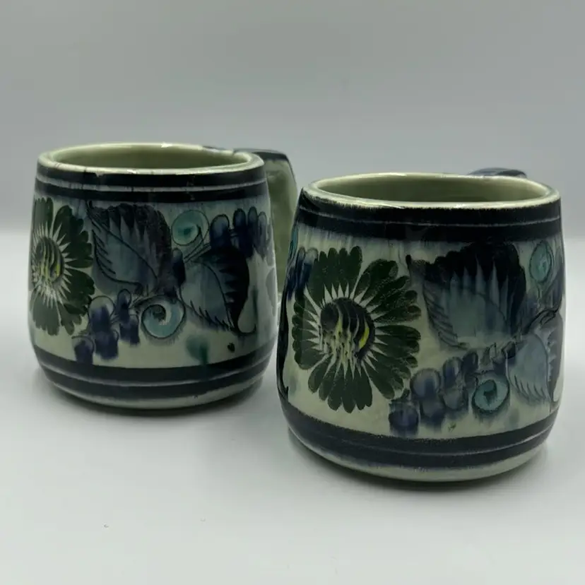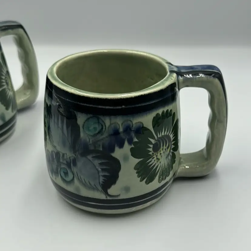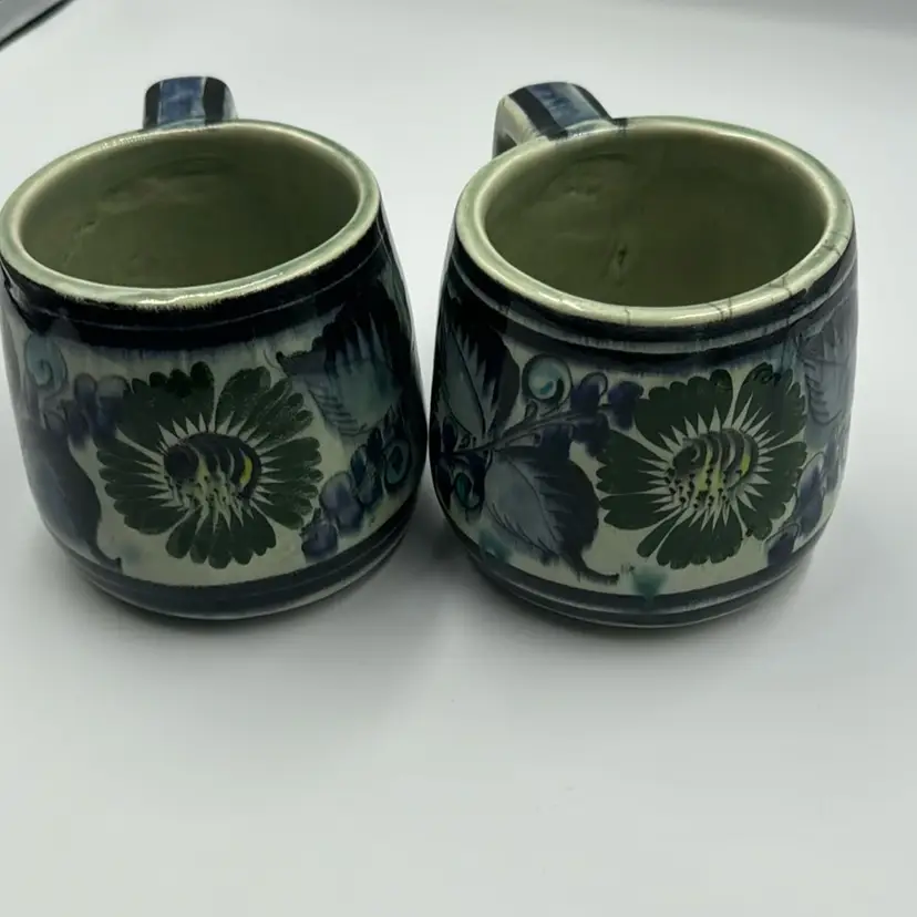 Condition: Pre-owned, beautiful shape. Signed Tonala Jal. (Jalisco) Mexico MG. Clay is a light green sage body with a teal greenish base with beautiful blue, dark teal and plum purple flower and blue / aqua leaves design. Large handle and body. Probably holds at least 8-12 ounces. The rim and interior of one of the cups shows dark crazing, but is not cracked. The other cup shows no wear or crazing. Neither have cracks, nicks, or dings.