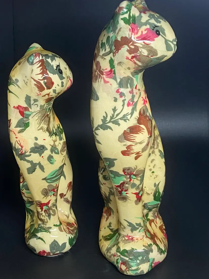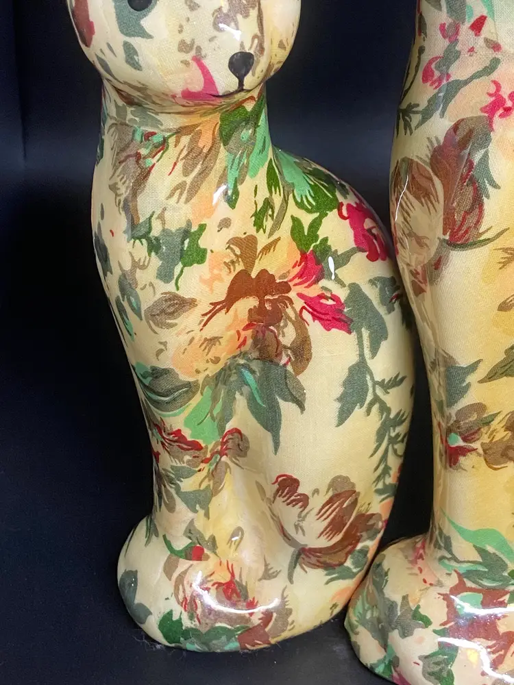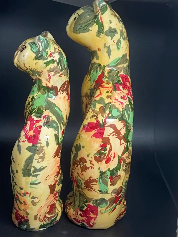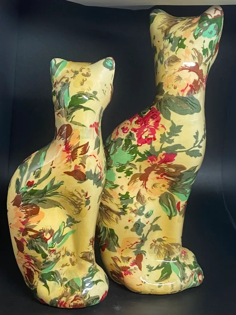 9" Tall and 11" Tall. Discover the charm and delicate craftsmanship of these vintage Joan Baker Floral Decoupage Patchwork Porcelain Cat Figurines. Each figurine showcases the exquisite art of decoupage, with intricate floral patterns that adorn the porcelain surface, bringing a touch of nature's beauty to your home decor. The set includes two cat figurines, crafted to capture the essence of feline grace.