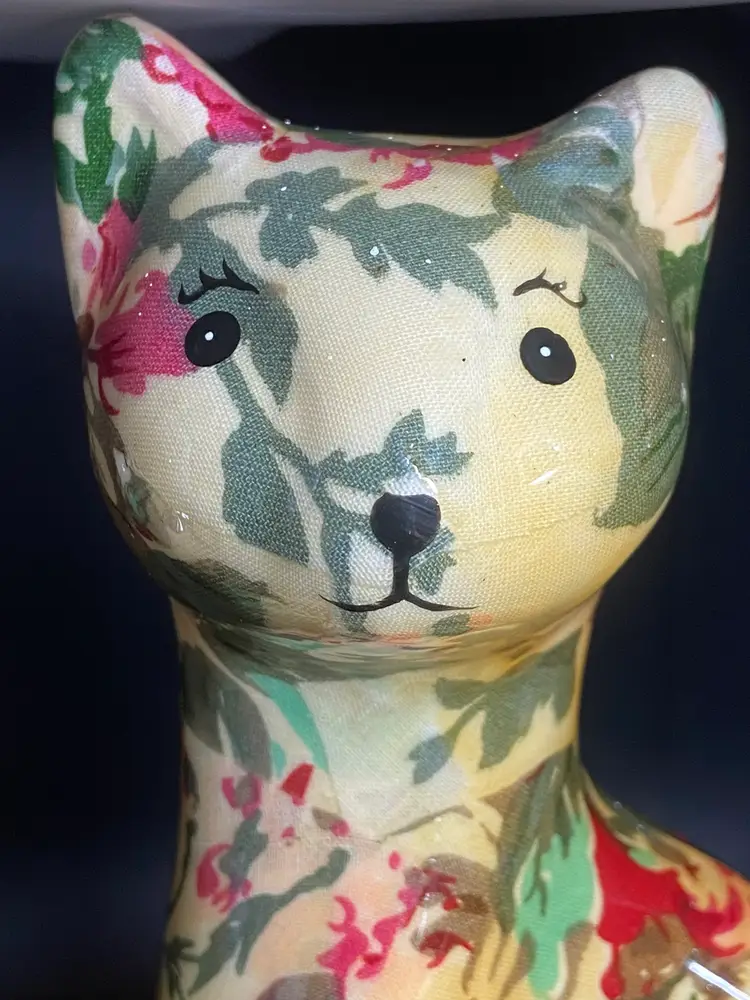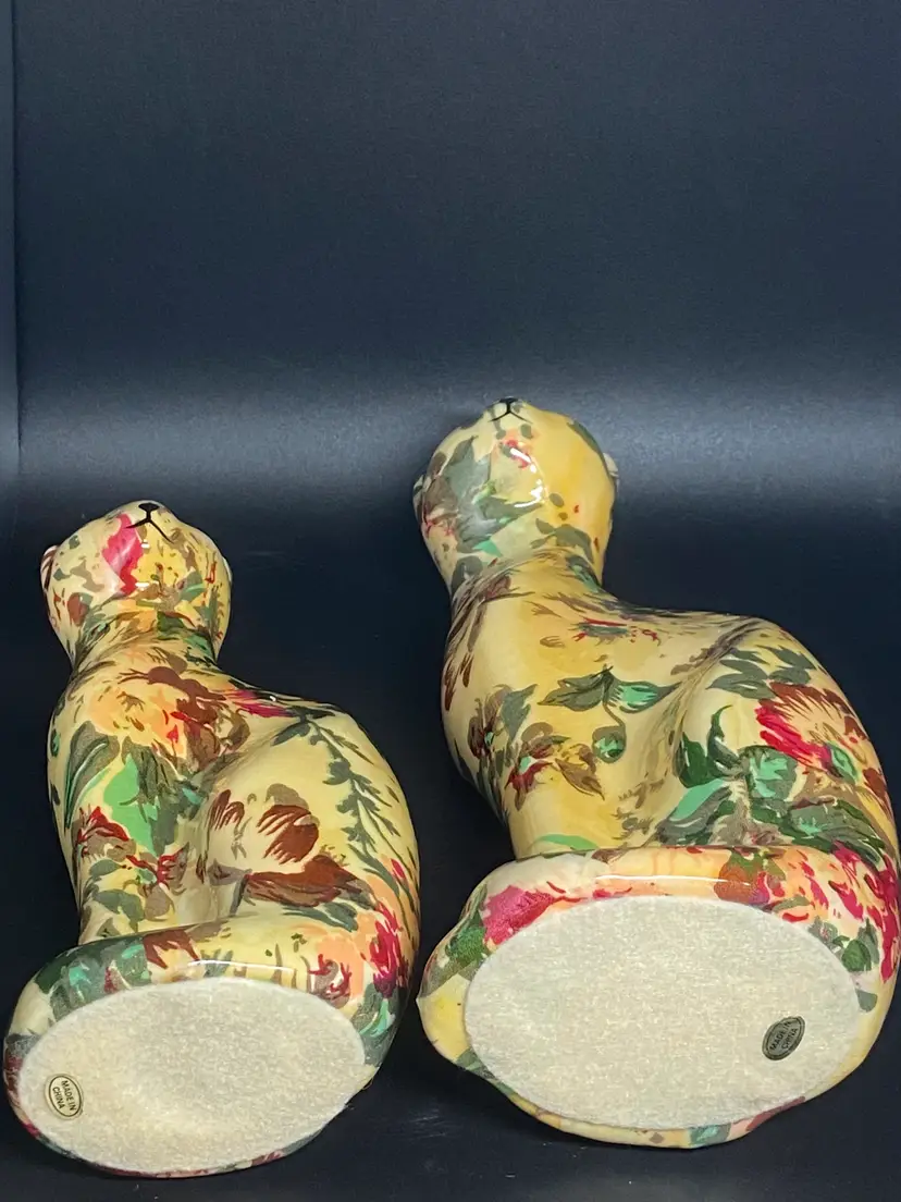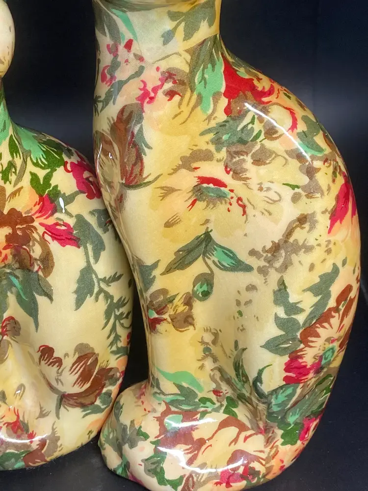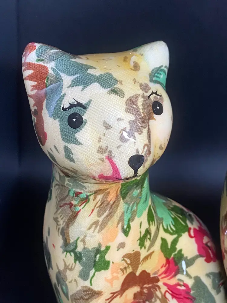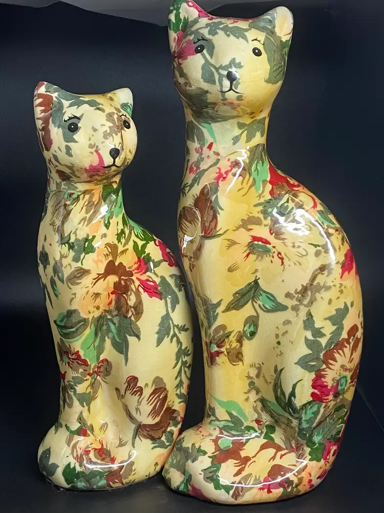 9" Tall and 11" Tall. Discover the charm and delicate craftsmanship of these vintage Joan Baker Floral Decoupage Patchwork Porcelain Cat Figurines. Each figurine showcases the exquisite art of decoupage, with intricate floral patterns that adorn the porcelain surface, bringing a touch of nature's beauty to your home decor. The set includes two cat figurines, crafted to capture the essence of feline grace.