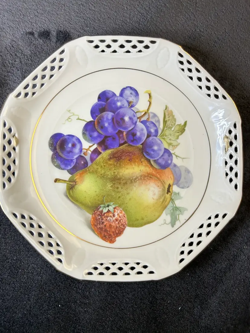 It features a fruit design in the center and a reticulated (lace-like) border.