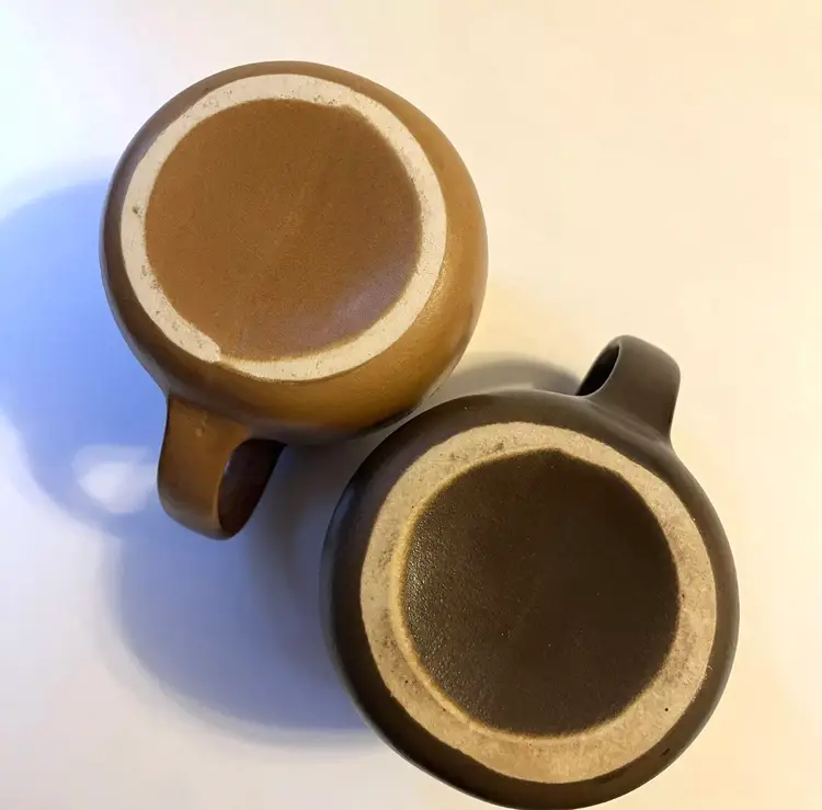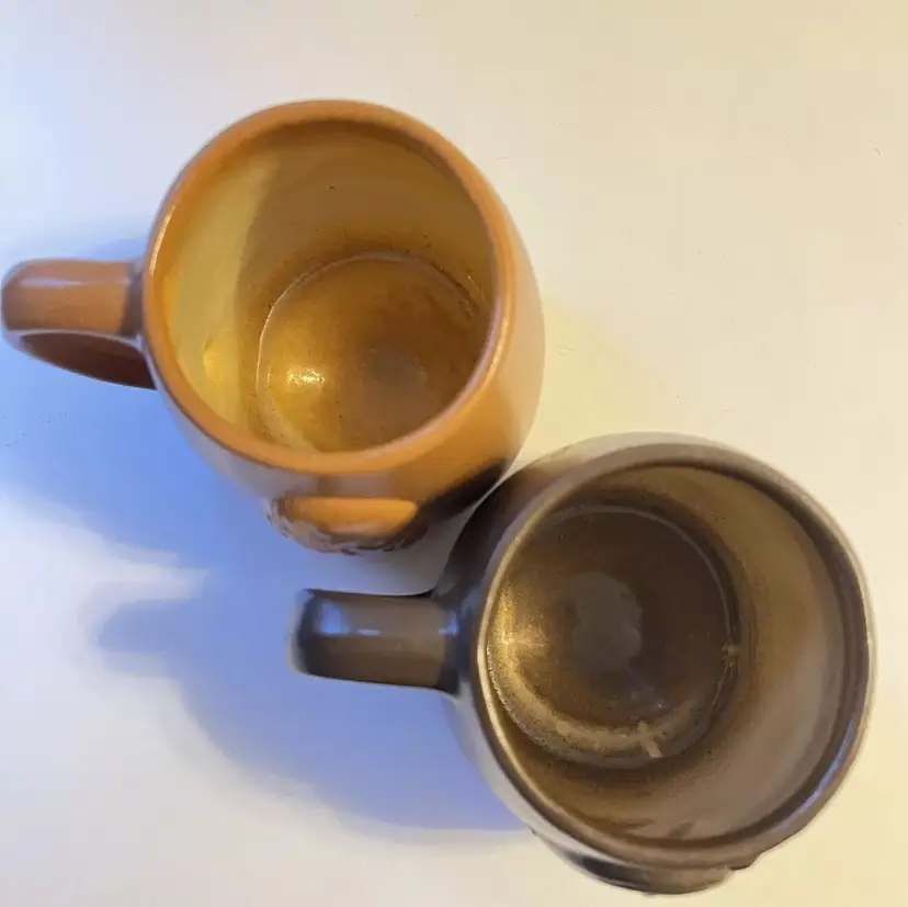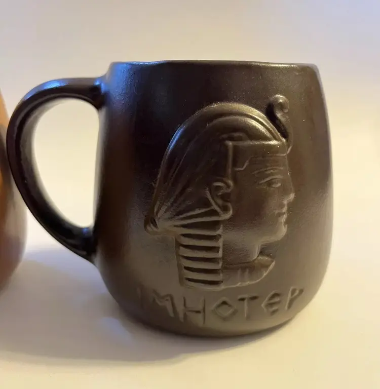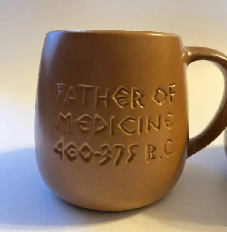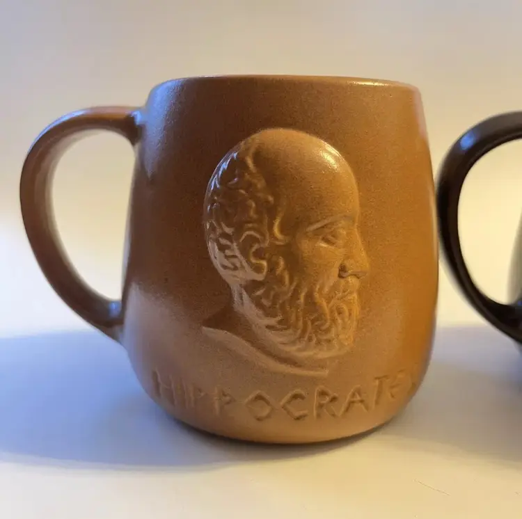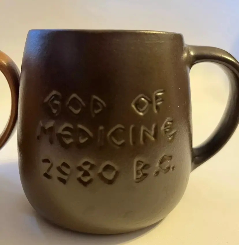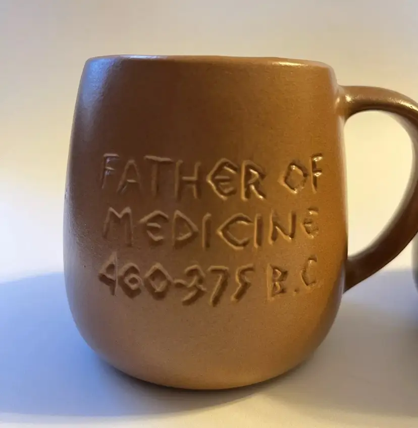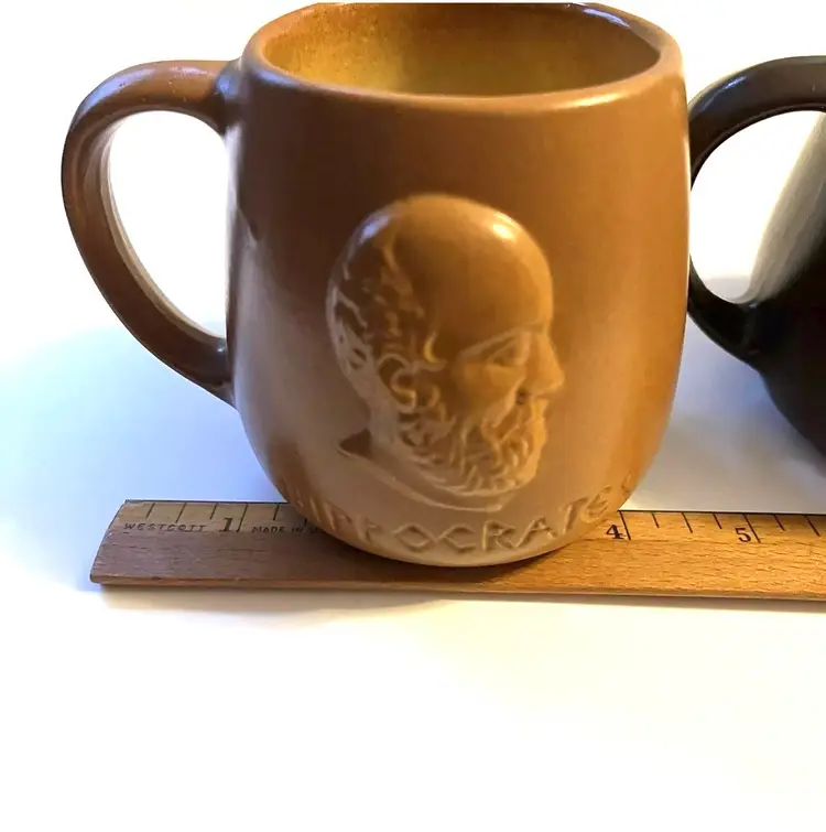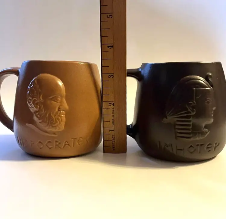Set of 2 stoneware mugs commemorating famous names in medical science medical . Each mug features a 3D relief profile face with name on front and their accomplishment on the back. HIPPOCRATES -father of medicine 460-375 BCE & IMHOTEP - god of medicine 2980 B.C. Nice low gloss finish. Glazed in golden brown and dark brown. Comfortably holds10 oz. Measures 3.5" in height and 4.5” wide including handle.