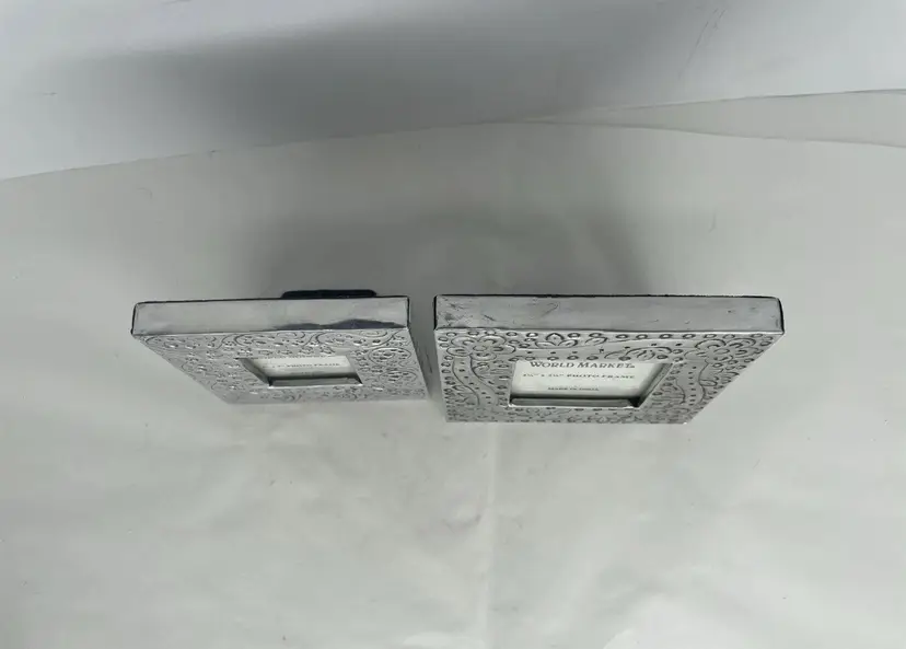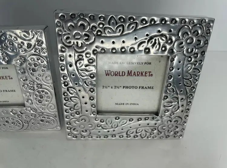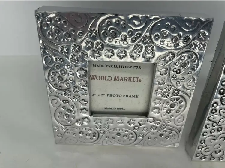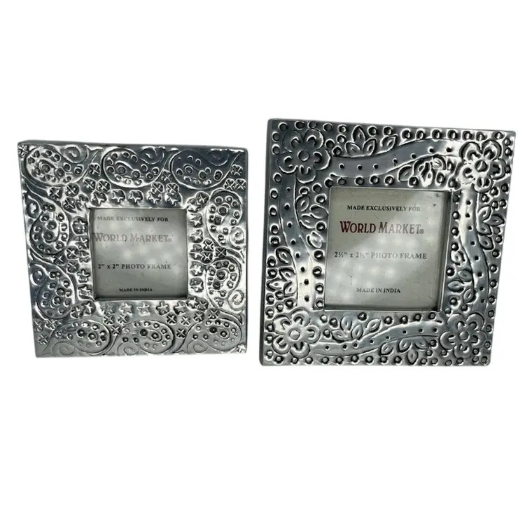 Add a touch of bohemian elegance to your living space with this beautiful set of two miniature picture frames from World Market. The frames are made of polished silver-tone metal and feature intricate floral engravings that add a touch of charm to any room. For photos measuring 2 x 2 inches and 2.5 x 2.5 inches, these frames are perfect for displaying your favorite photos in a portrait or landscape orientation.