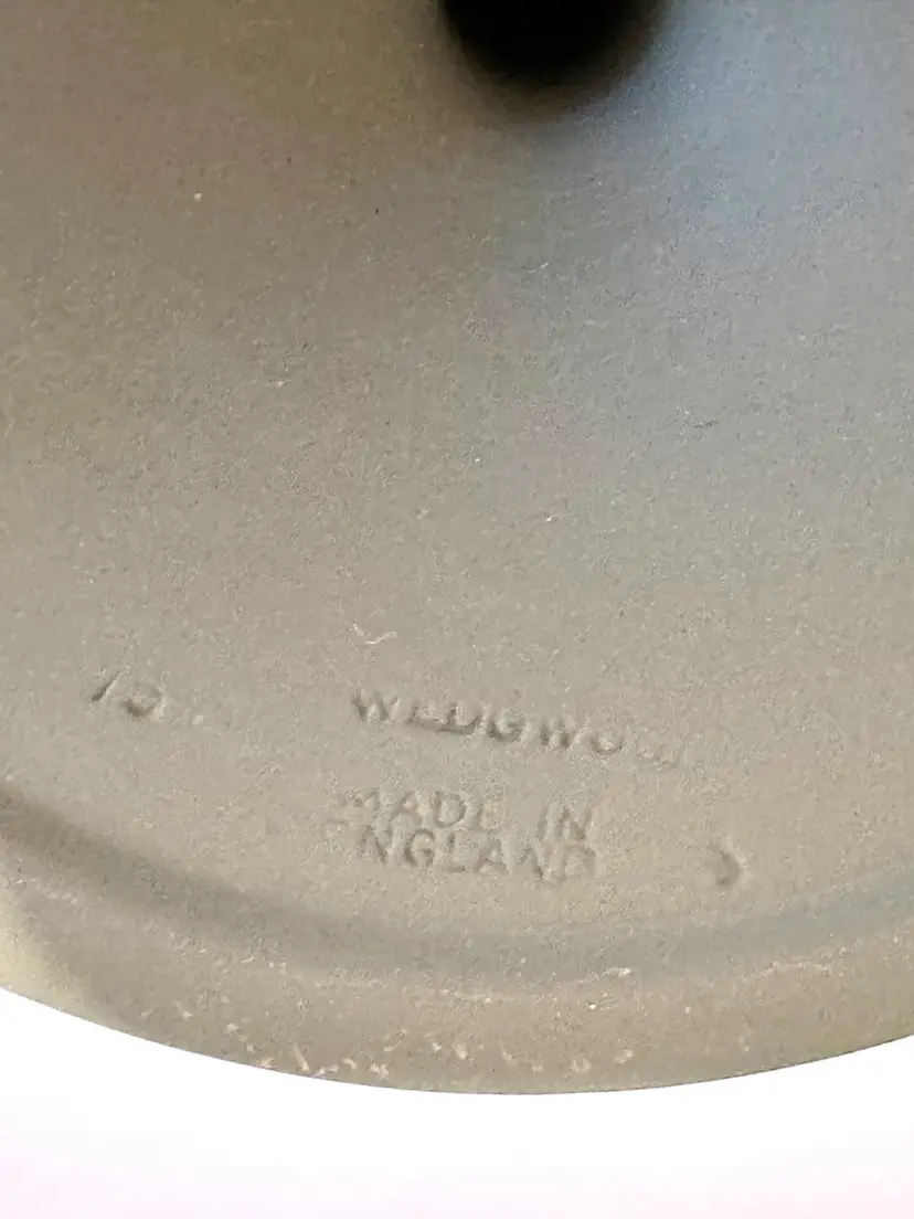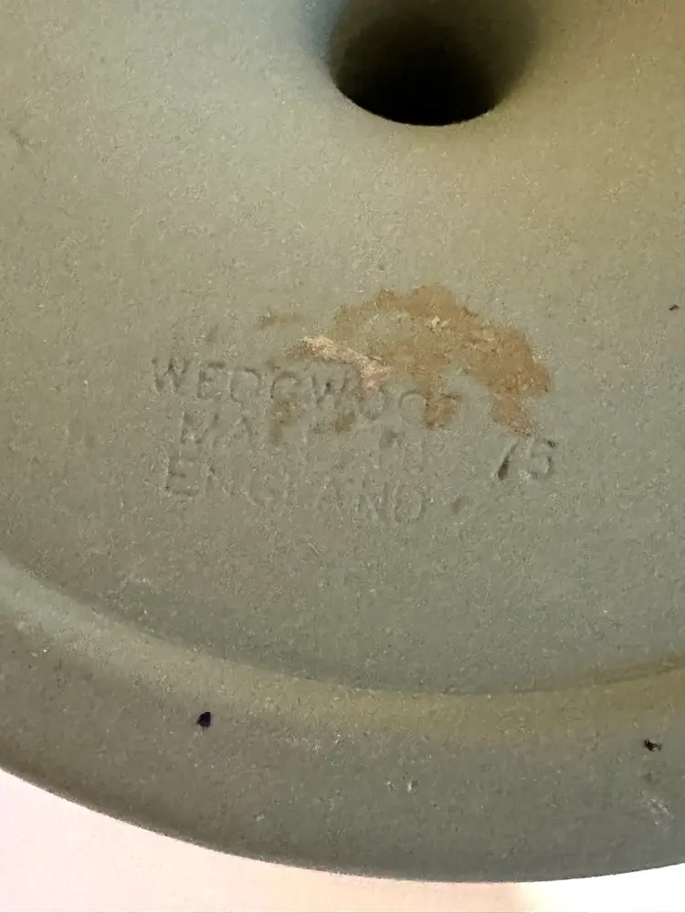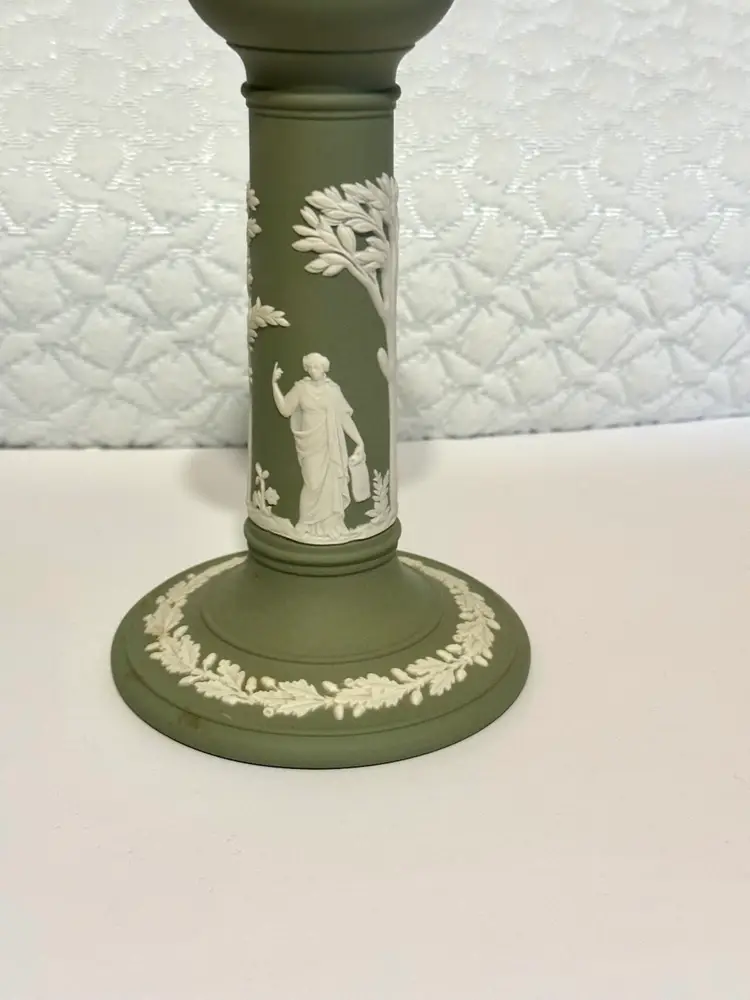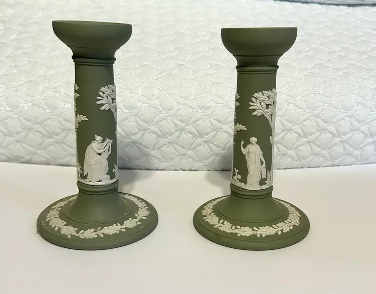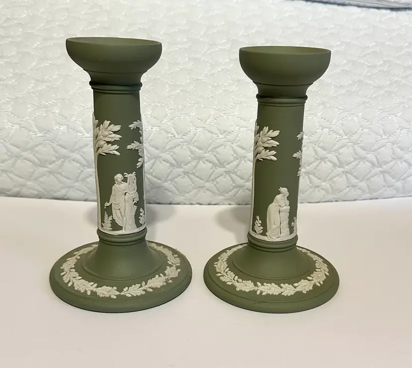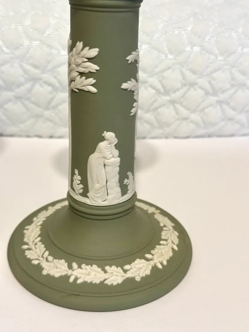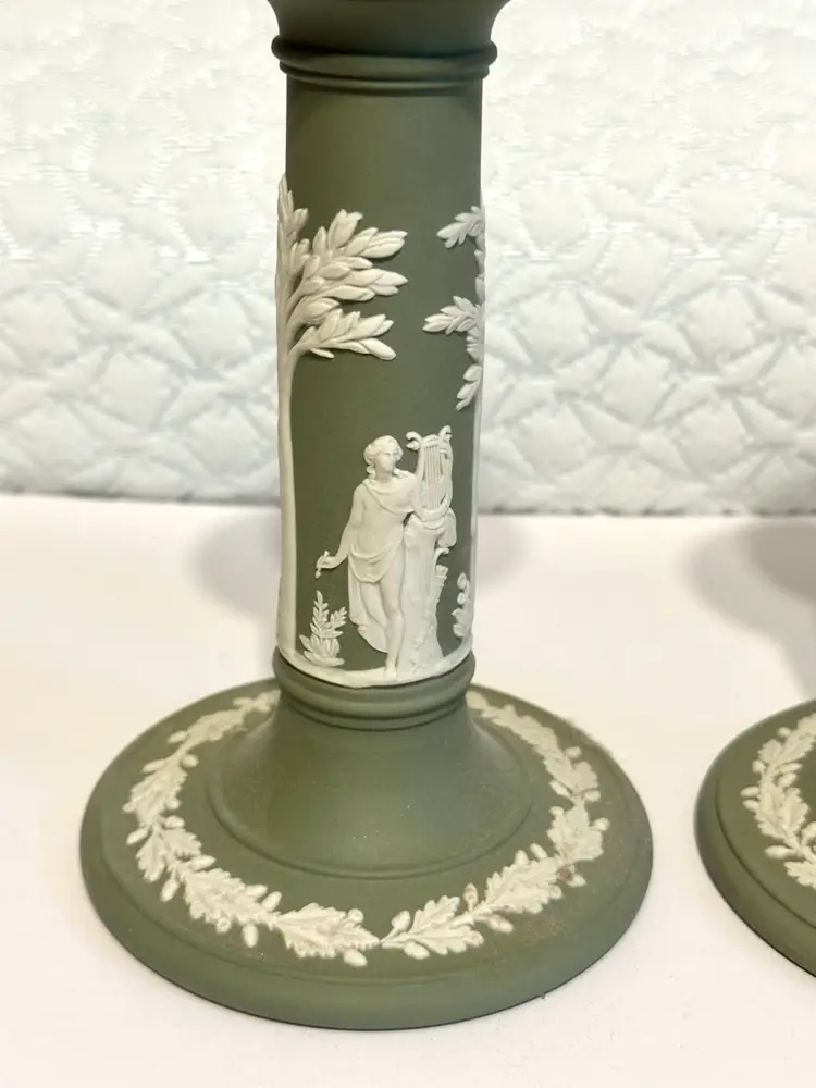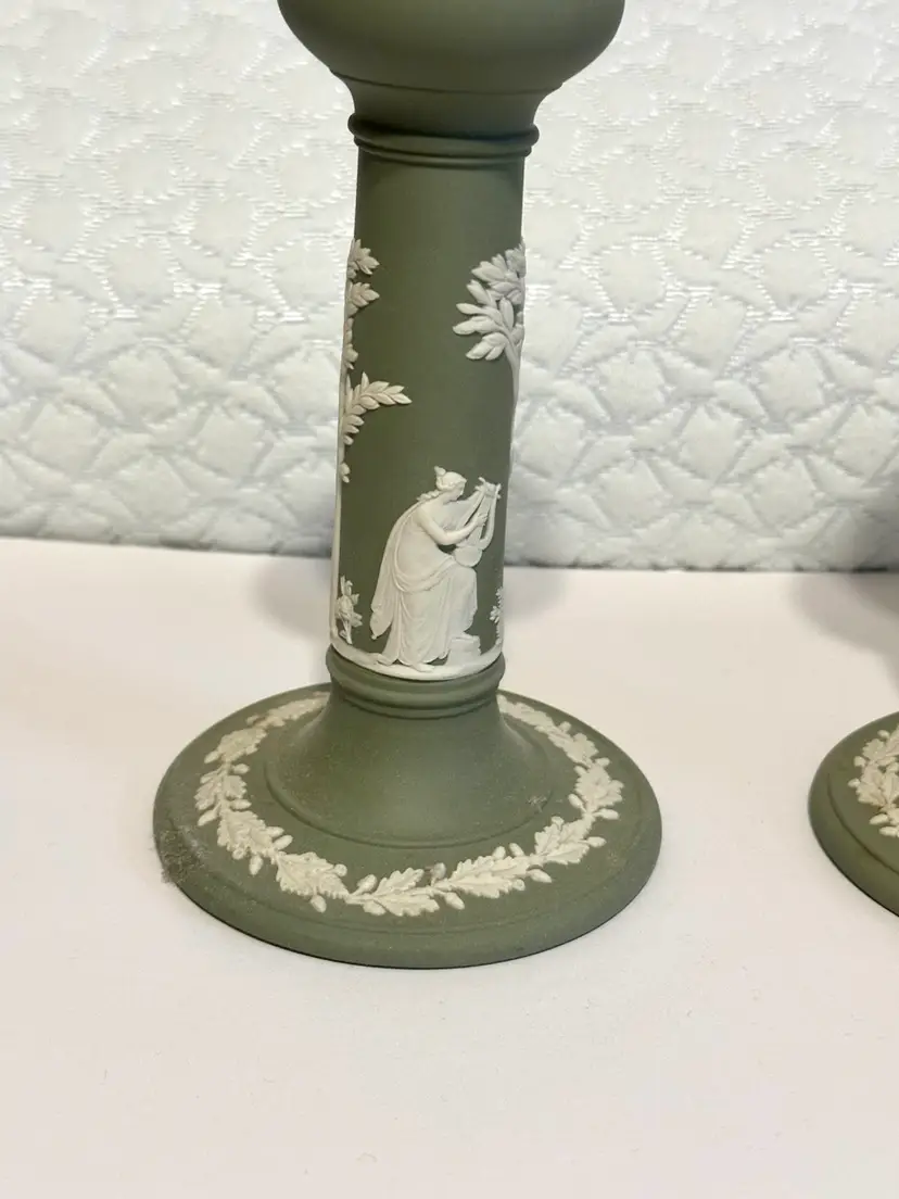 Lovely pair of Wedgwood candlesticks are green & white jasperware. They are 6.75” tall. They are in very good condition.