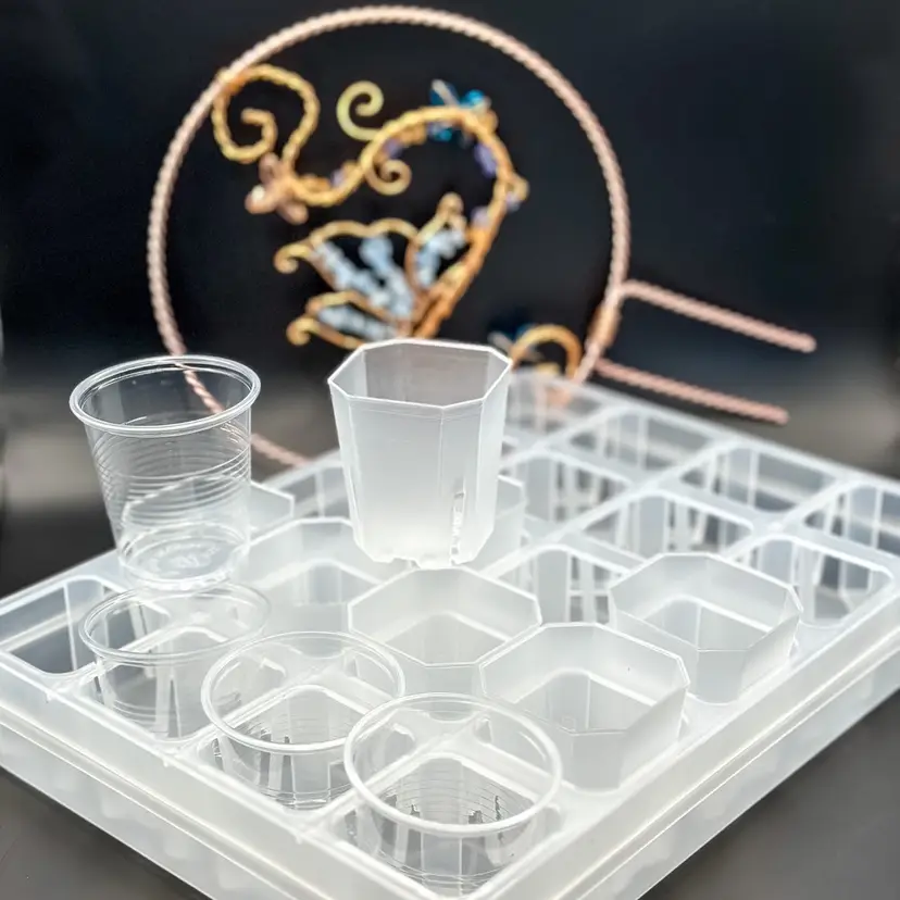 Includes 1 rack and tray. Fits 2 inch pots and 3 oz cups (NOT included)