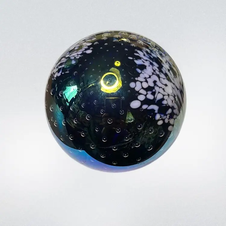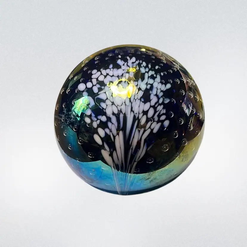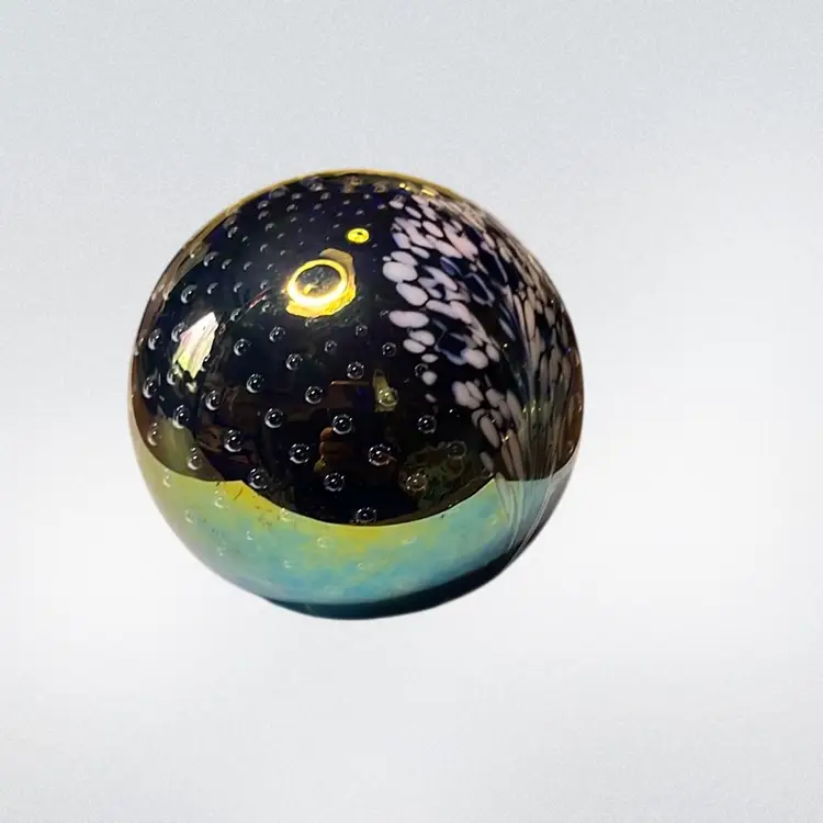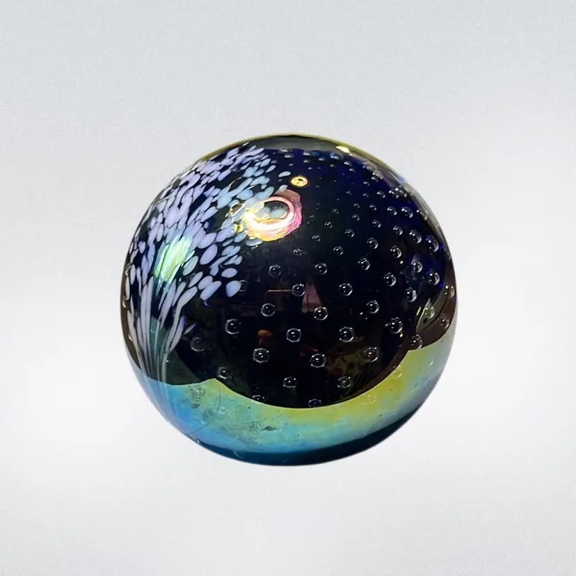20. Glass Eye Studio, 92”Iridescent Paperweight Multicolor Swirl Pattern Signed by Artist