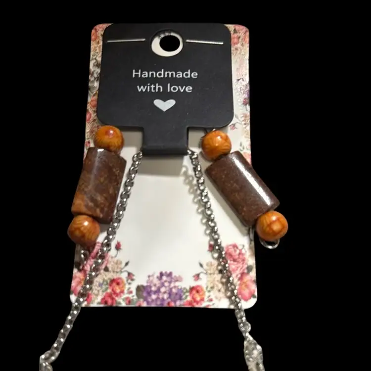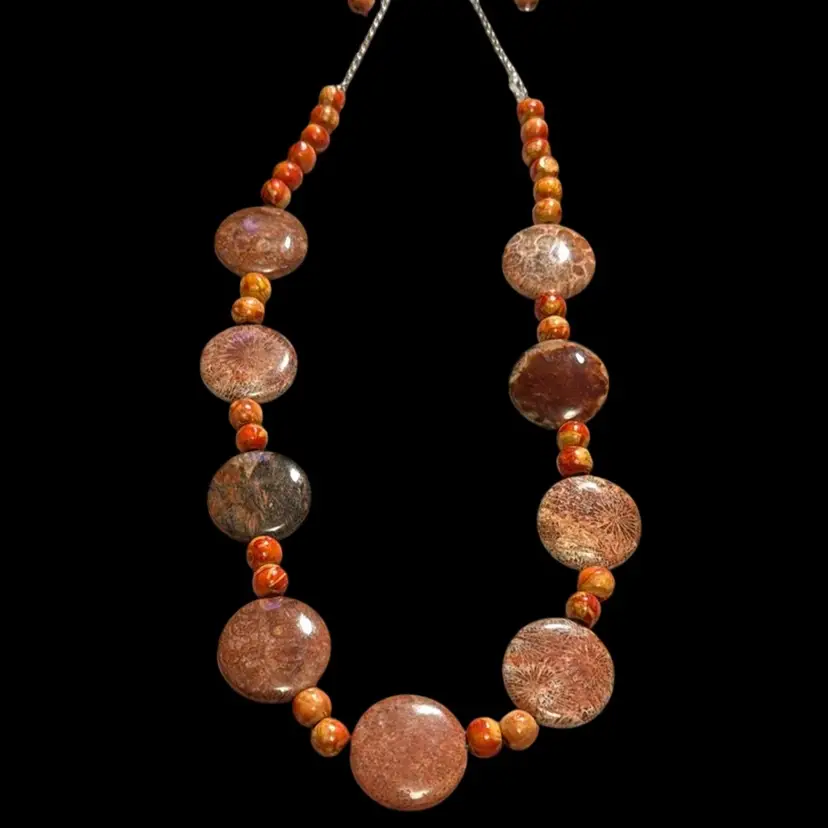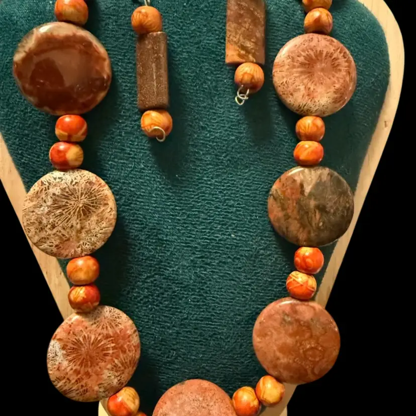 20 inch necklace with extender earring set Silvertone fossil coral and wood beads