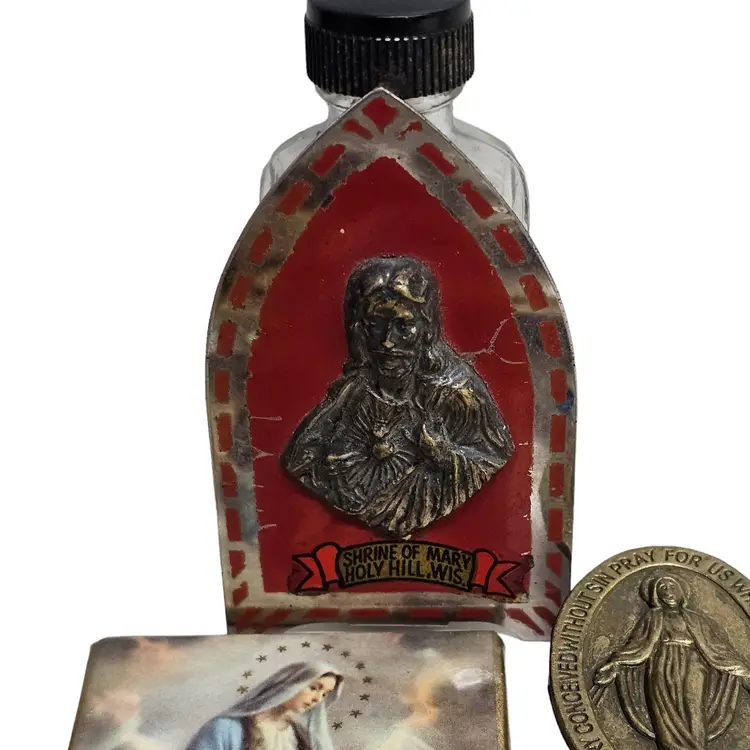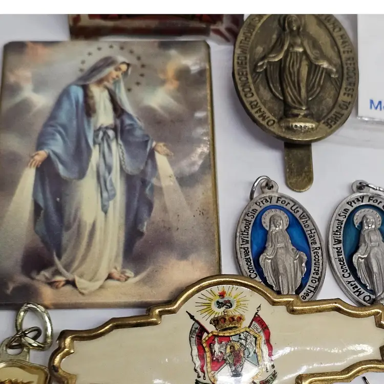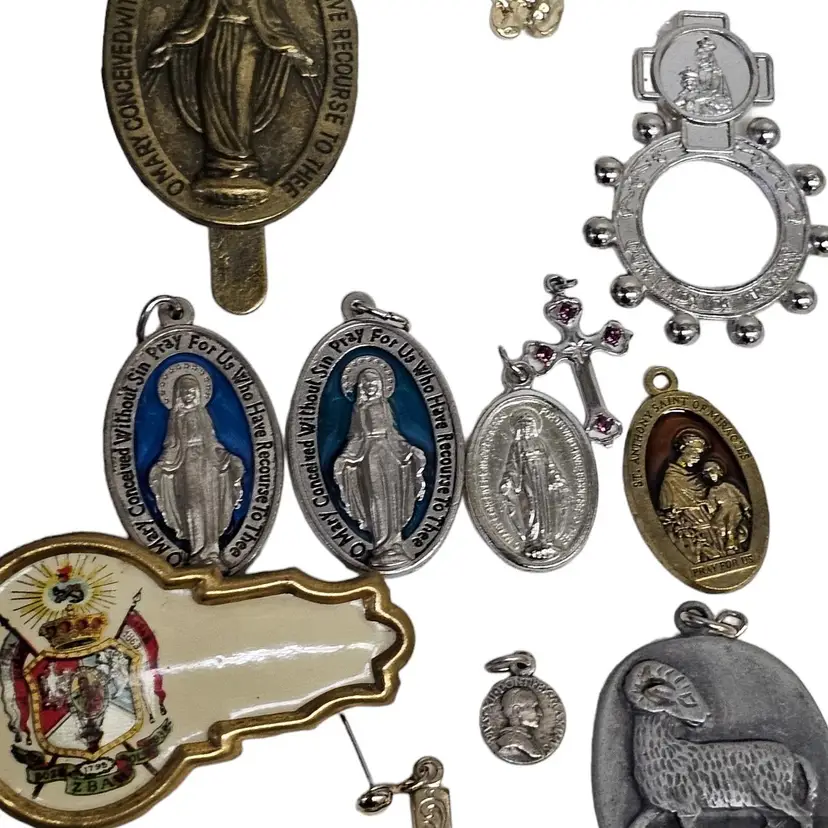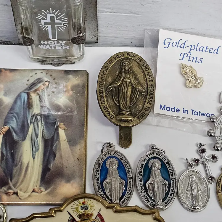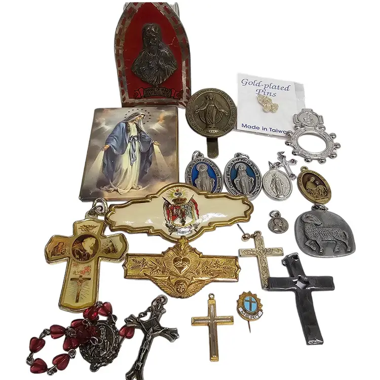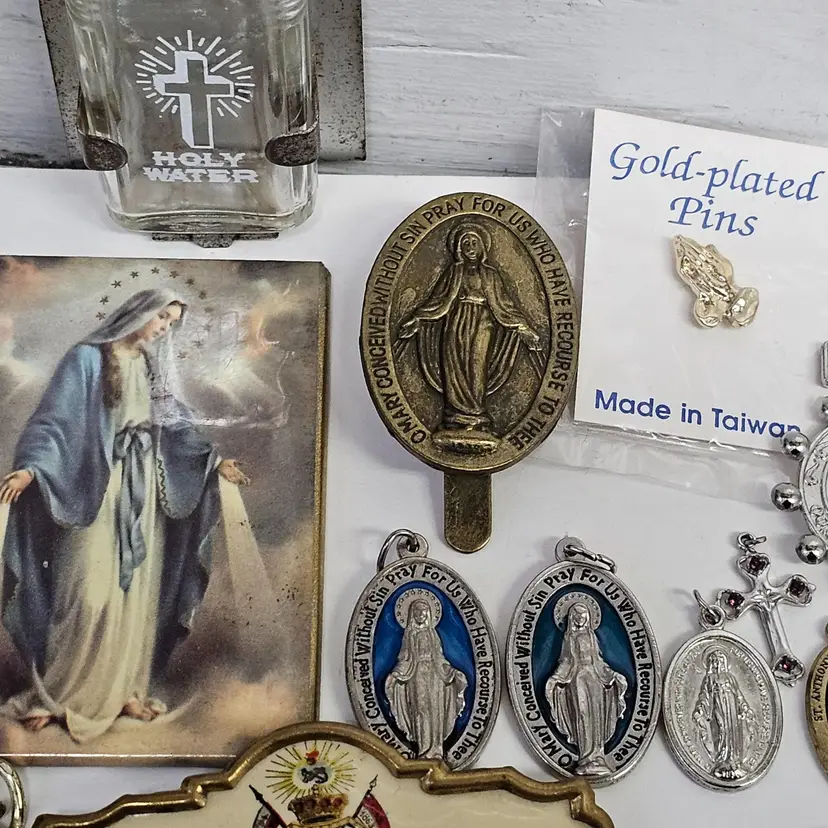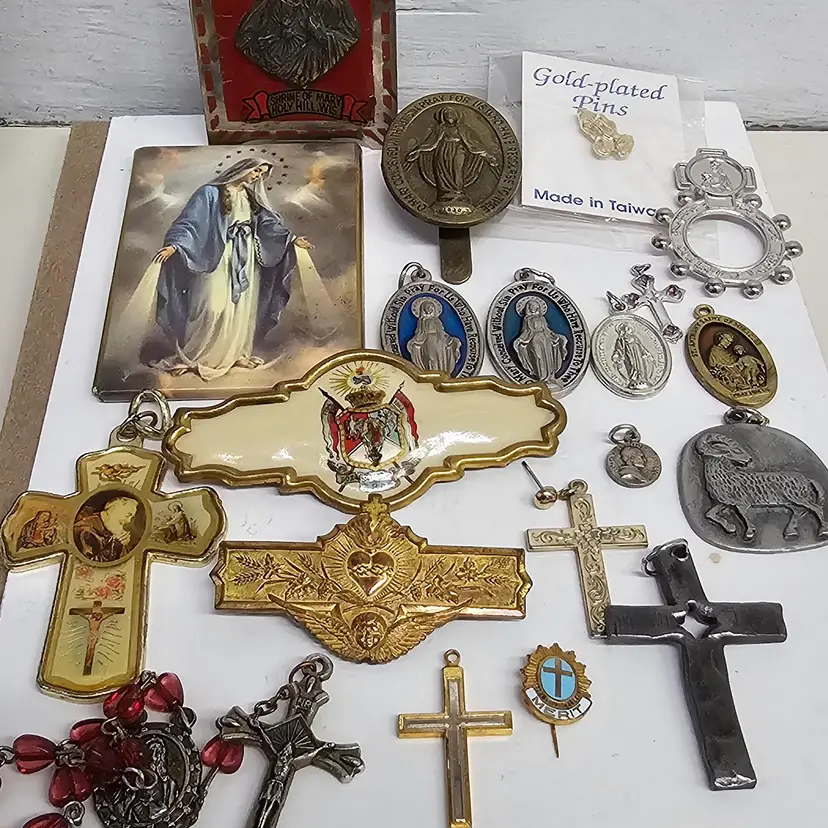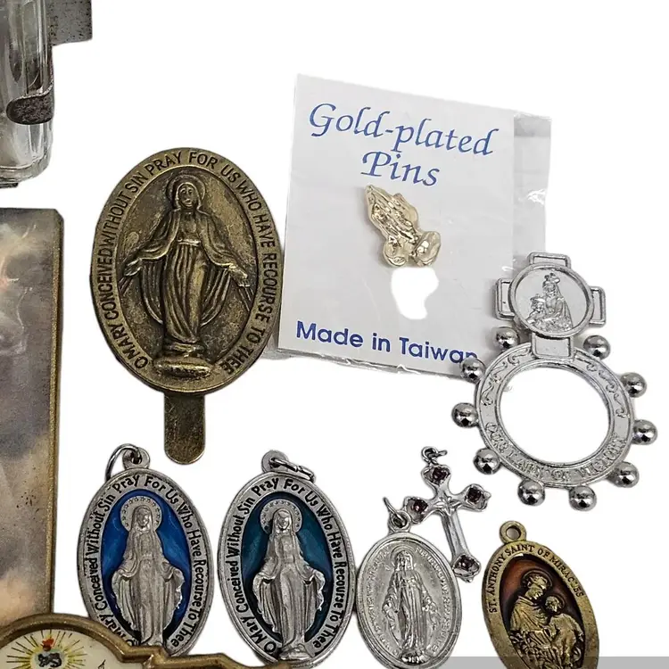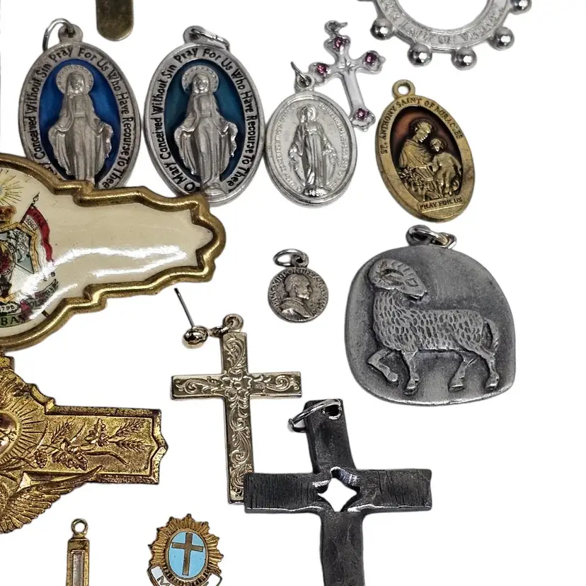 Nice arrangement of different religions pendant, pins, key chain, even Empty bottle of Holy Water! If you have any questions please feel free to contact me in the chat!!