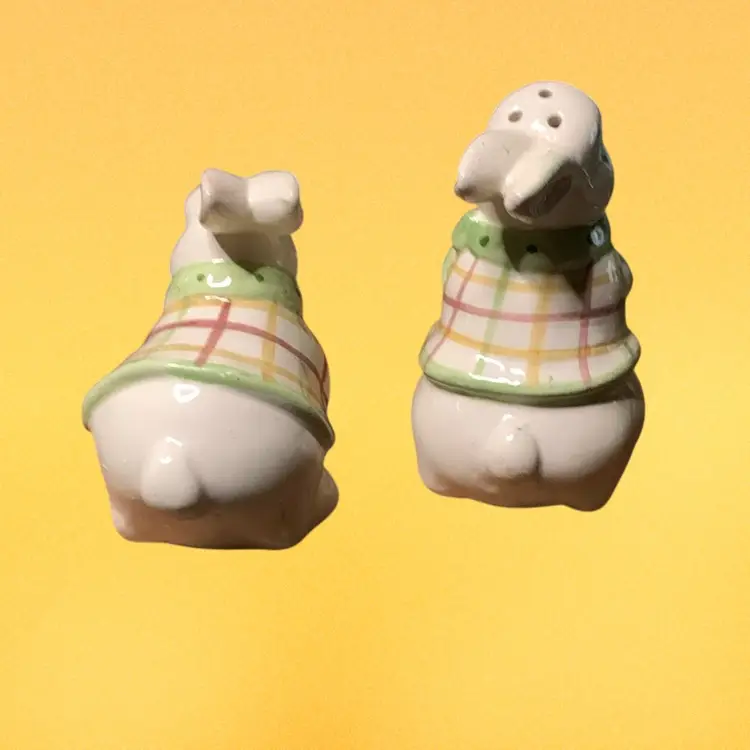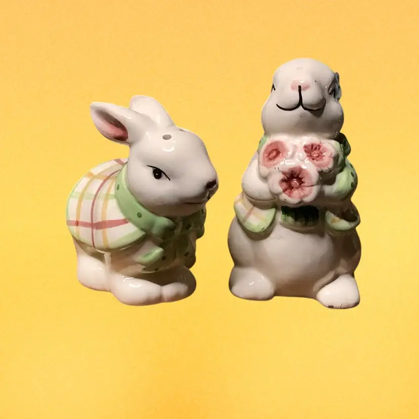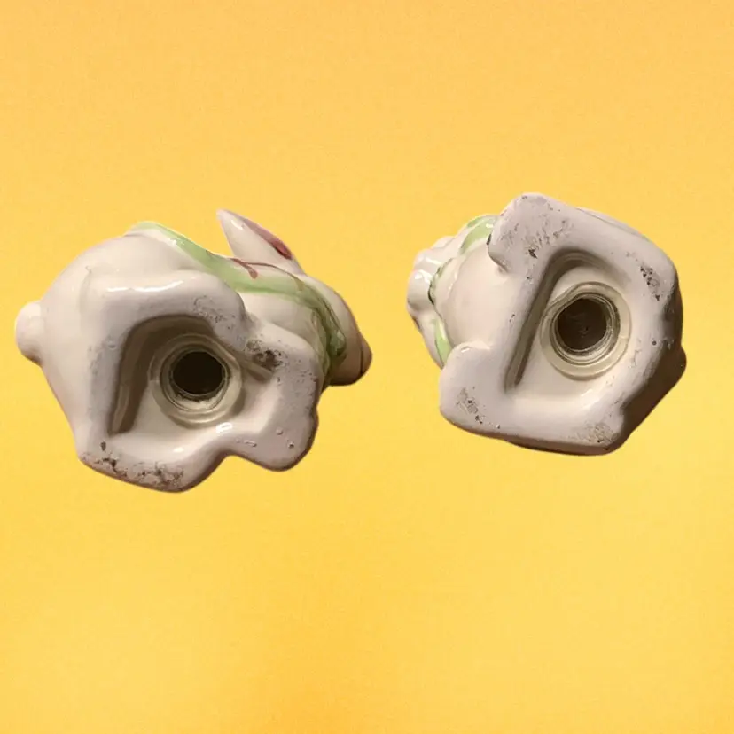 20a. Vintage Salt and Pepper White Rabbits Dressed Up For Dinner Made in Japan
