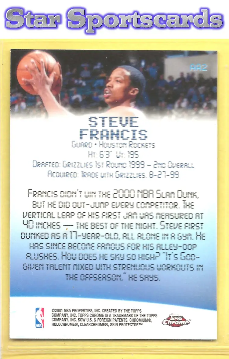 This is a nice example of a 2000-01 Topps Chrome #AA2 Steve Francis Aptitude for Altitude .Other important information about this card: In Steve Francis played for the Houston Rockets.Please check out our other listings for more great cards.