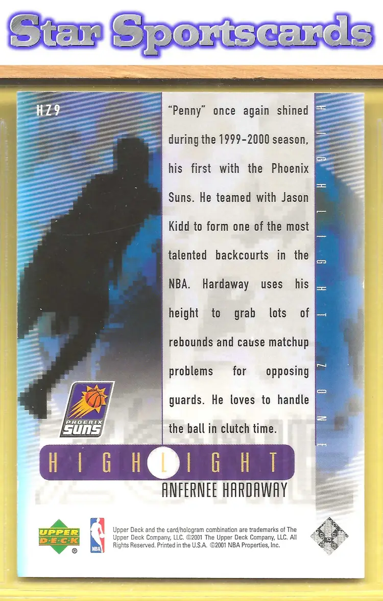 This is a nice example of a 2000-01 Upper Deck #HZ9 Anfernee Hardaway Highlight Zone .Other important information about this card: In Anfernee Hardaway played for the Phoenix Suns.Please check out our other listings for more great cards.