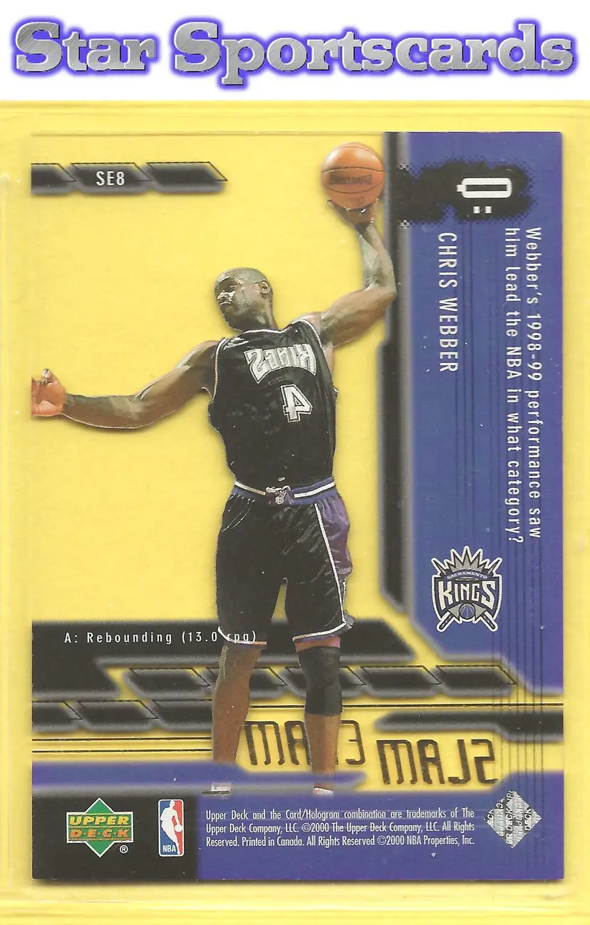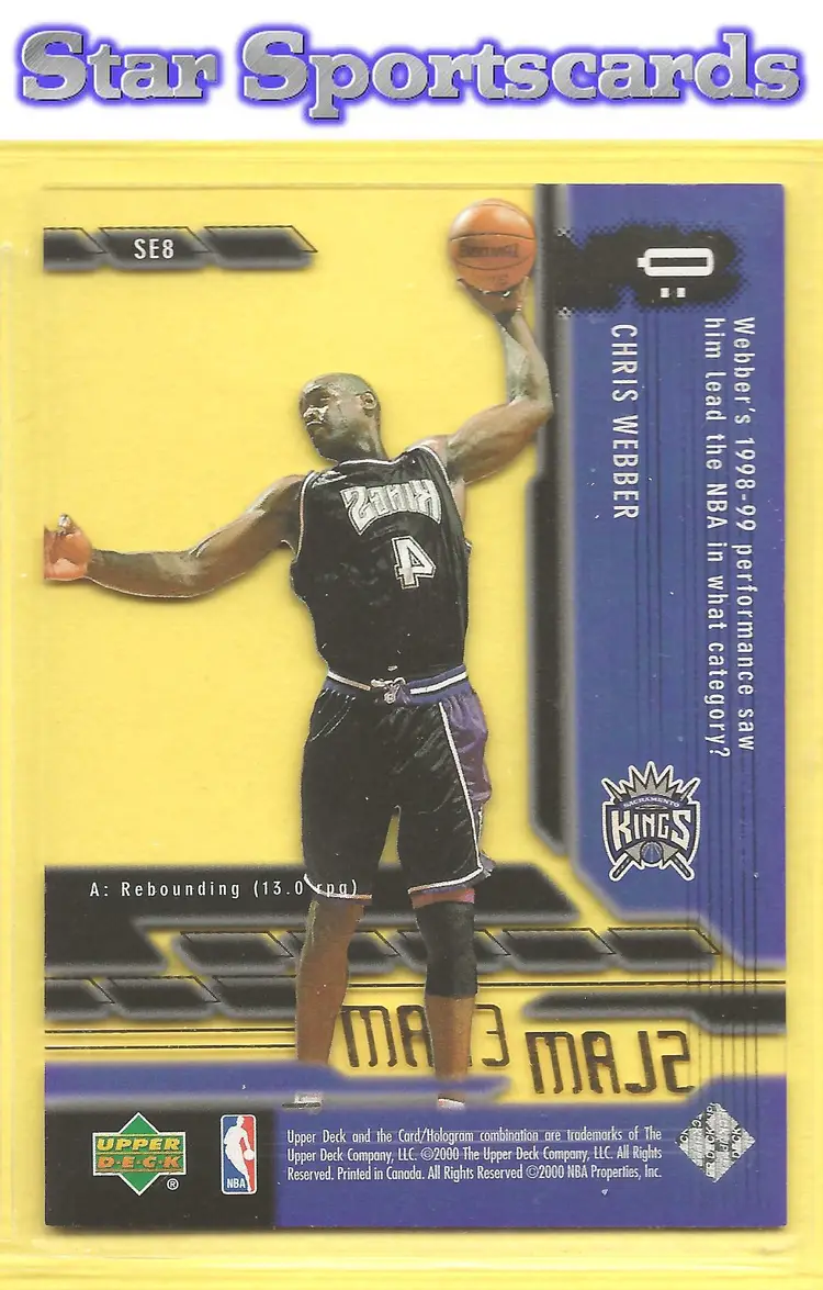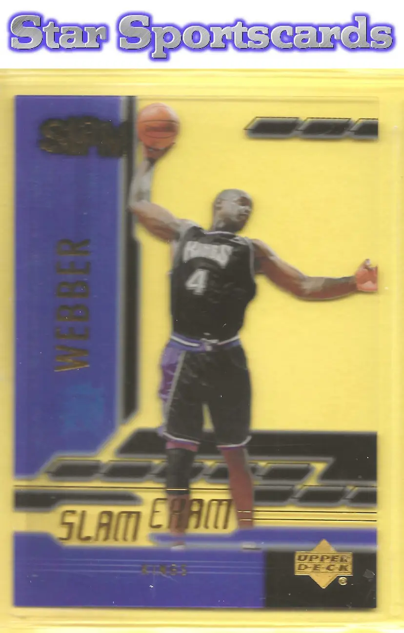 This is a nice example of a 2000-01 Upper Deck Slam #SE8 Chris Webber Slam Exam .Other important information about this card: In Chris Webber played for the Sacramento Kings.Please check out our other listings for more great cards.