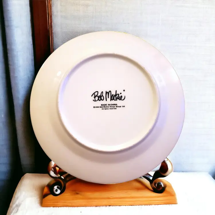 Gorgeous Salad Dessert Plate made by Bob Mackie Designs in 2000 as a part of the Fruit and Ribbons collection. This 8" plate features a design of vibrant colored fruits and green ribbon around the rim, all lined with gold. No chips, cracks, or any signs of wear. Plate holder NOT included.