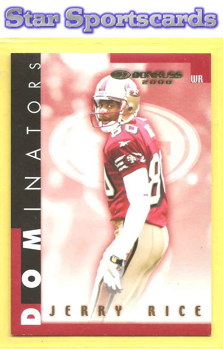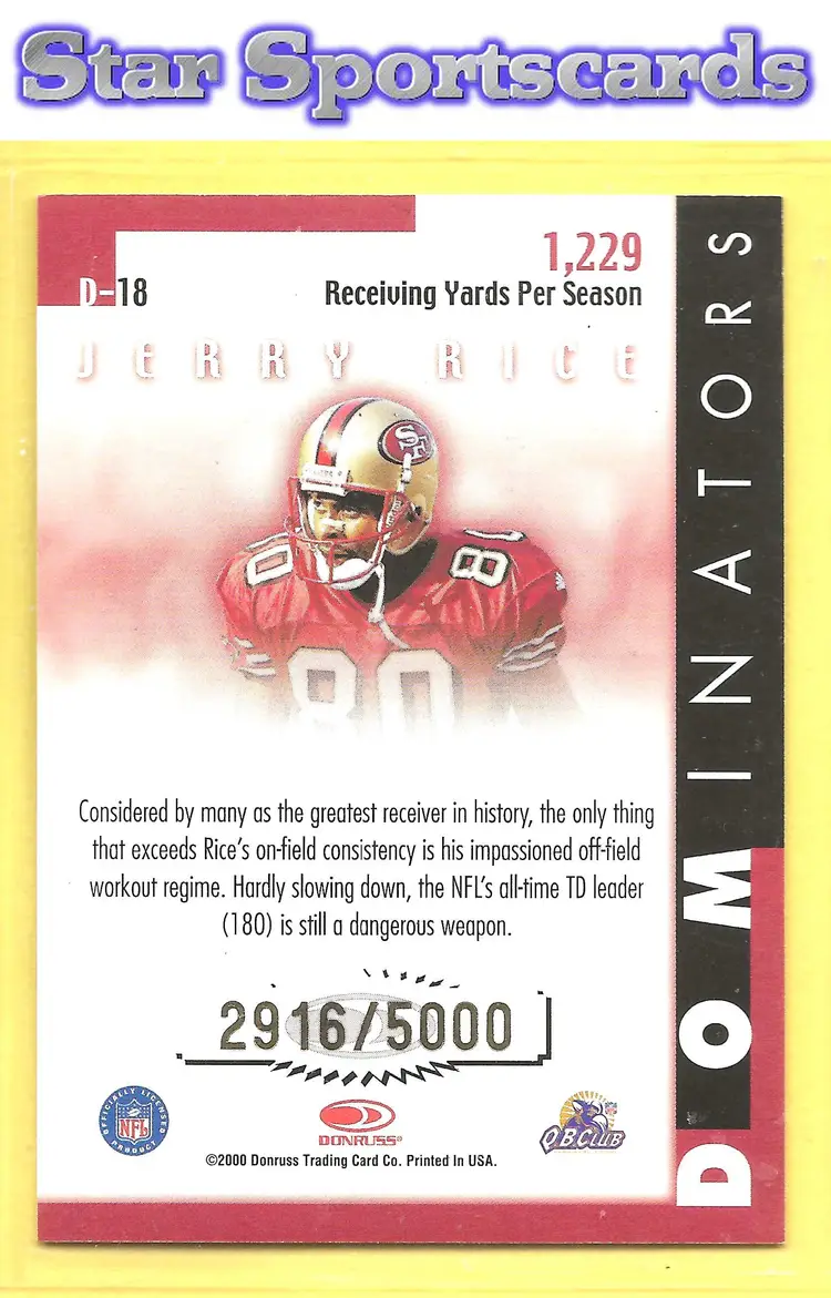 This is a nice example of a 2000 Donruss #D-18 Jerry Rice Dominators #/5000 .Other important information about this card: SN In Jerry Rice played for the San Francisco 49ers.Please check out our other listings for more great cards.