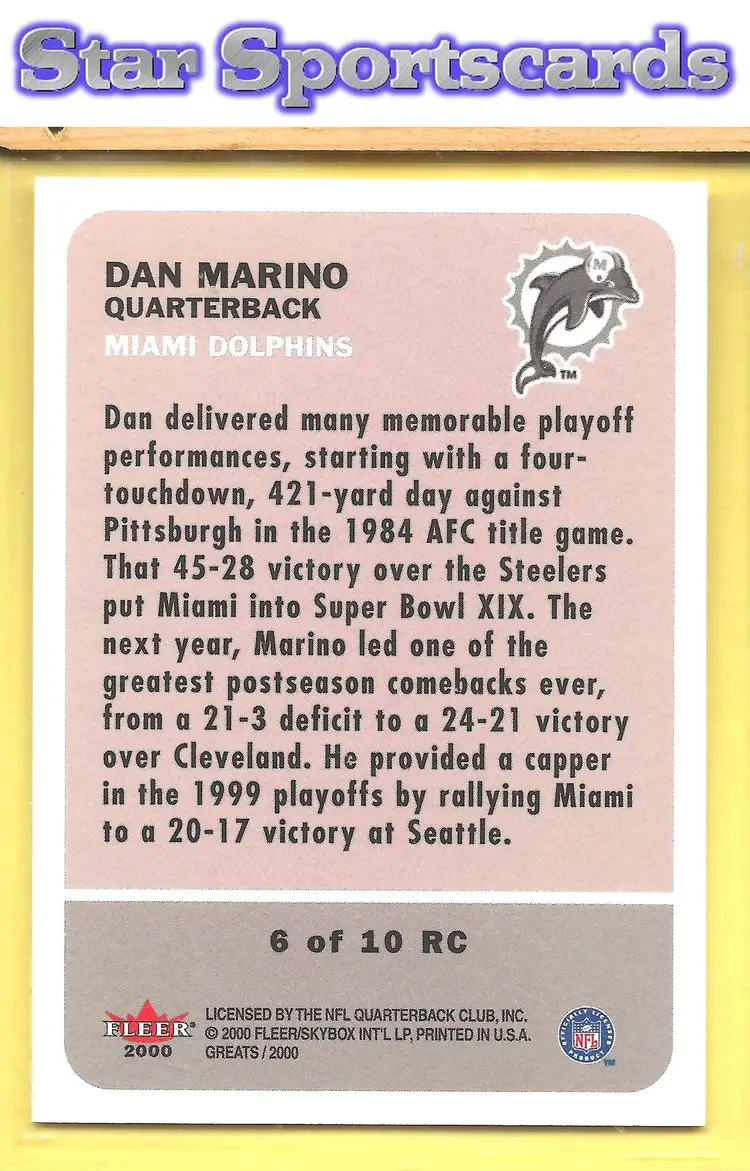 This is a nice example of a 2000 Fleer Greats of the Game #6RC Dan Marino Retrospection Collection .Other important information about this card: In Dan Marino played for the Miami Dolphins.Please check out our other listings for more great cards.