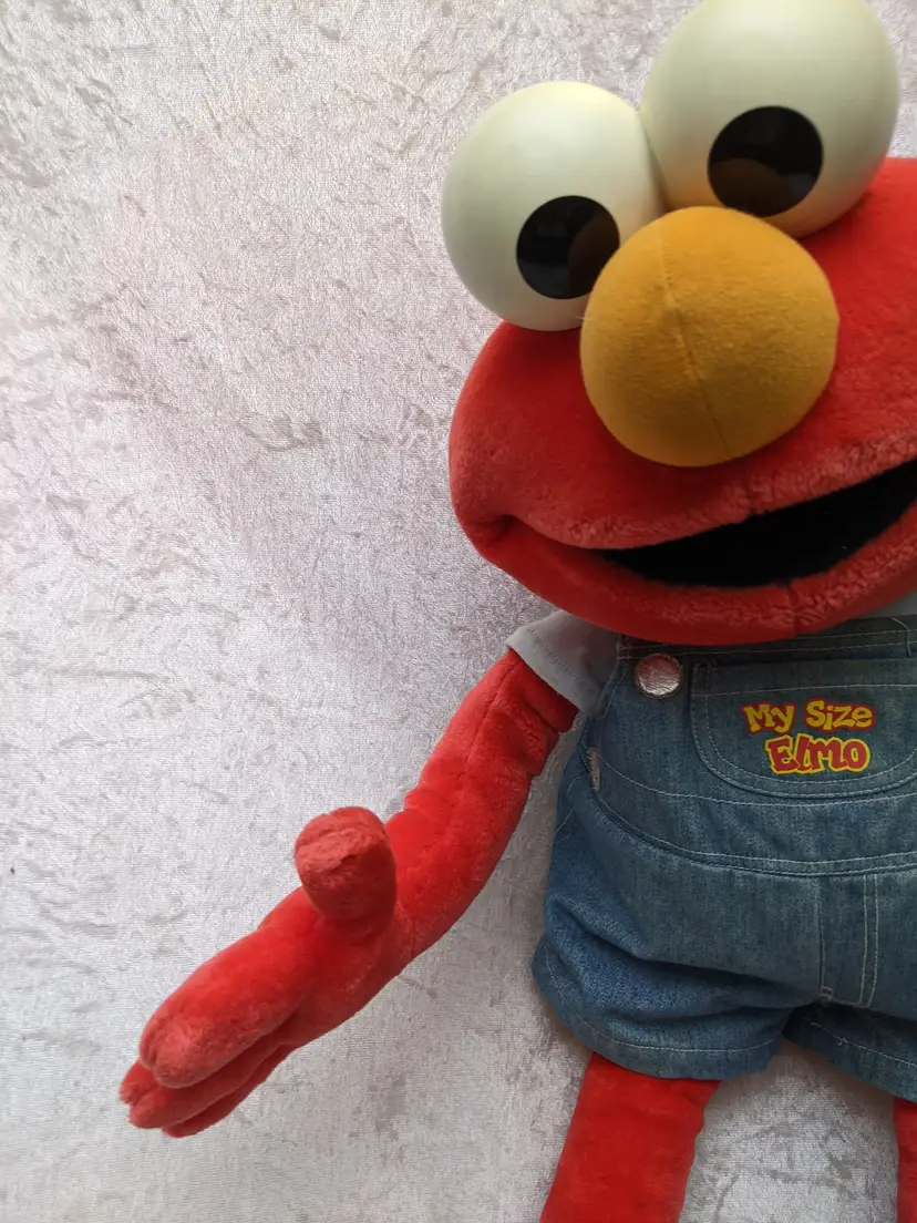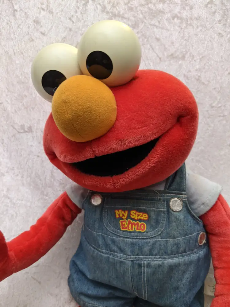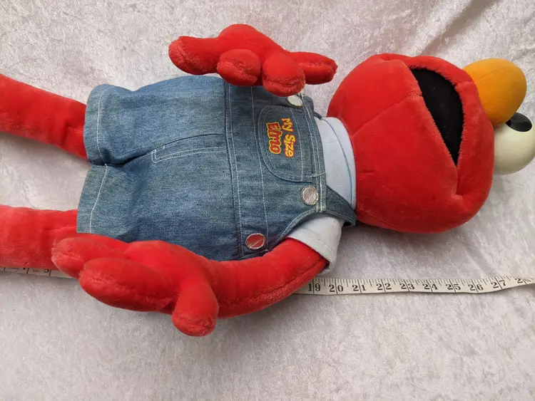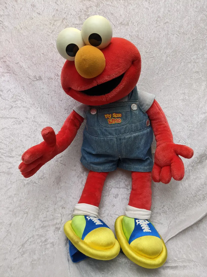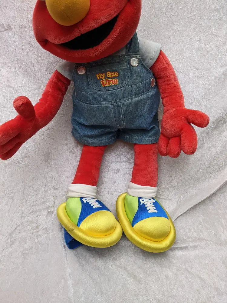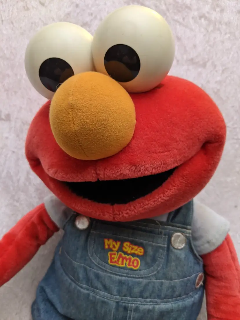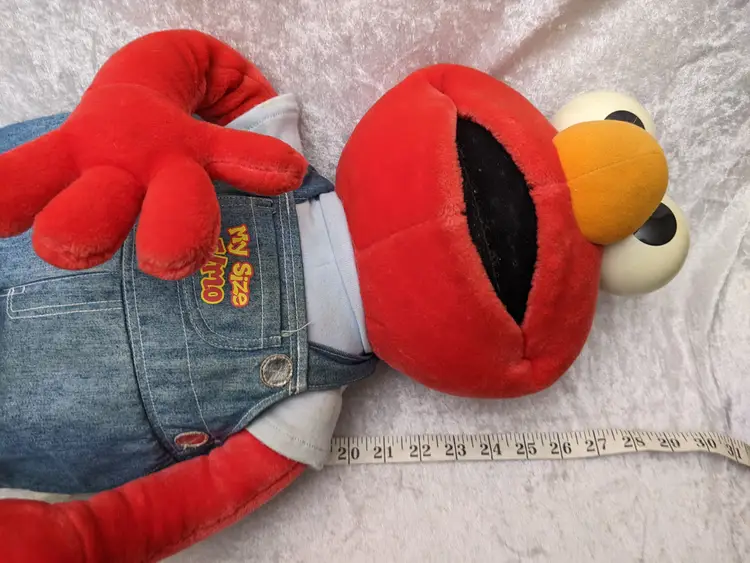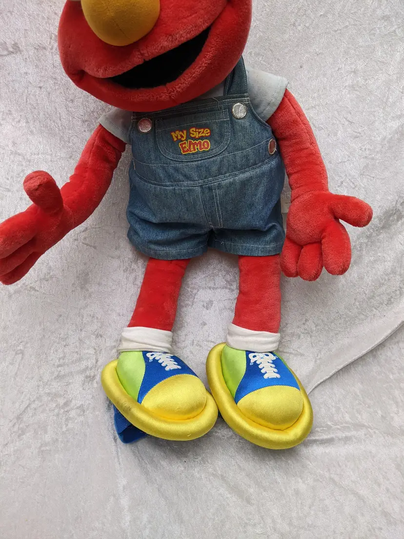 VTG 2000 My Size Elmo Fisher Price singing Talking Plush Toy Sesame Street 28” Works He sing Ring Around the Rosie, Asking the child to dance with him super cute. There is a place on the bottom of his shoes to put the child's foot. Very good condition Works talks and sings .He is a little faded and has wear on the shoe straps , and around his mouth. .Battery compartment is clean . no weird smells. Please check the photos for details. Comes from a smoke free home. We do have pets. It is kept away from them,