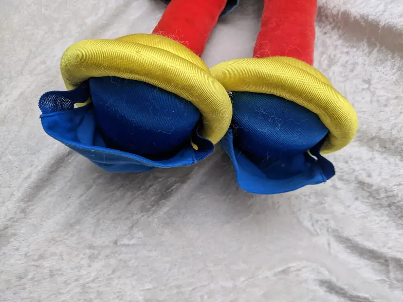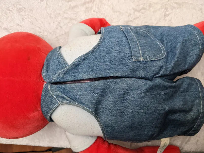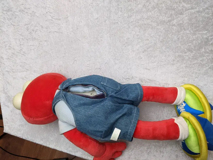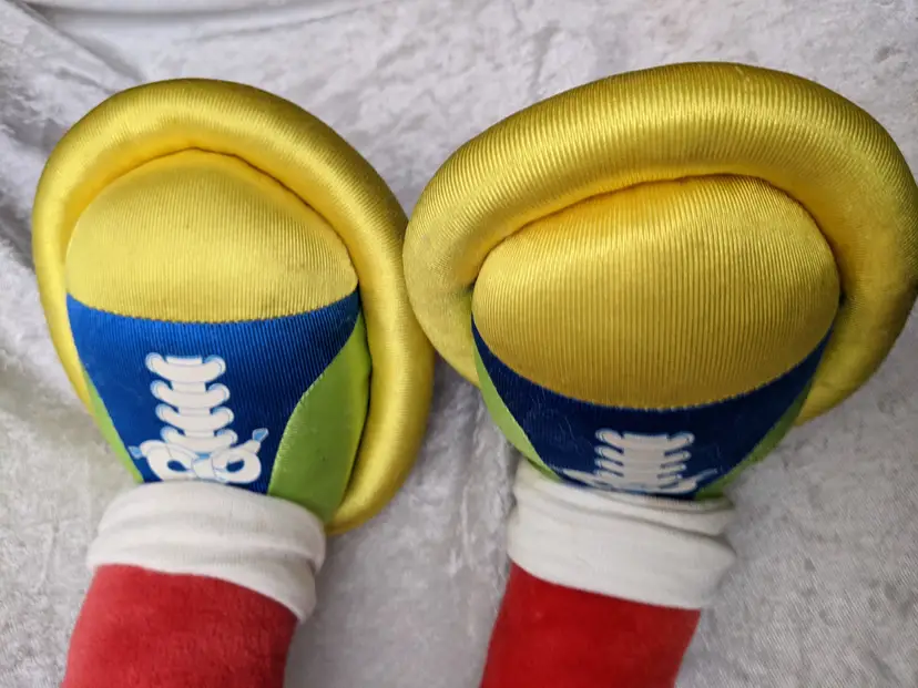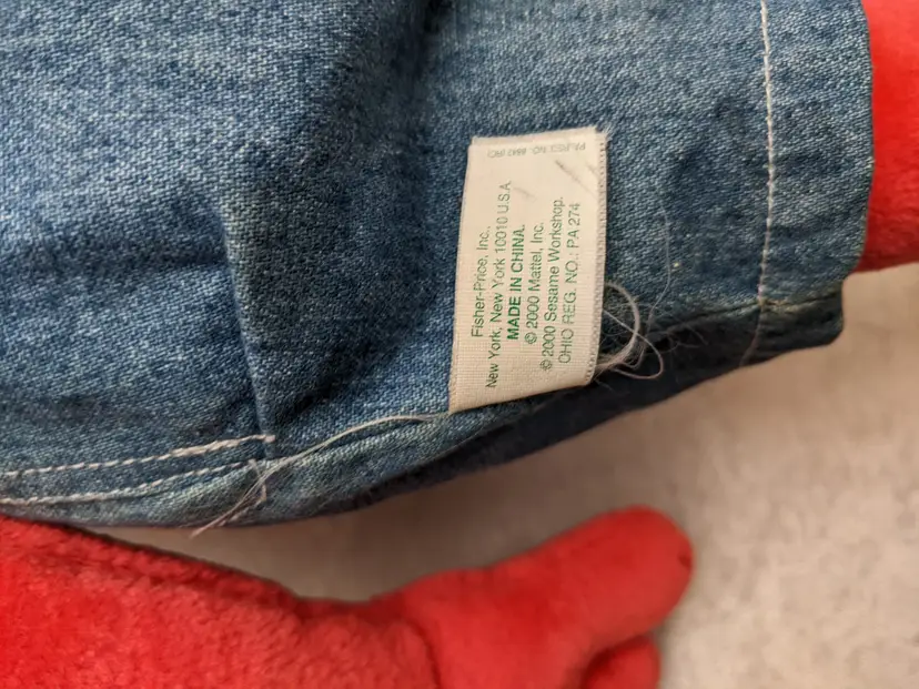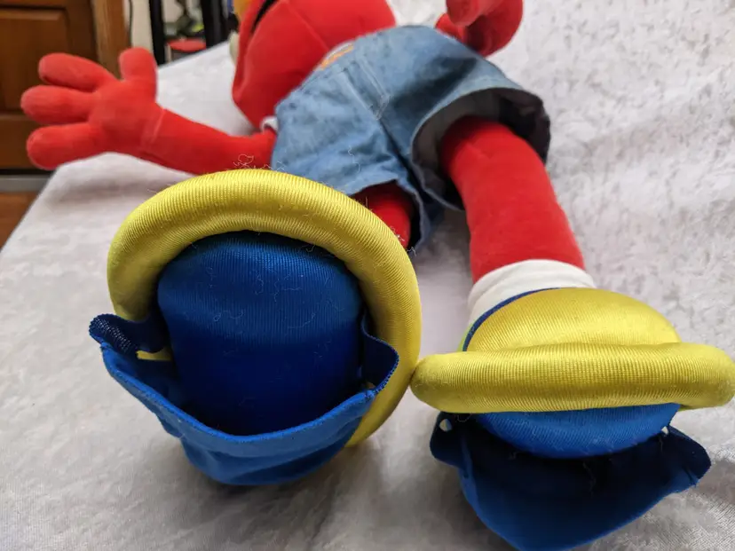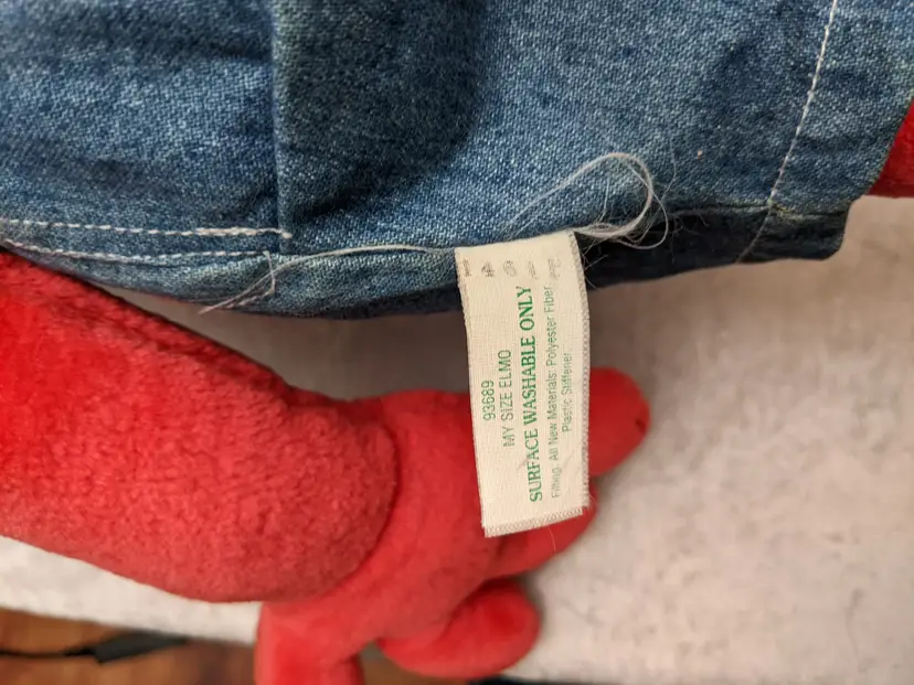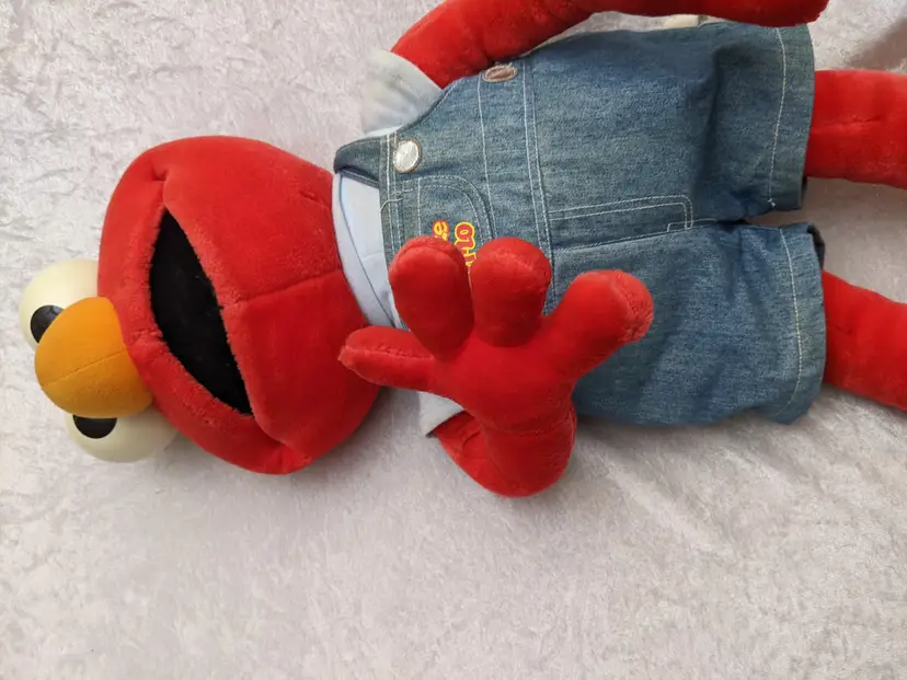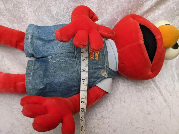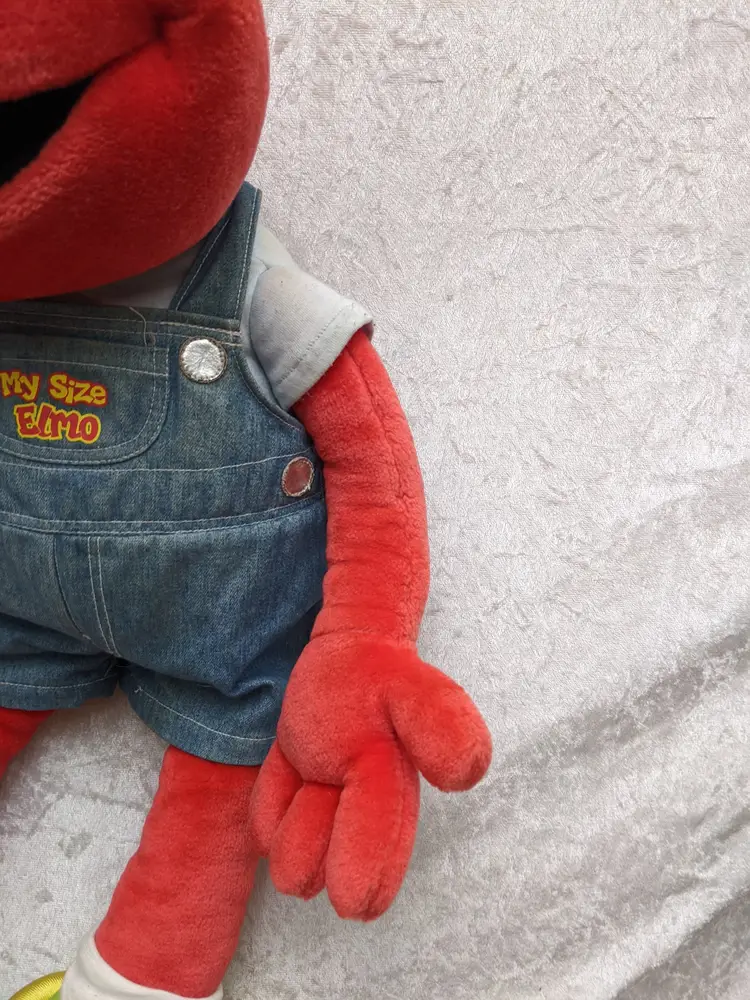 VTG 2000 My Size Elmo Fisher Price singing Talking Plush Toy Sesame Street 28” Works He sing Ring Around the Rosie, Asking the child to dance with him super cute. There is a place on the bottom of his shoes to put the child's foot. Very good condition Works talks and sings .He is a little faded and has wear on the shoe straps , and around his mouth. .Battery compartment is clean . no weird smells. Please check the photos for details. Comes from a smoke free home. We do have pets. It is kept away from them,