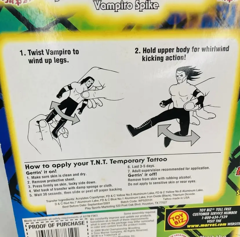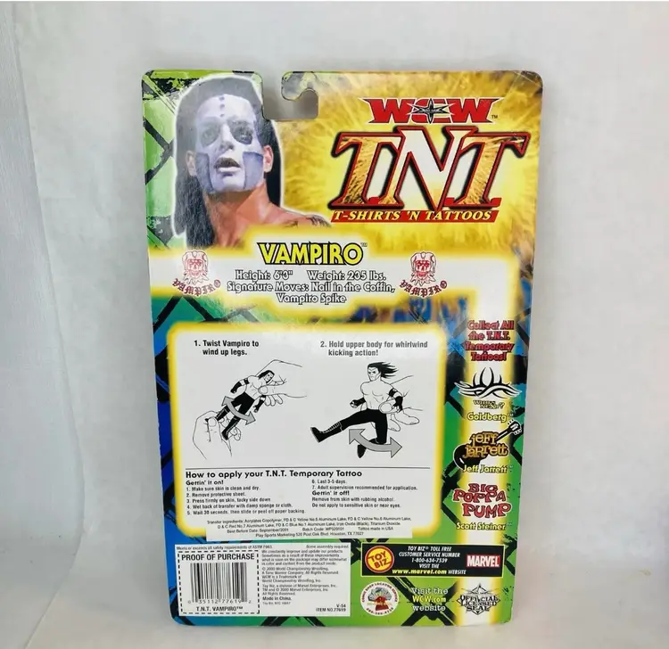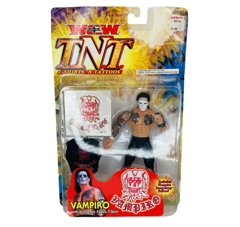 Super cool Vampiro WCW TNT T-Shirts and Tattoos action figure set with authentic fabric Tshirt and temporary tattoo! He has whirlwind kicking action!