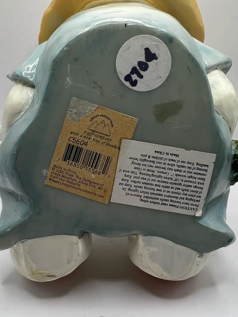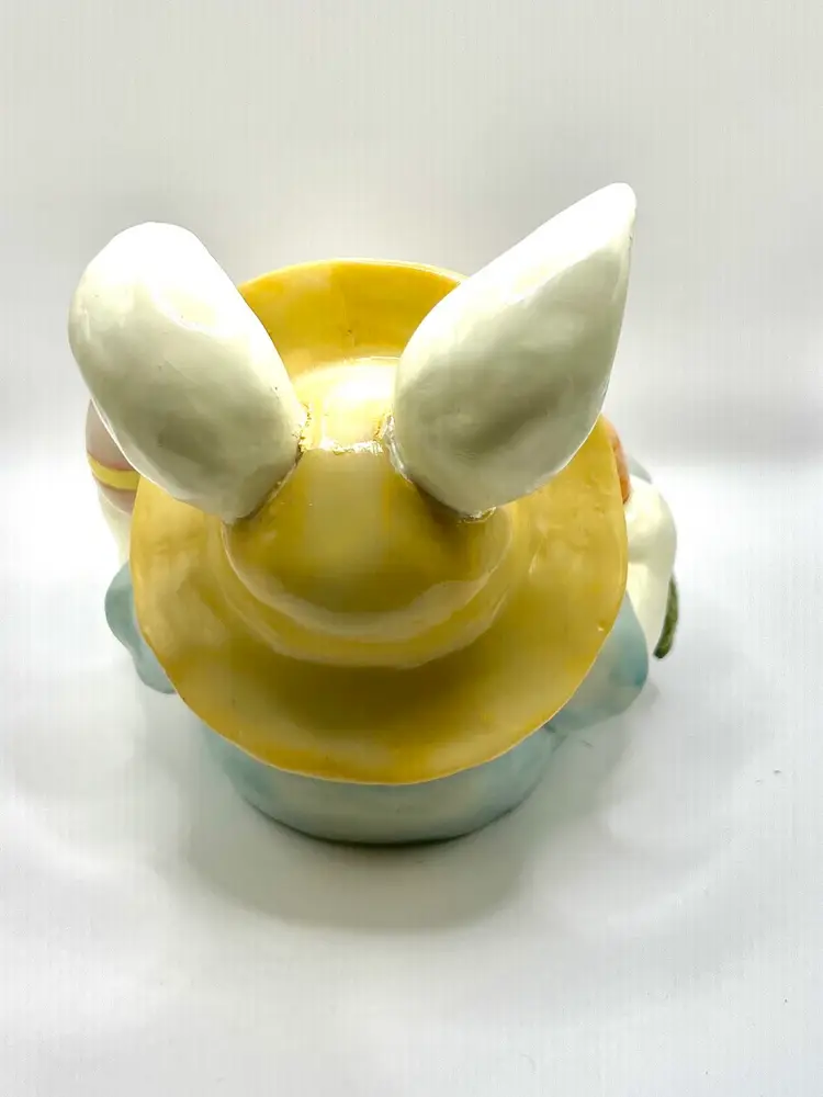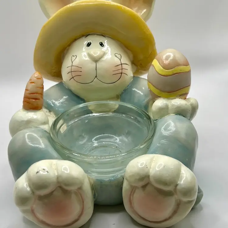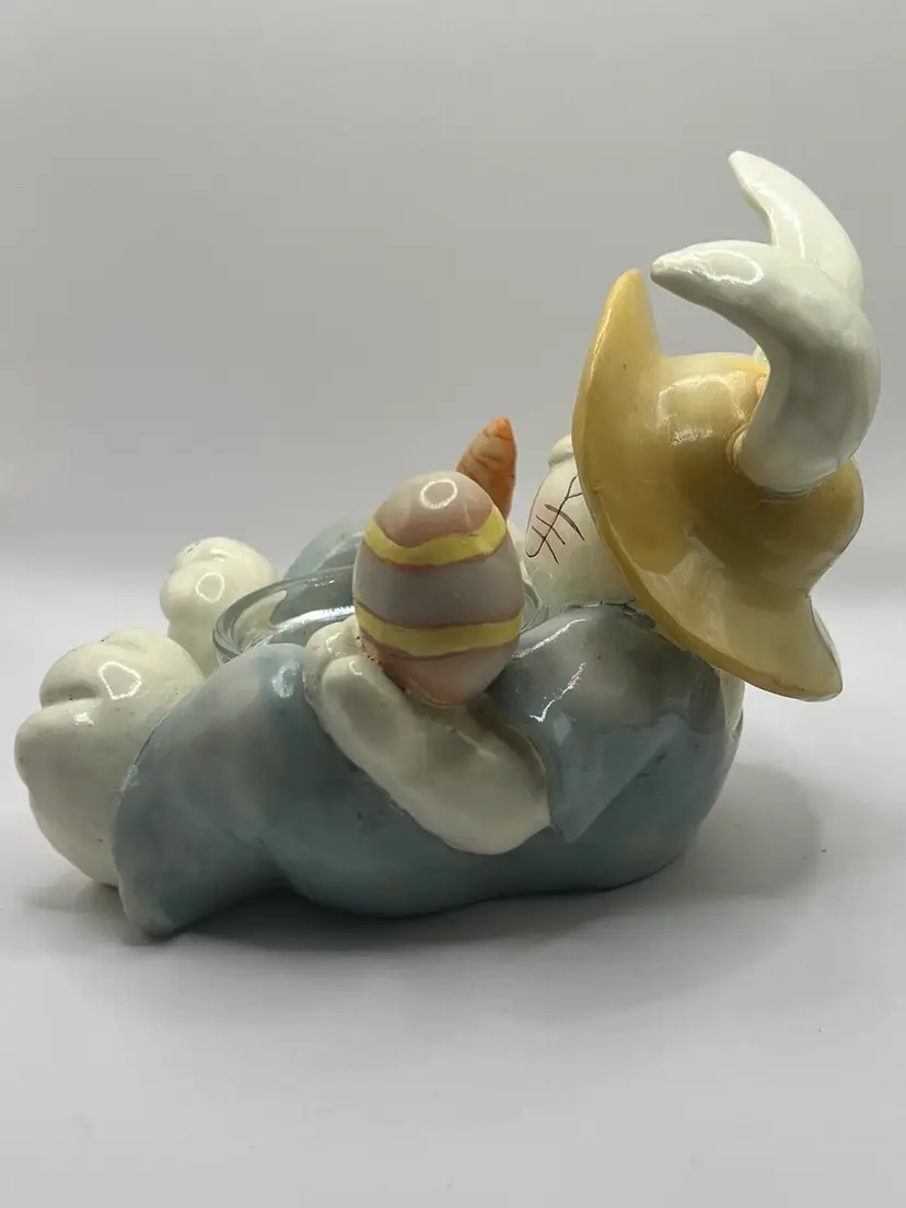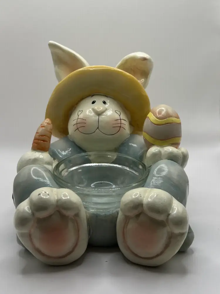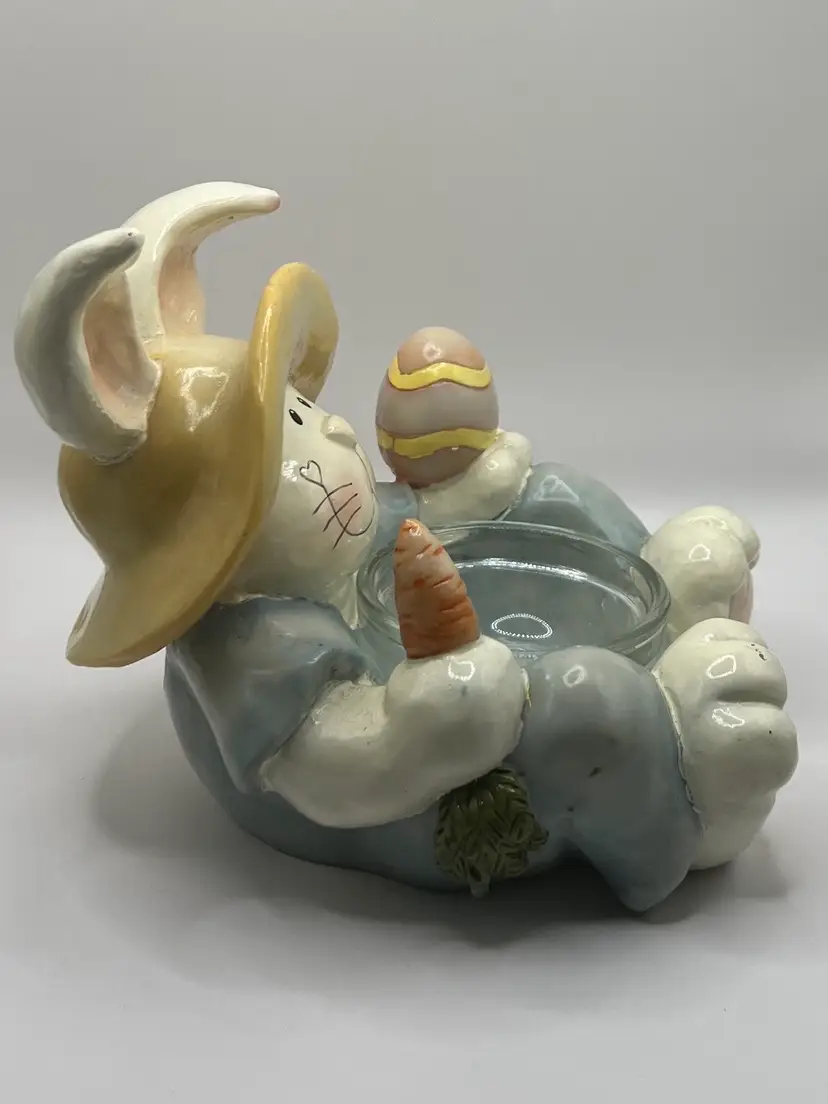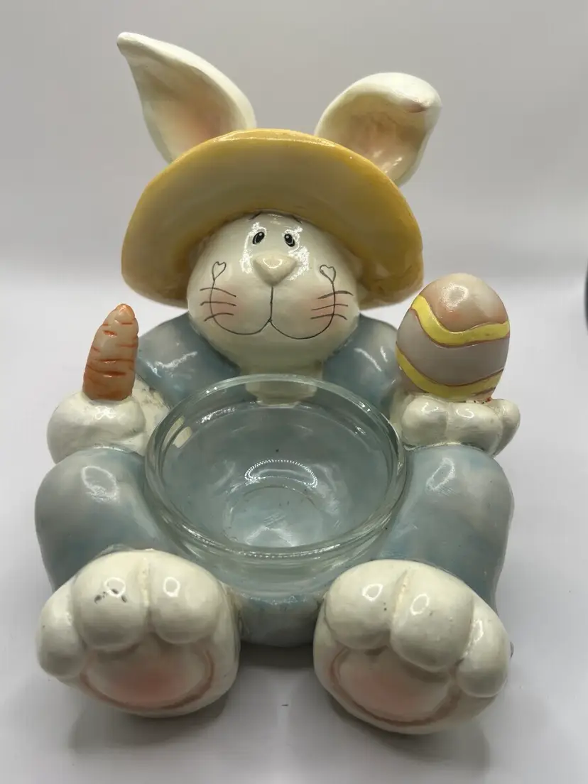 Super sweet Easter bunny that I believe is a plaster or resin material. It is not hollow and has good weight to it. Made by Crazy Mountain Gift Company. 4.5” tall 4.5” wide