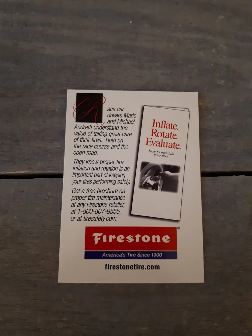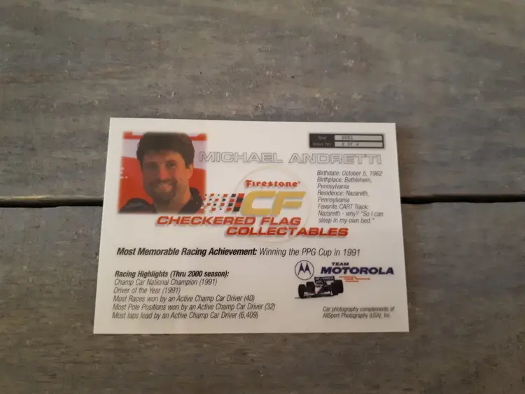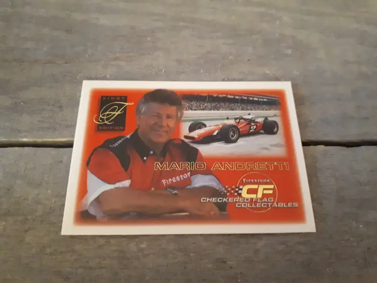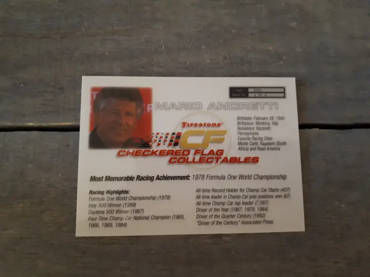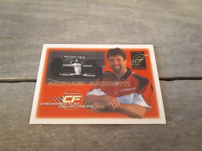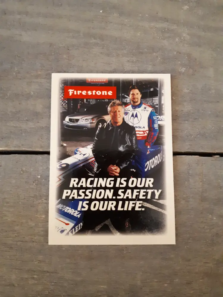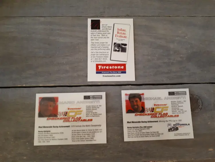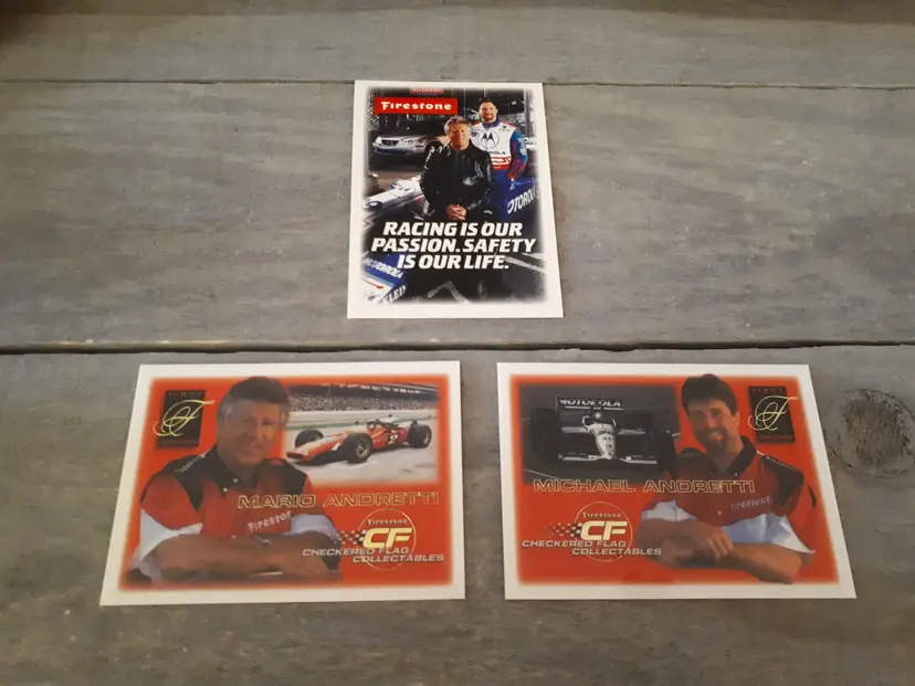 This set of 3 trading cards feature the iconic Mario and Michael Andretti, legends of the Indy racing world. The cards are officially licensed by Firestone Checkered Flag Collectables and are a must-have for any racing fan. In excellent vintage condition.
