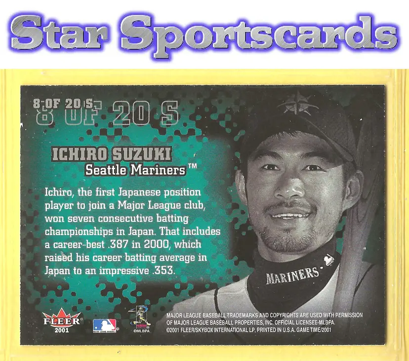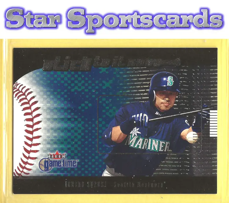 This is a nice example of a 2001 Fleer Game Time #8 S Ichiro Suzuki Sticktoitness .Other important information about this card: RC Rookie In Ichiro Suzuki played for the Seattle Mariners.Please check out our other listings for more great cards.