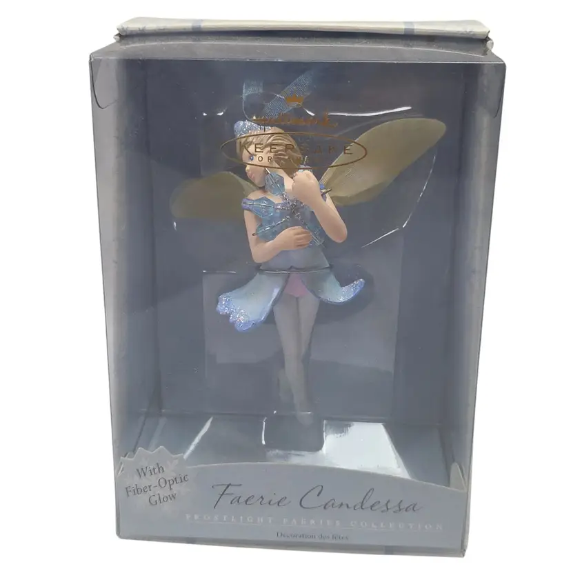 The Hallmark Keepsake Ornament "Faerie Candessa" from the Frostlight Faeries Collection brings enchantment to your holiday decor. Handcrafted in 2001, this ornament features intricate detailing, including fiber-optic glow technology that lights up the delicate winter bloom she holds. The faerie’s shimmery wings and pastel hues deliver a magical touch to any setting.