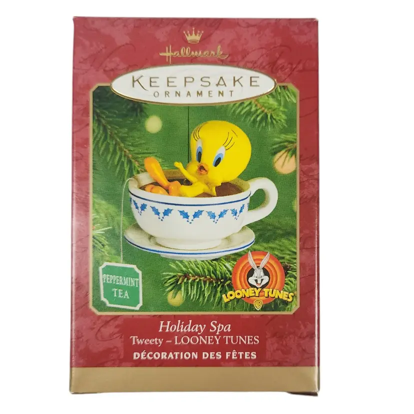 In the whimsical world of Looney Tunes, Tweety finds solace in a cozy cup of peppermint tea. This Hallmark Keepsake Ornament, dated 2001, captures the essence of holiday warmth and nostalgia. A delightful addition to any collector's trove, this porcelain piece tells a story of charm and winter cheer.