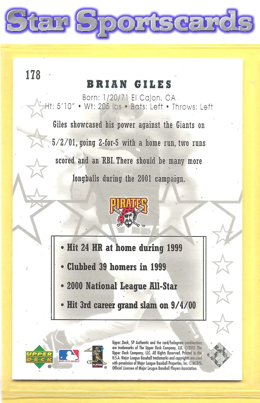 This is a nice example of a 2001 SP Authentic #178 Brian Giles #/1250 .Other important information about this card: SN In Brian Giles played for the Pittsburgh Pirates.Please check out our other listings for more great cards.