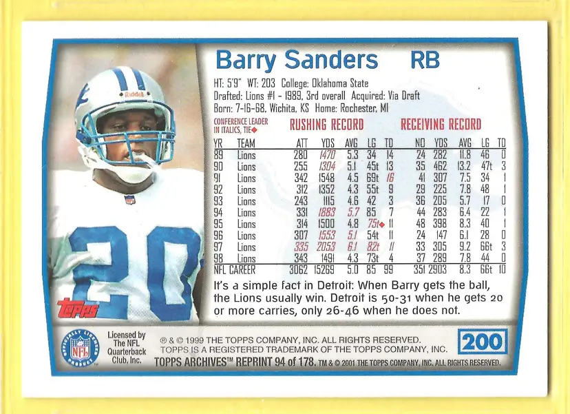 This is a nice example of a 2001 Topps Archives #94 Barry Sanders .Other important information about this card: In Barry Sanders played for the Detroit Lions.Please check out our other listings for more great cards.