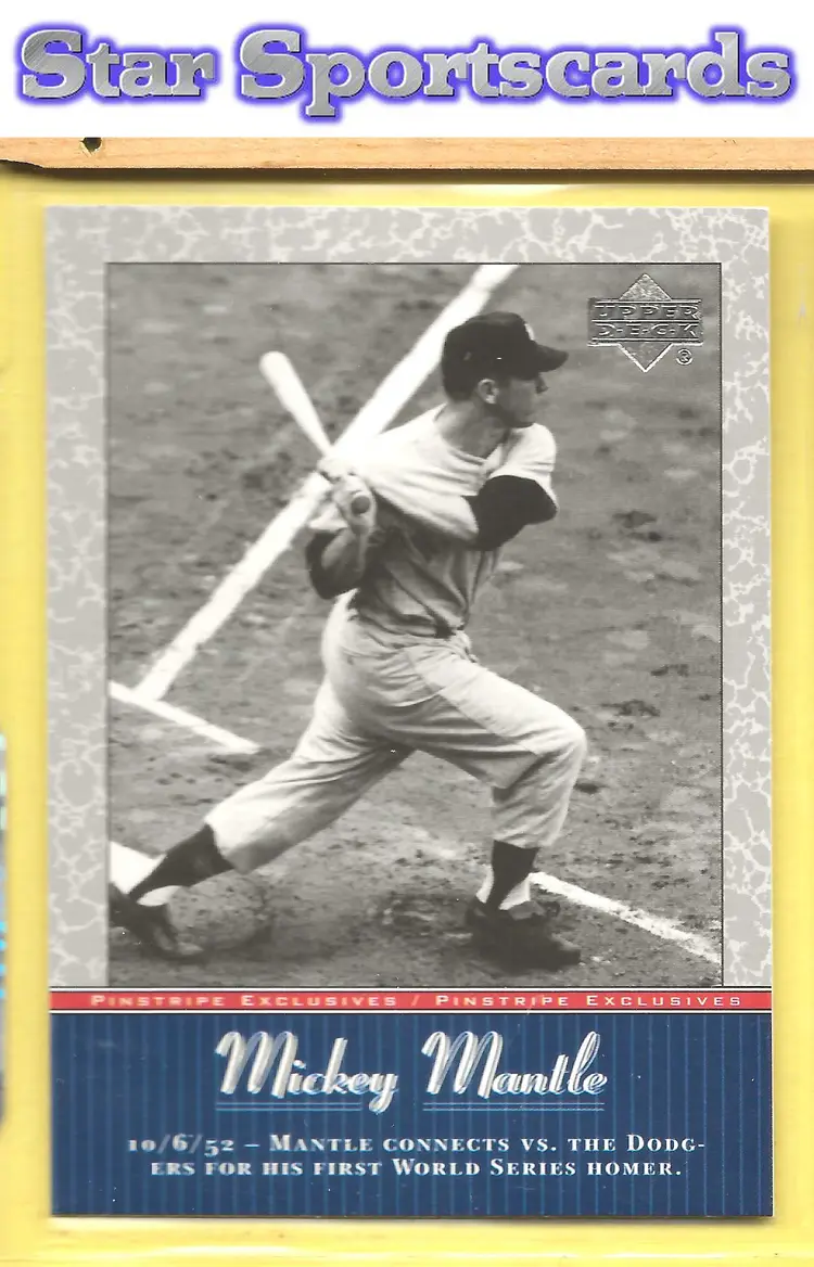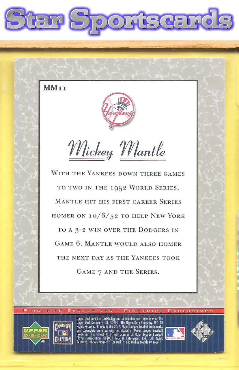 This is a nice example of a 2001 Upper Deck #MM11 Mickey Mantle Pinstripe Exclusives Mickey Mantle .Other important information about this card: In Mickey Mantle played for the New York Yankees.Please check out our other listings for more great cards.