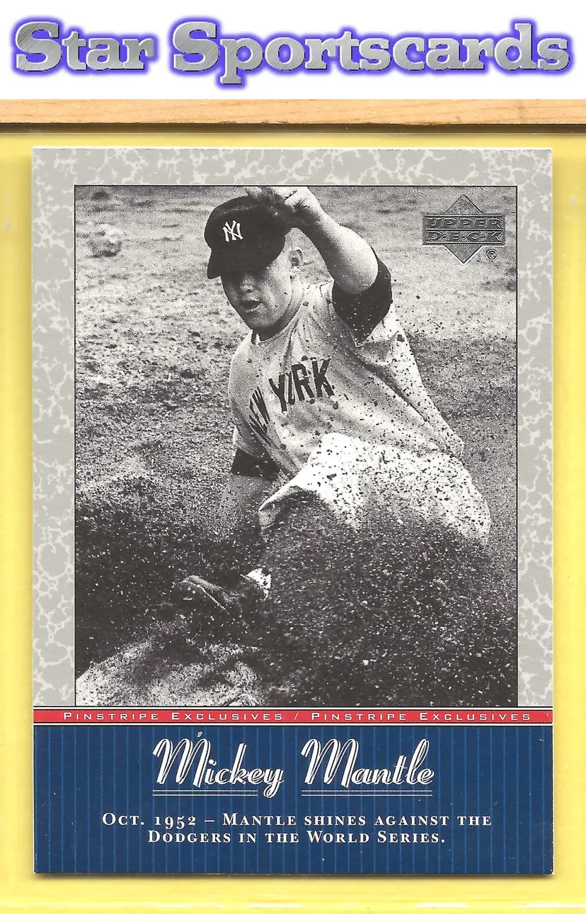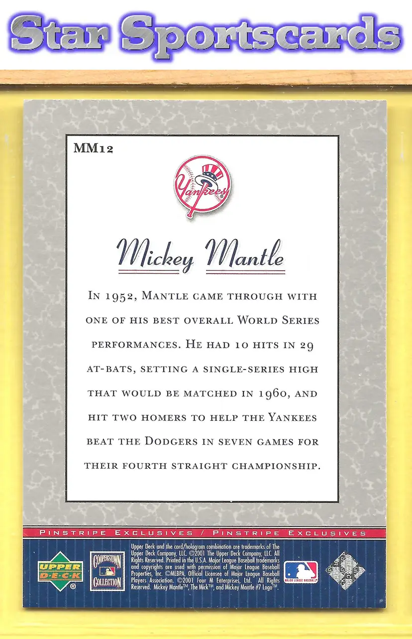 This is a nice example of a 2001 Upper Deck #MM12 Mickey Mantle Pinstripe Exclusives Mickey Mantle .Other important information about this card: In Mickey Mantle played for the New York Yankees.Please check out our other listings for more great cards.