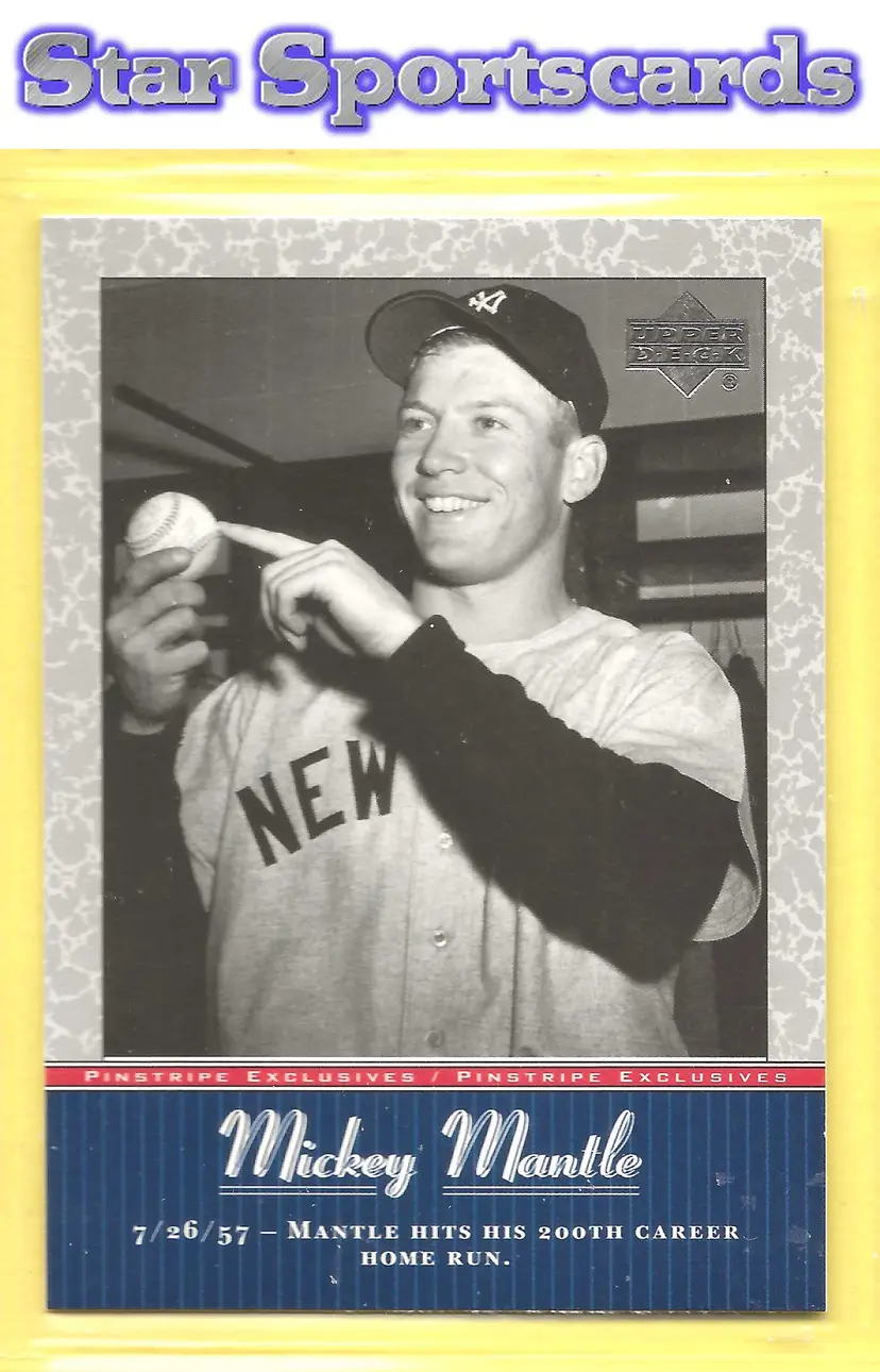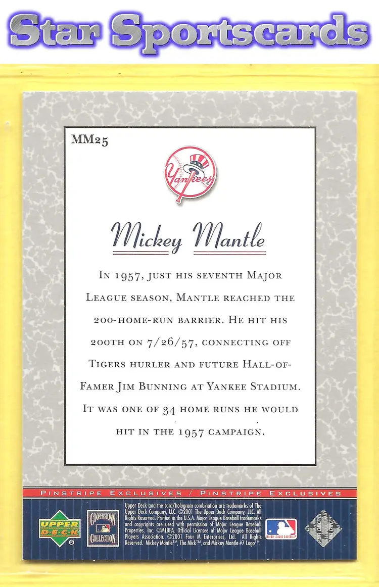 This is a nice example of a 2001 Upper Deck #MM25 Mickey Mantle Pinstripe Exclusives Mickey Mantle .Other important information about this card: In Mickey Mantle played for the New York Yankees.Please check out our other listings for more great cards.