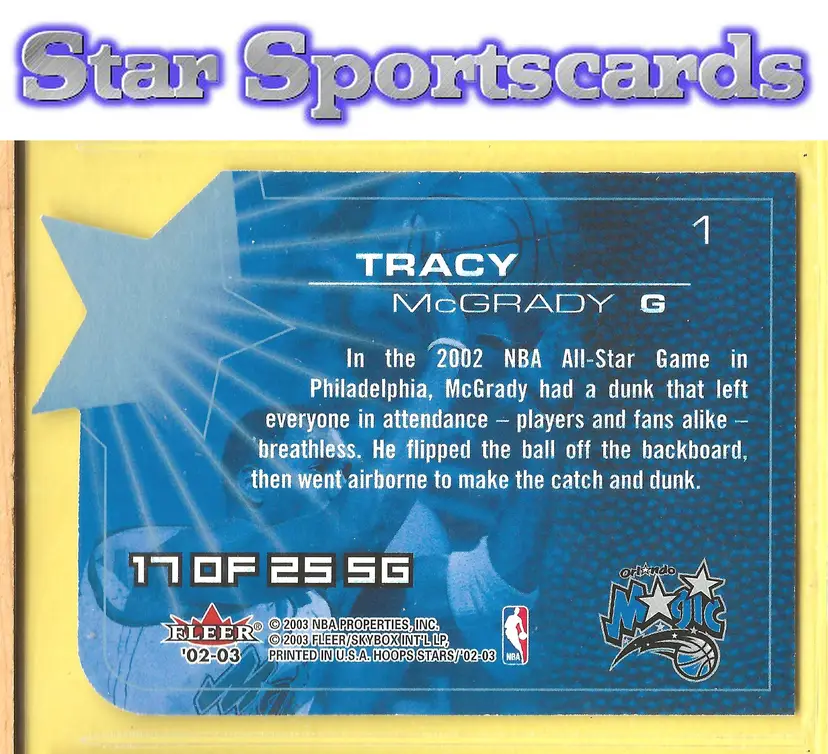 This is a nice example of a 2002-03 Hoops Stars #17 SG Tracy McGrady Star Gazing Blue .Other important information about this card: In Tracy McGrady played for the Orlando Magic.Please check out our other listings for more great cards.