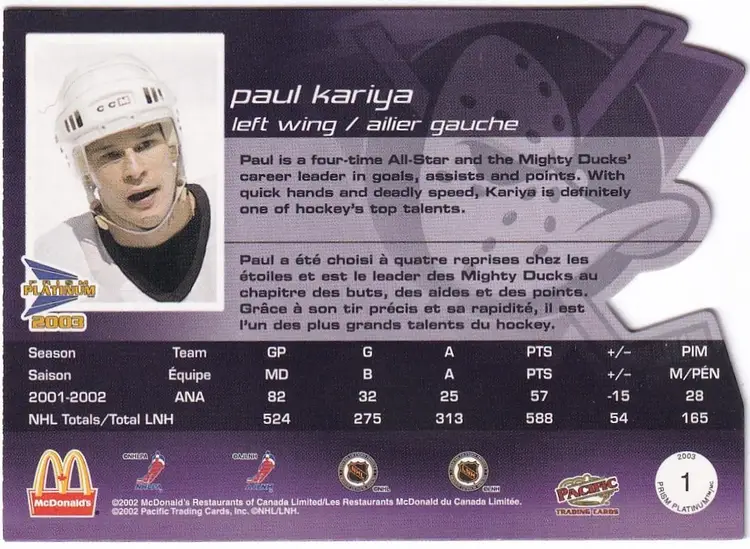 2002-03 McDonald's Pacific Atomic #1 Paul Kariya Anaheim Ducks