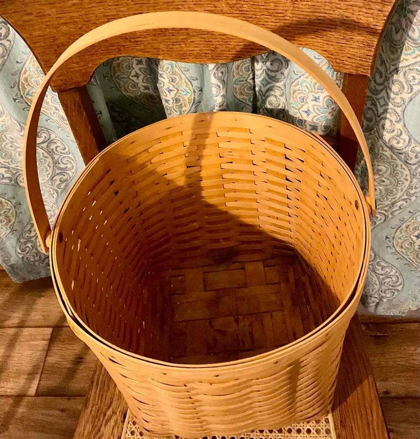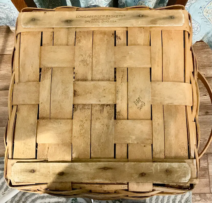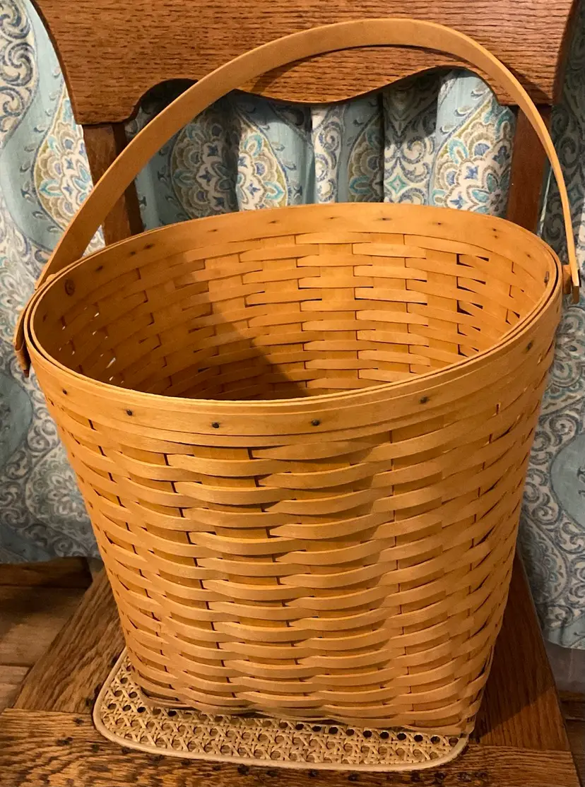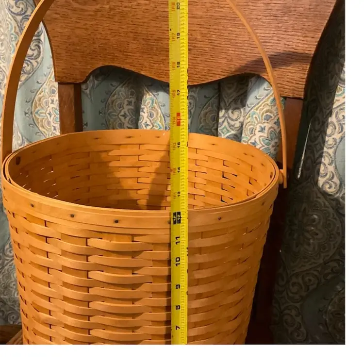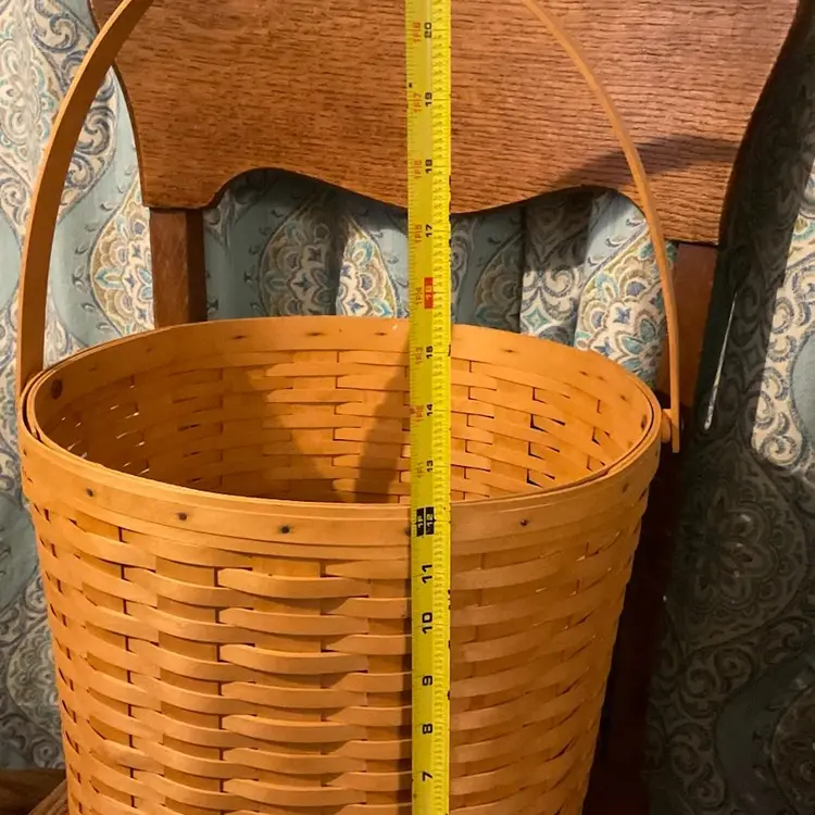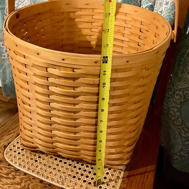 24” Handle 13” Basket 14” Across Top No breaks splints or cracks! Some minor staining on bottom of inside but can not be seen on 3 of the 4 out sides Marked “Longaberger Baskets Handwoven Dresden, Ohio USA” on bottom with 2002 date See all pictures please No liner or lid