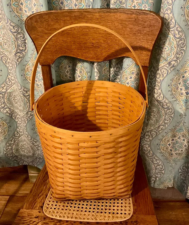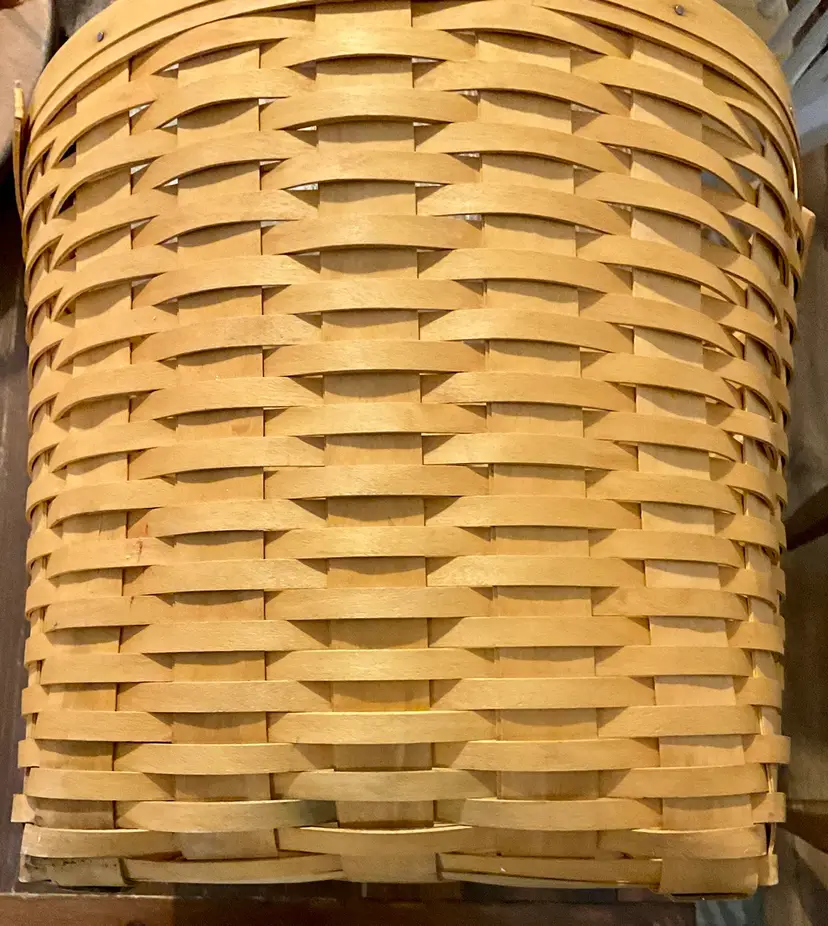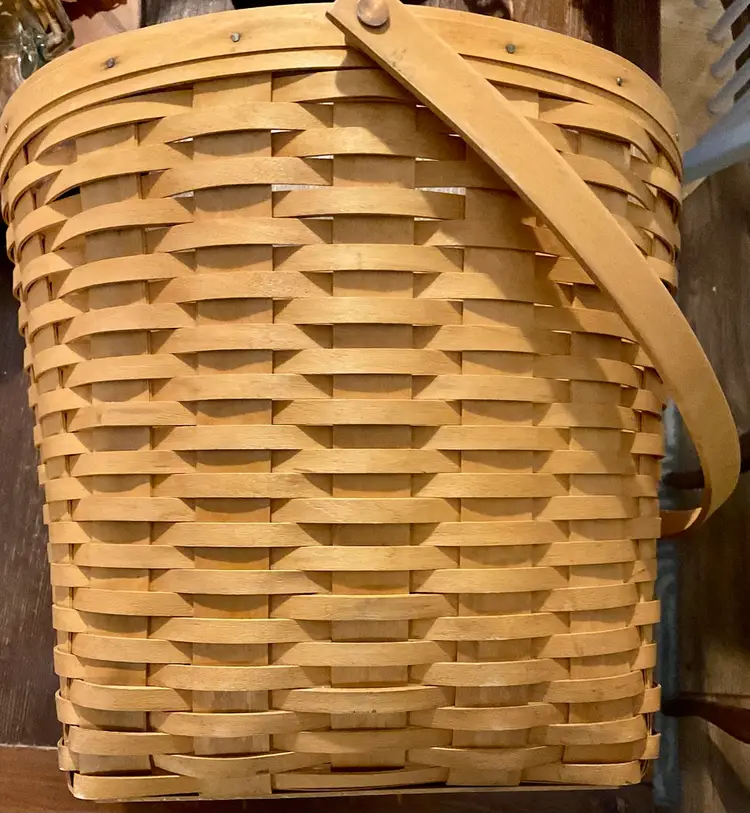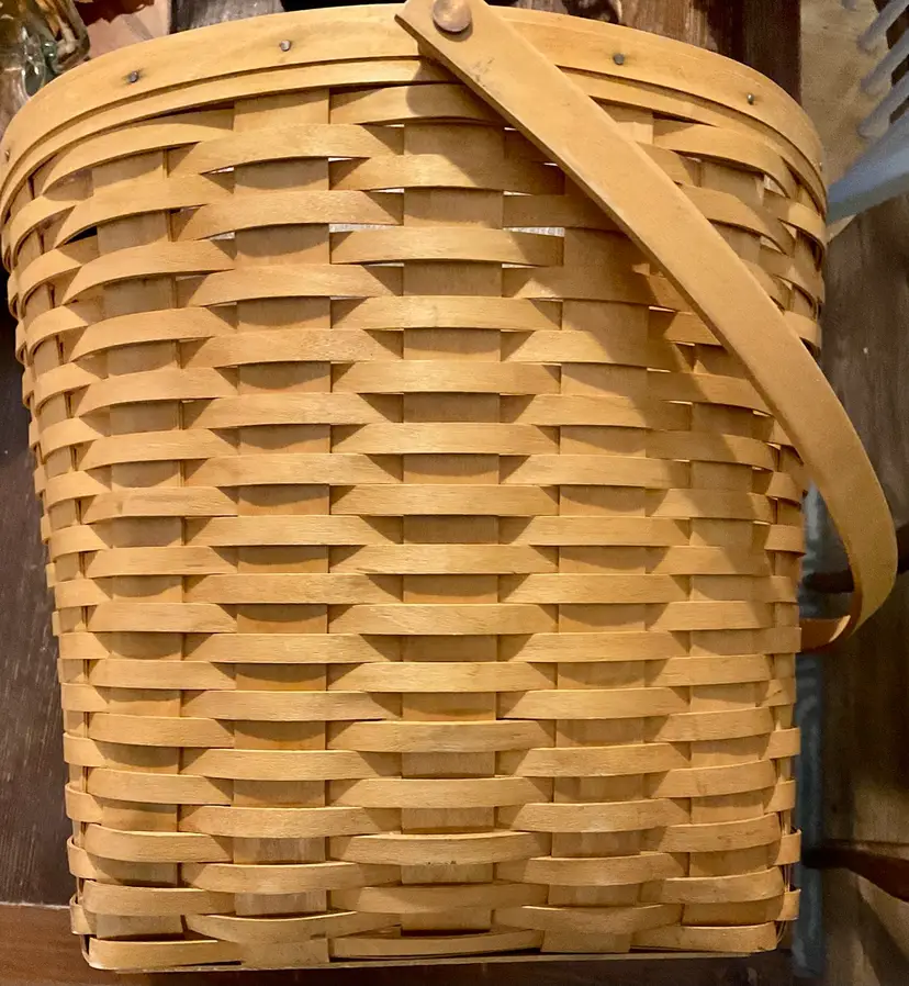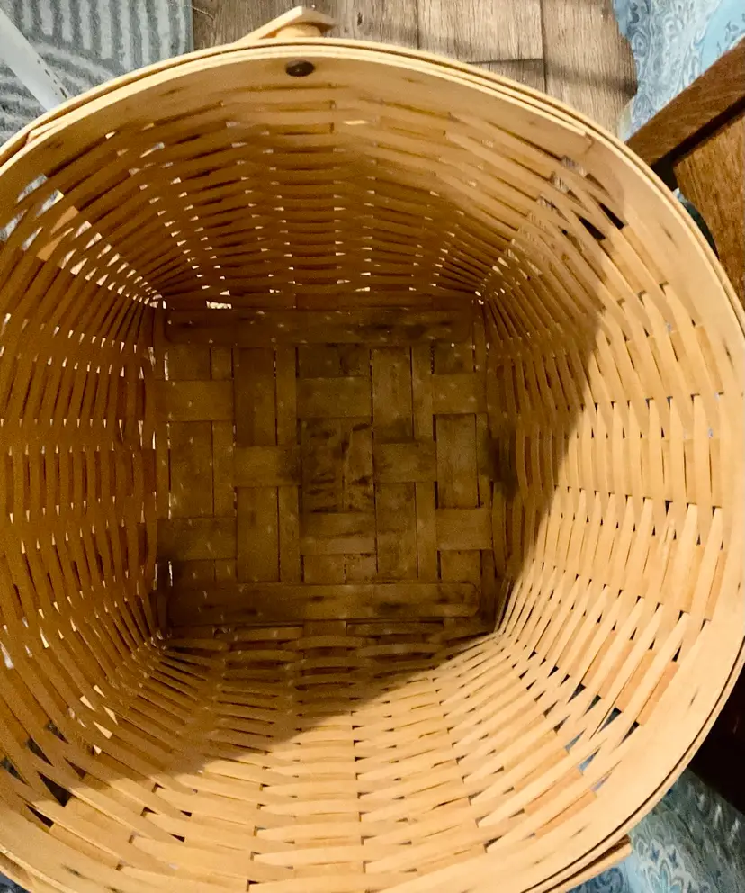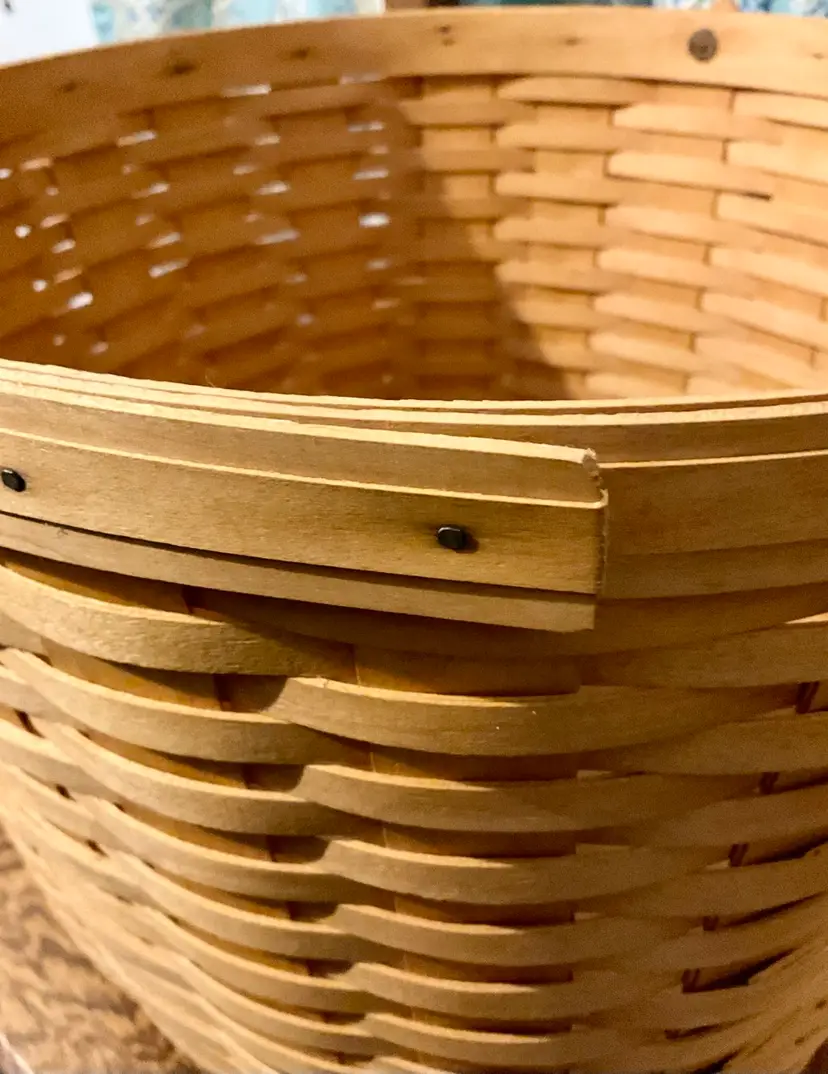 24” Handle 13” Basket 14” Across Top No breaks splints or cracks! Some minor staining on bottom of inside but can not be seen on 3 of the 4 out sides Marked “Longaberger Baskets Handwoven Dresden, Ohio USA” on bottom with 2002 date See all pictures please No liner or lid