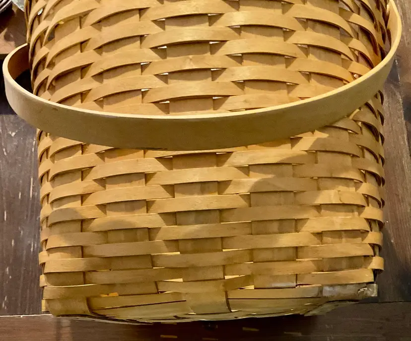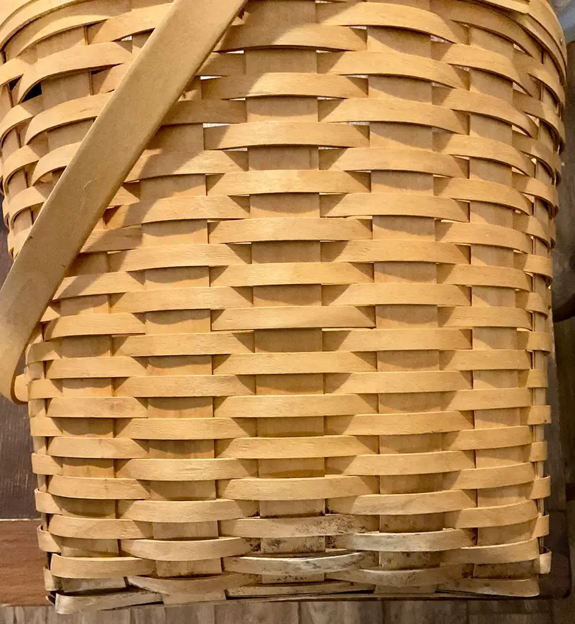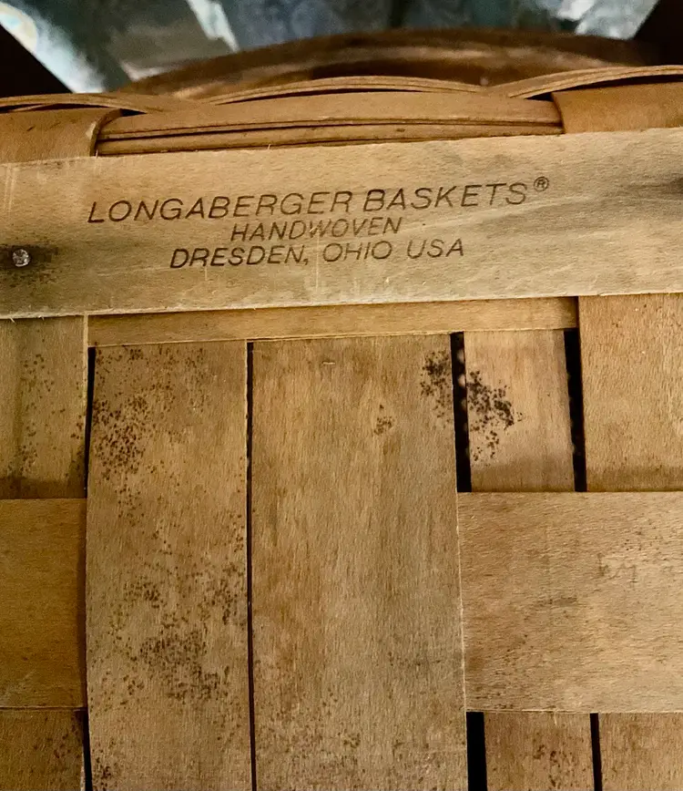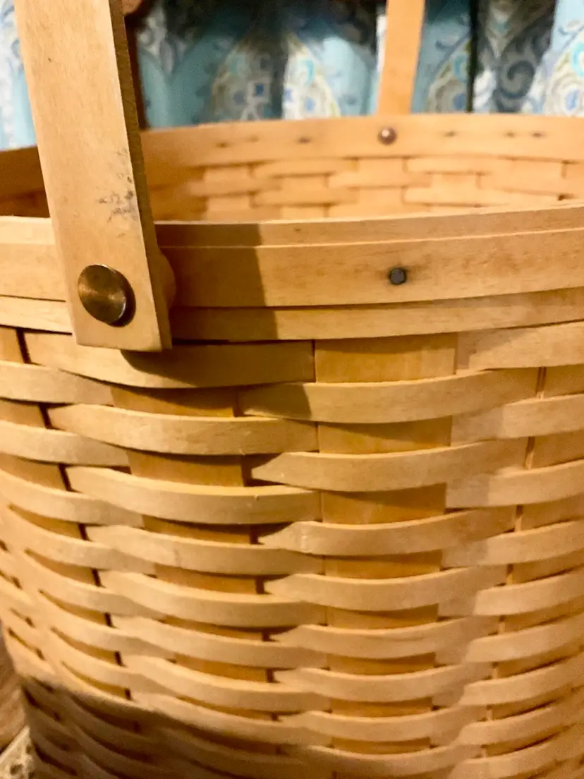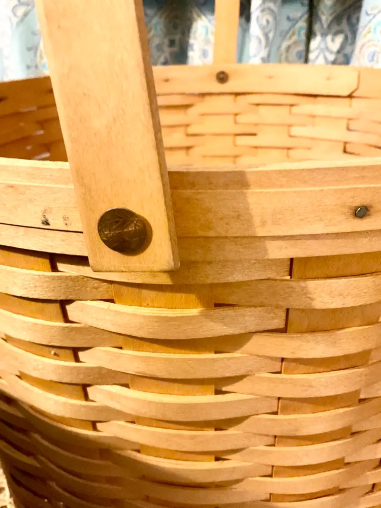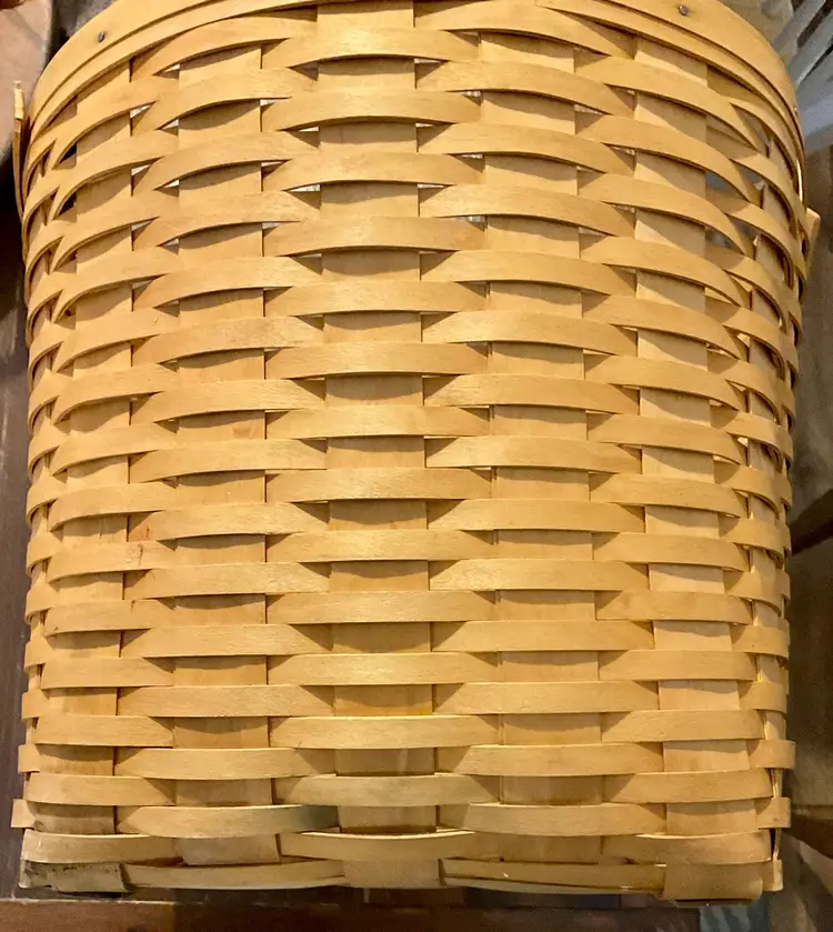24” Handle 13” Basket 14” Across Top No breaks splints or cracks! Some minor staining on bottom of inside but can not be seen on 3 of the 4 out sides Marked “Longaberger Baskets Handwoven Dresden, Ohio USA” on bottom with 2002 date See all pictures please No liner or lid