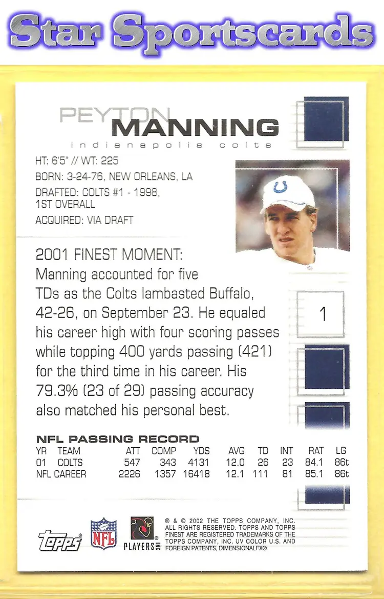 This is a nice example of a 2002 Finest #1 Peyton Manning .Other important information about this card: In Peyton Manning played for the Indianapolis Colts.Please check out our other listings for more great cards.