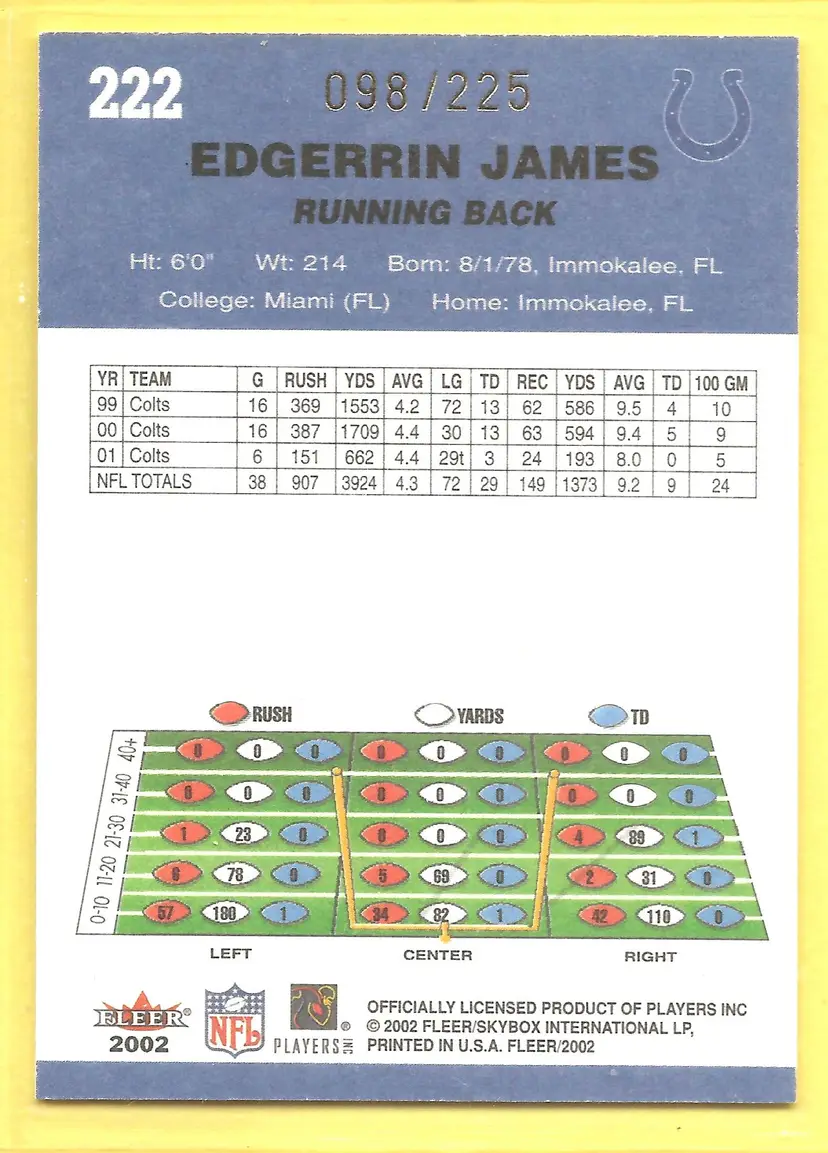 This is a nice example of a 2002 Fleer #222 Edgerrin James Tiffany #/225 .Other important information about this card: SN In Edgerrin James played for the Indianapolis Colts.Please check out our other listings for more great cards.