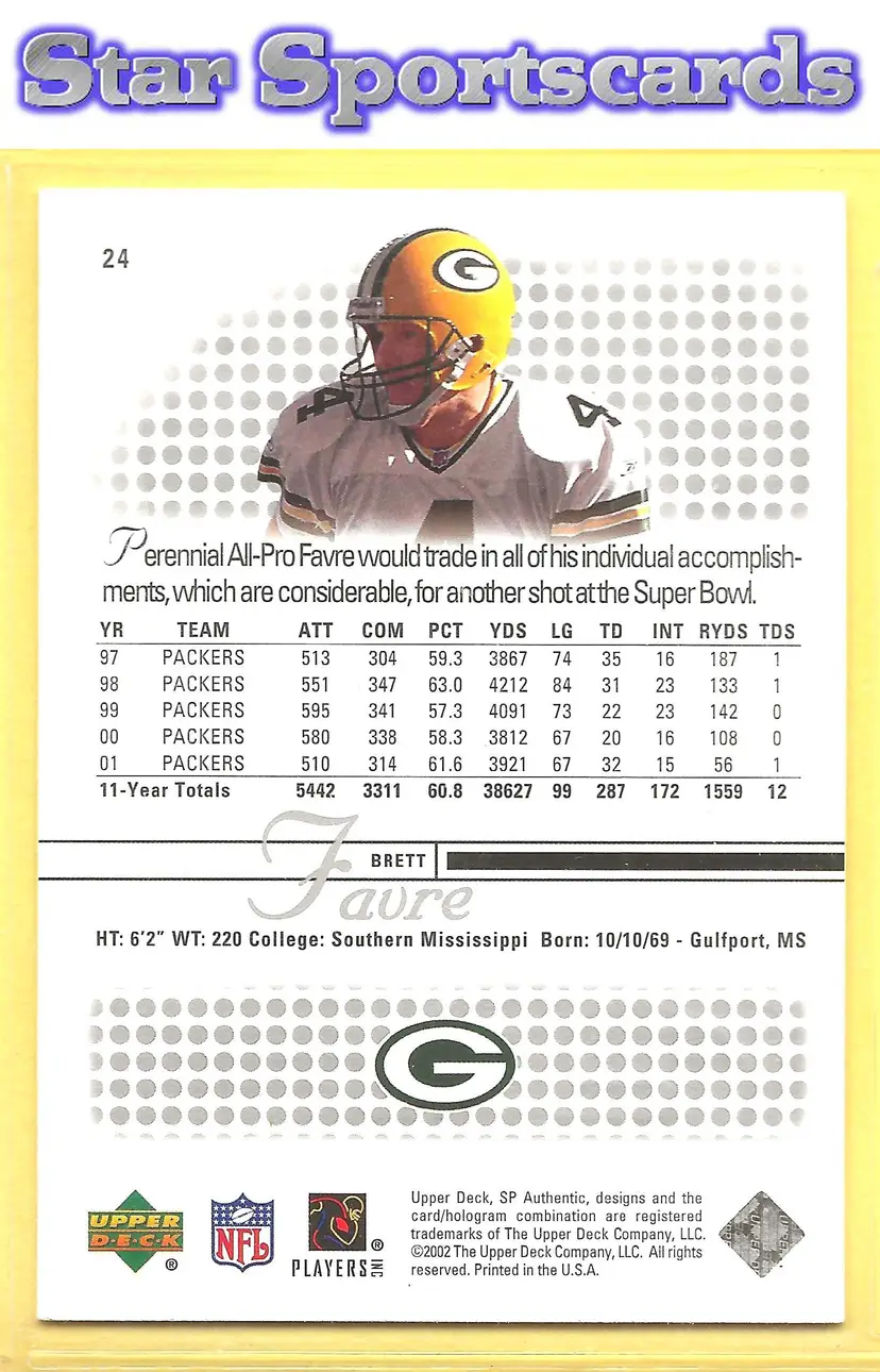 This is a nice example of a 2002 SP Authentic #24 Brett Favre .Other important information about this card: In Brett Favre played for the Green Bay Packers.Please check out our other listings for more great cards.