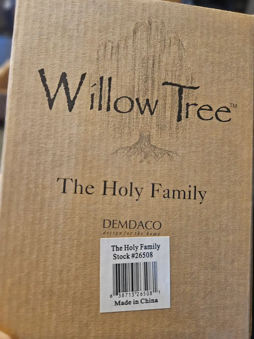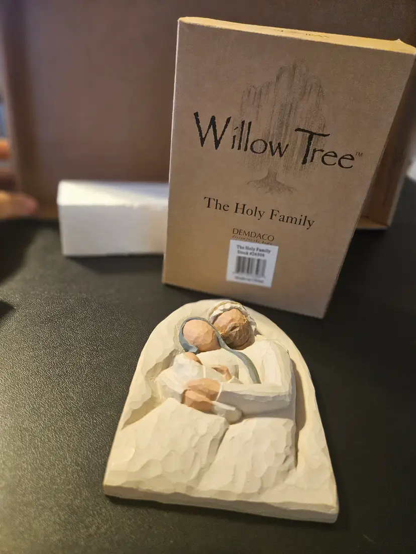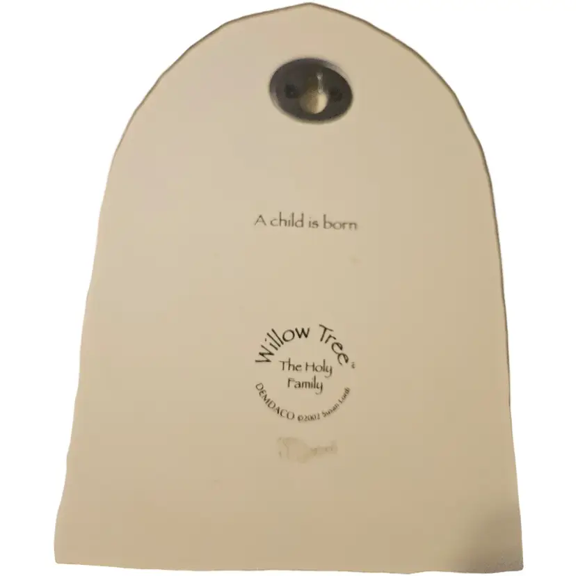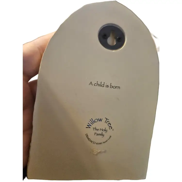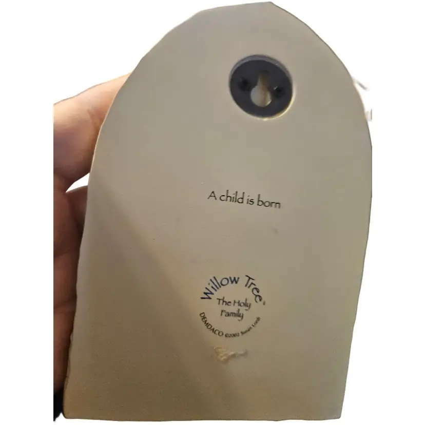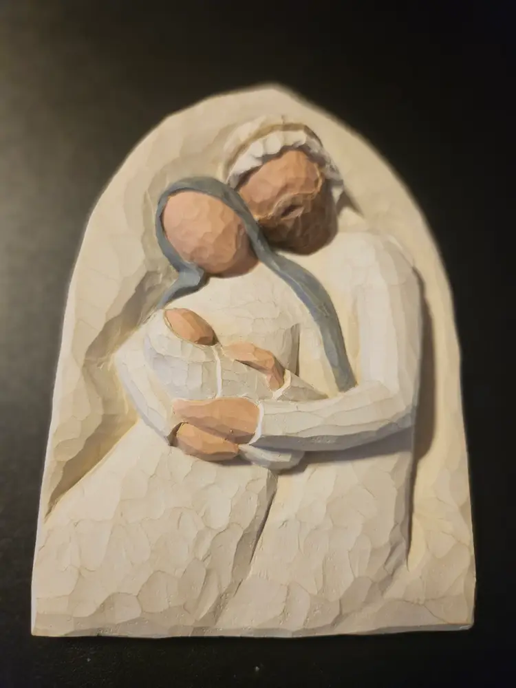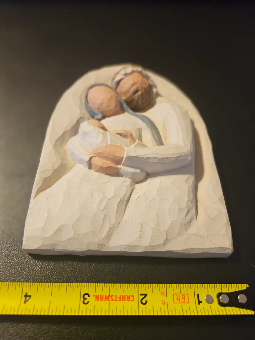 The plaque is made of cast resin and features a bas-relief carving of Mary, Joseph, and baby Jesus.