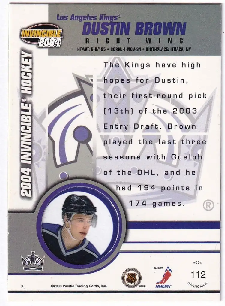 2003-04 Pacific Invincible Retail #112 Dustin Brown RC Los Angeles Kings