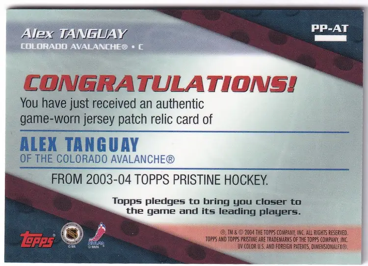 2003-04 Topps Pristine Patches #PPAT Alex Tanguay Colorado Avalanche
