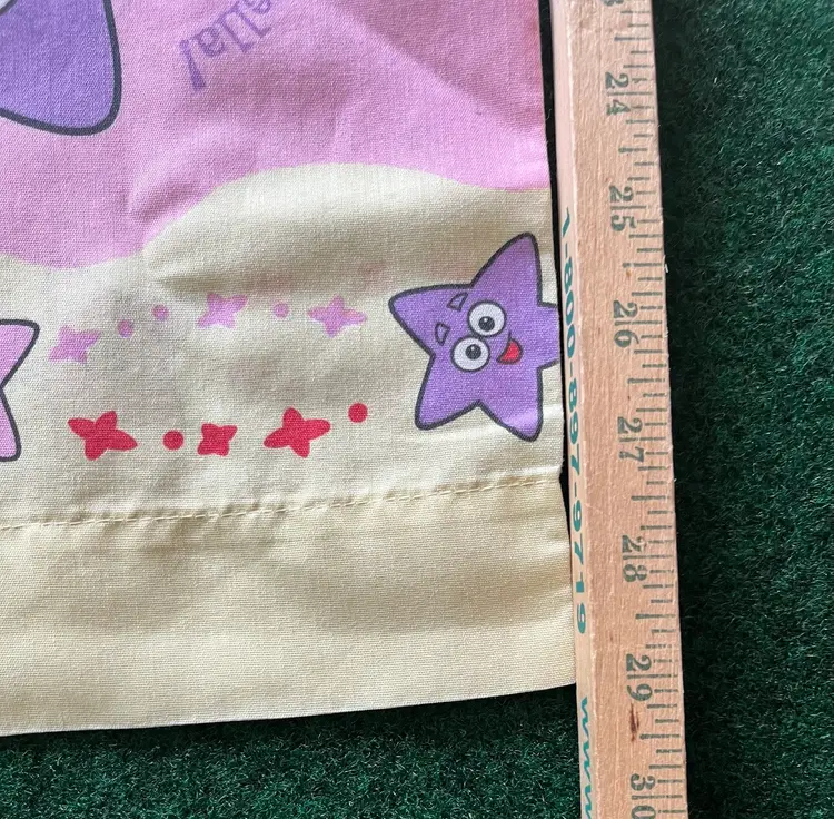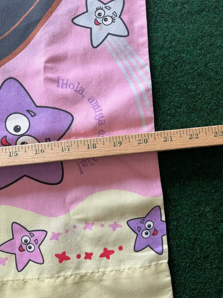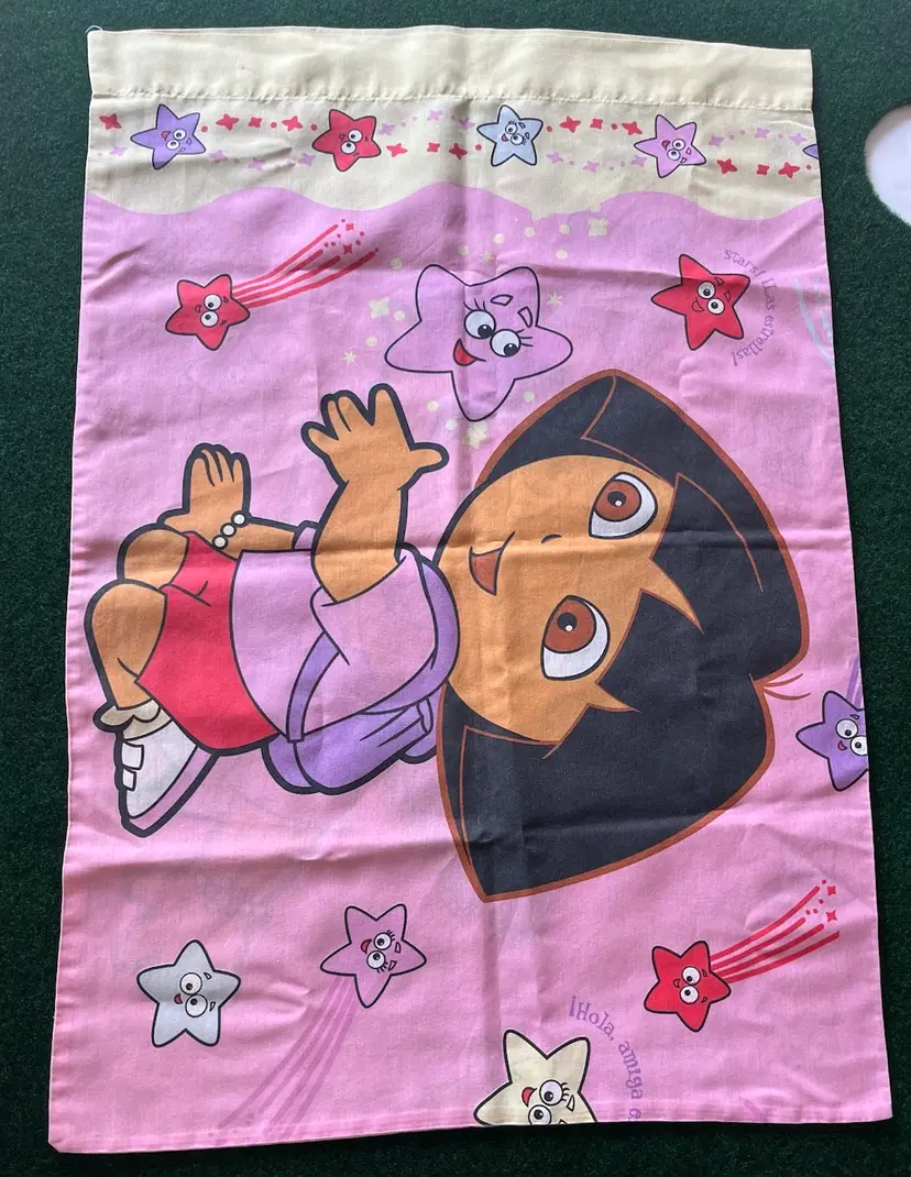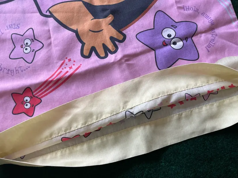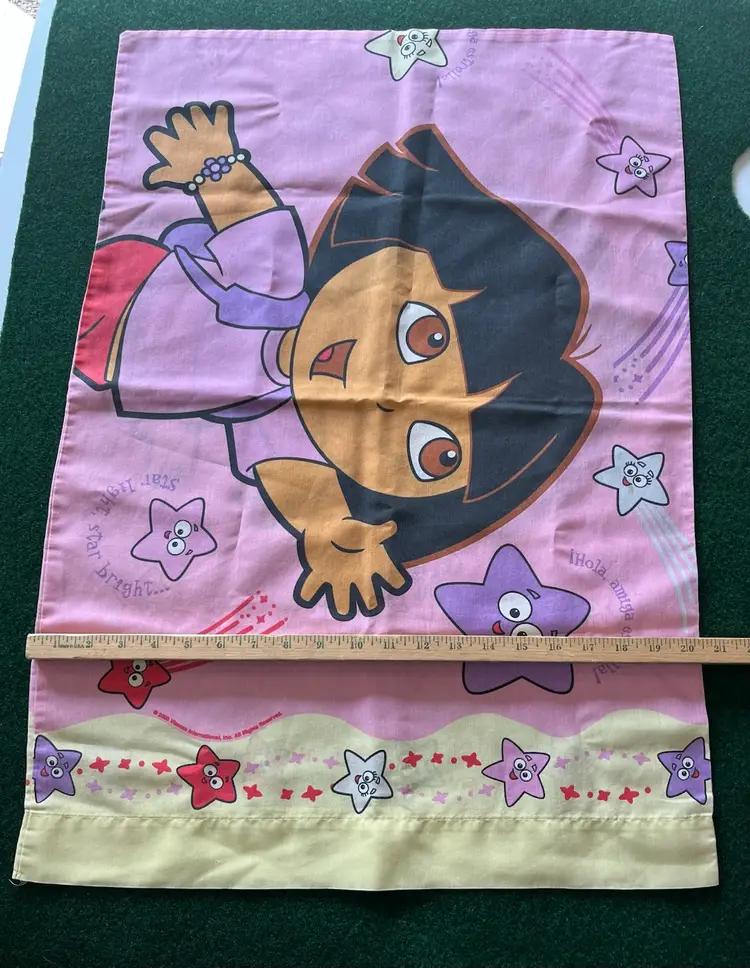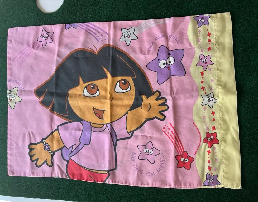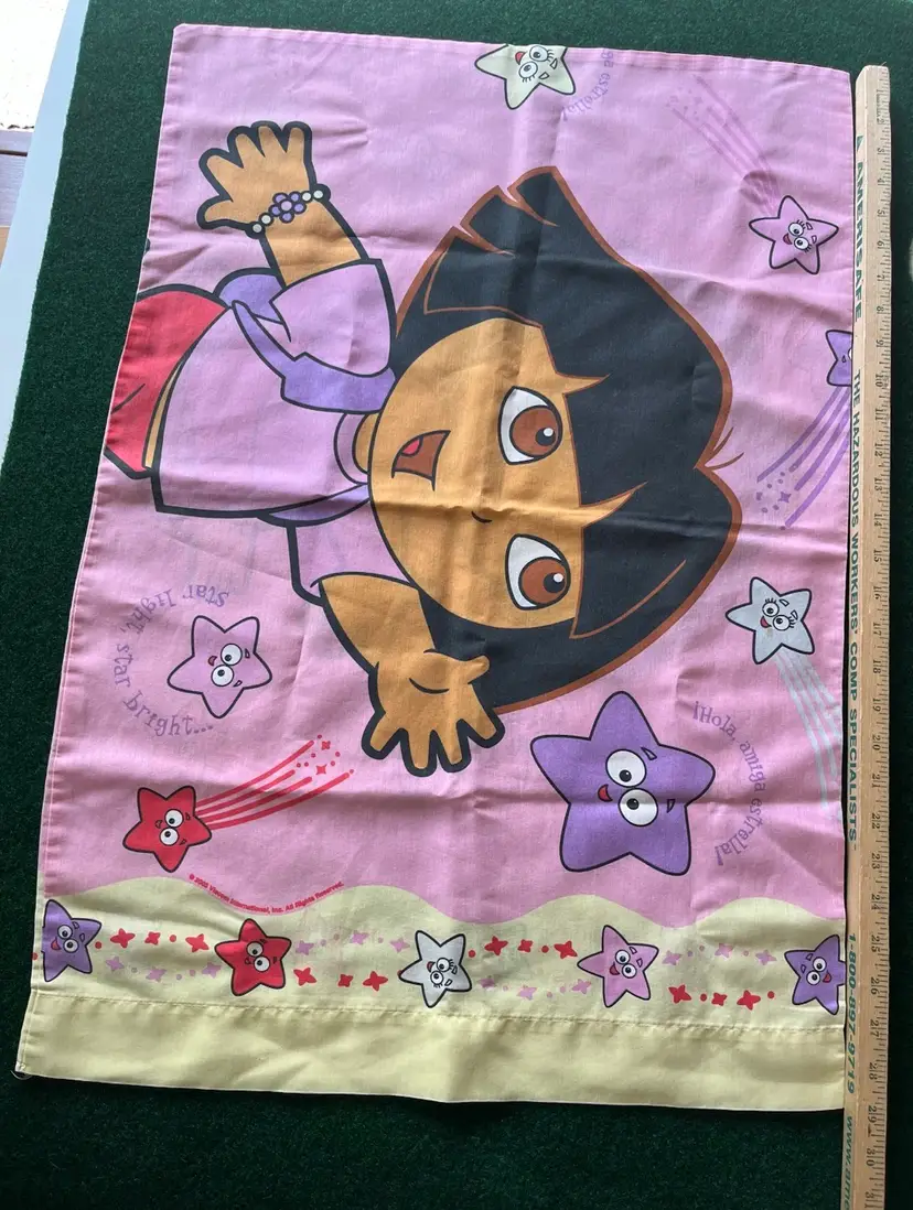 The 2003 Dora the Explorer “Star Light, Star Bright” ~ “Hola, Amiga Estrella” Standard Pillowcase by Viscom International is a bold, bright, colorful and fun addition to a child's bedroom. With an all-over Dora the Explorer Nickelodeon character print on both sides, this rectangular pillowcase is made of a comfortable cotton or cotton blend material. Easy to care for with machine washable instructions, this vintage/retro style pillowcase features a slip-on closure and measures 29" in length and 20.5" in width. Perfect for young (or older) fans of the popular children's television program, this unique and double-sided pillowcase adds a touch of nostalgia to bedtime routines.