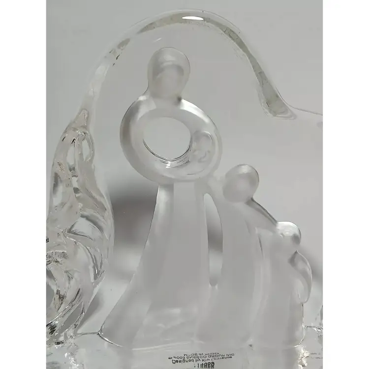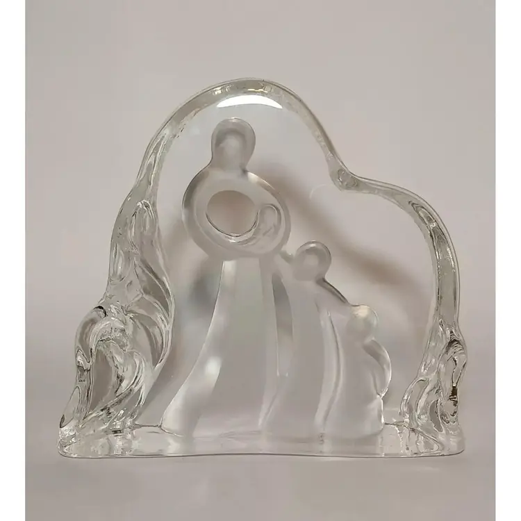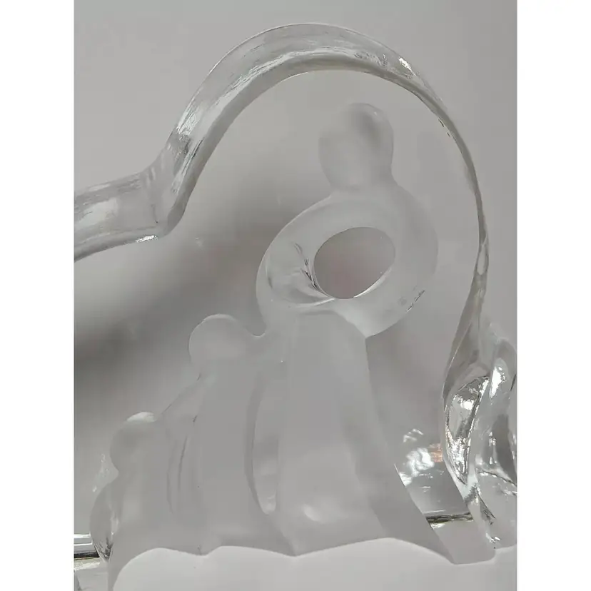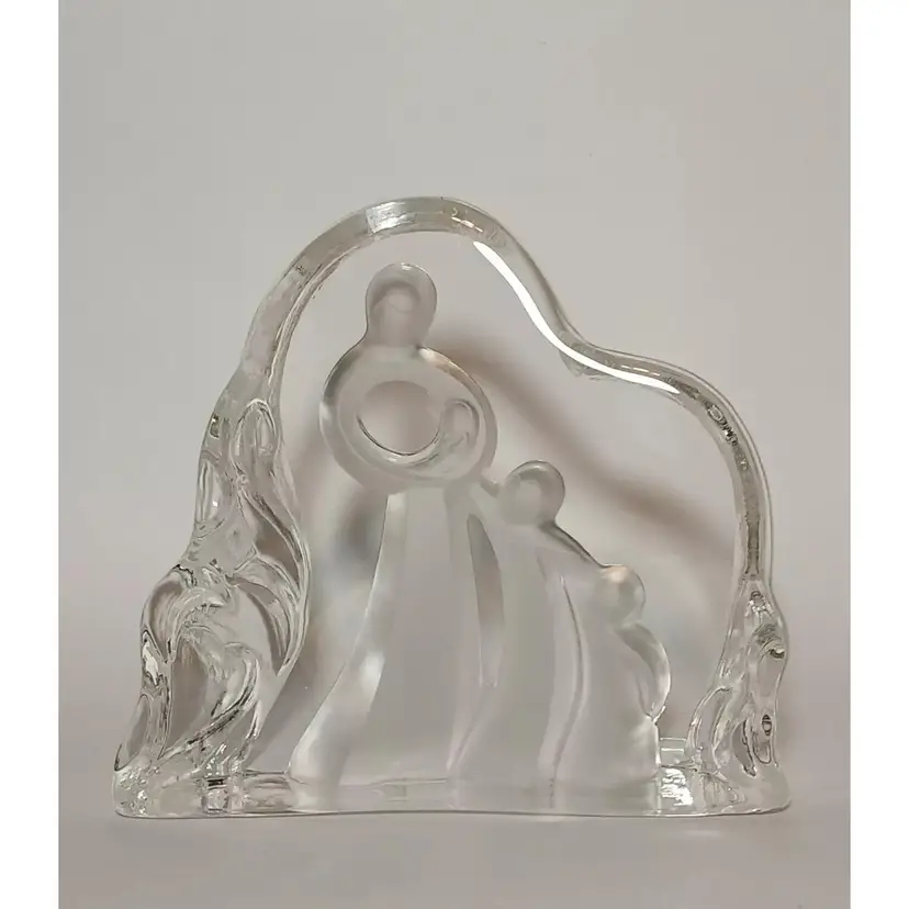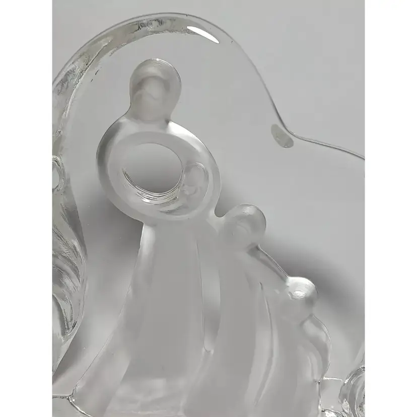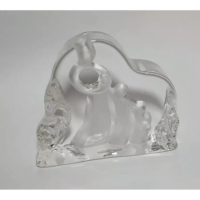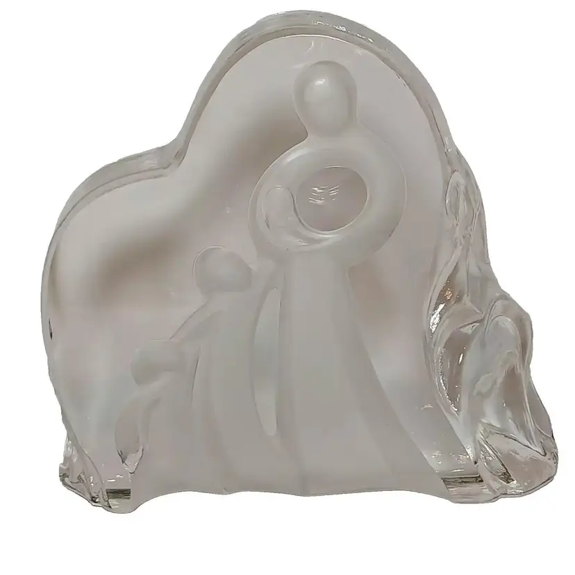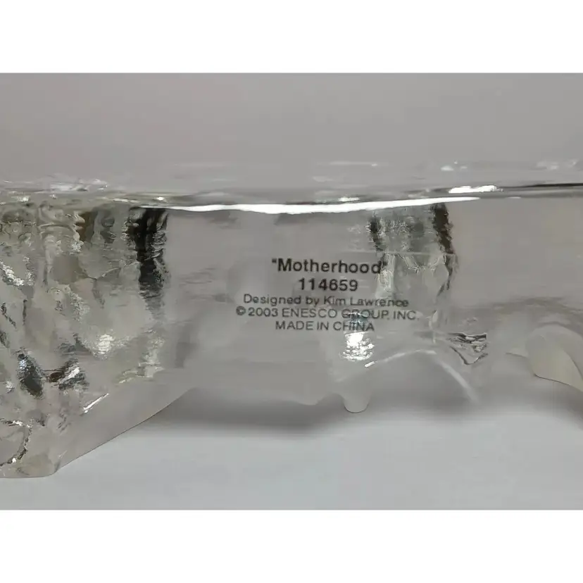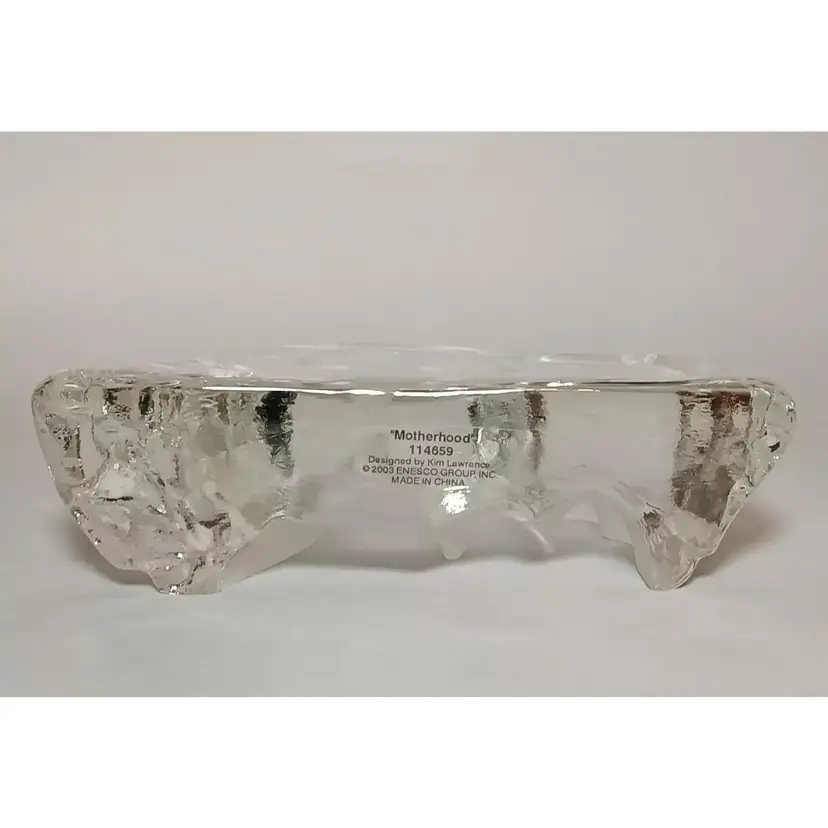 2003 Enesco crystal clear glass figure. "Motherhood" designed by Kim Lawrence #114659. Featuring a glass slab with a mother embracing her baby in her arms. Her 2 other young children are clinging to her side and each other. The figures are frosted for a nice contrast. The sides have a cascading texture. The original sticker is attached to the bottom. In great pre-owned condition with no chips or cracks. Please see my photos for details.