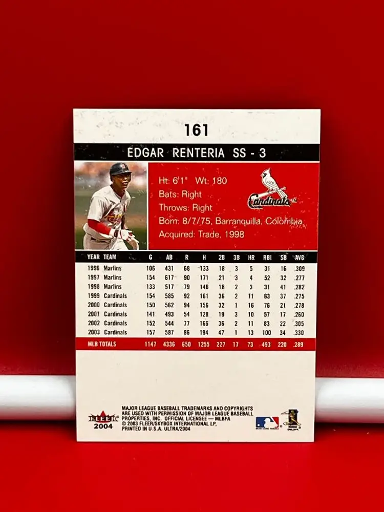 Hello, what we have is a Collector Trading Card by: Fleer Ultra. Year: 2003. Team: Cardinals. Player: Edgar Renteria. Number: 161.