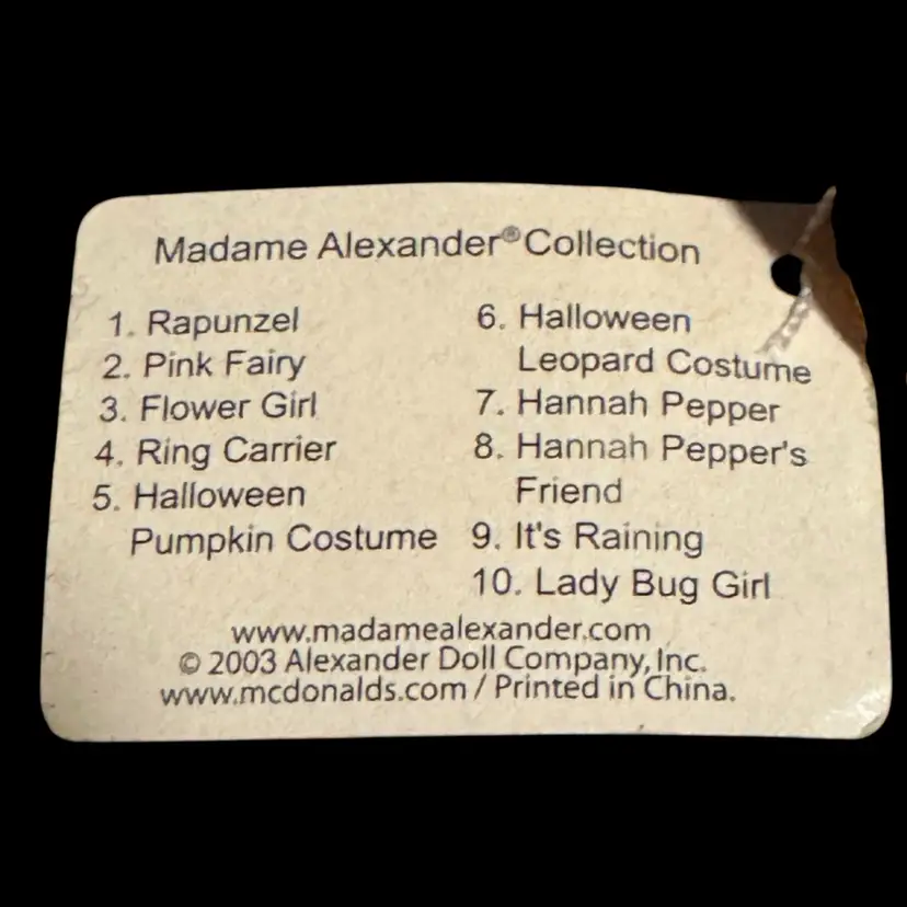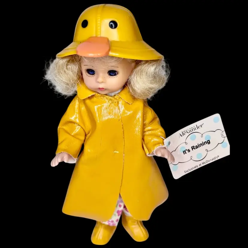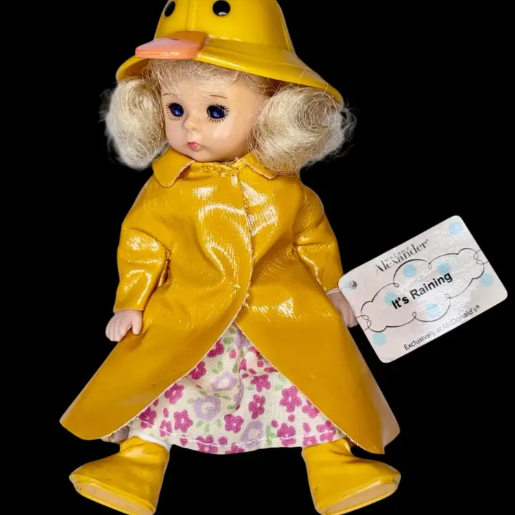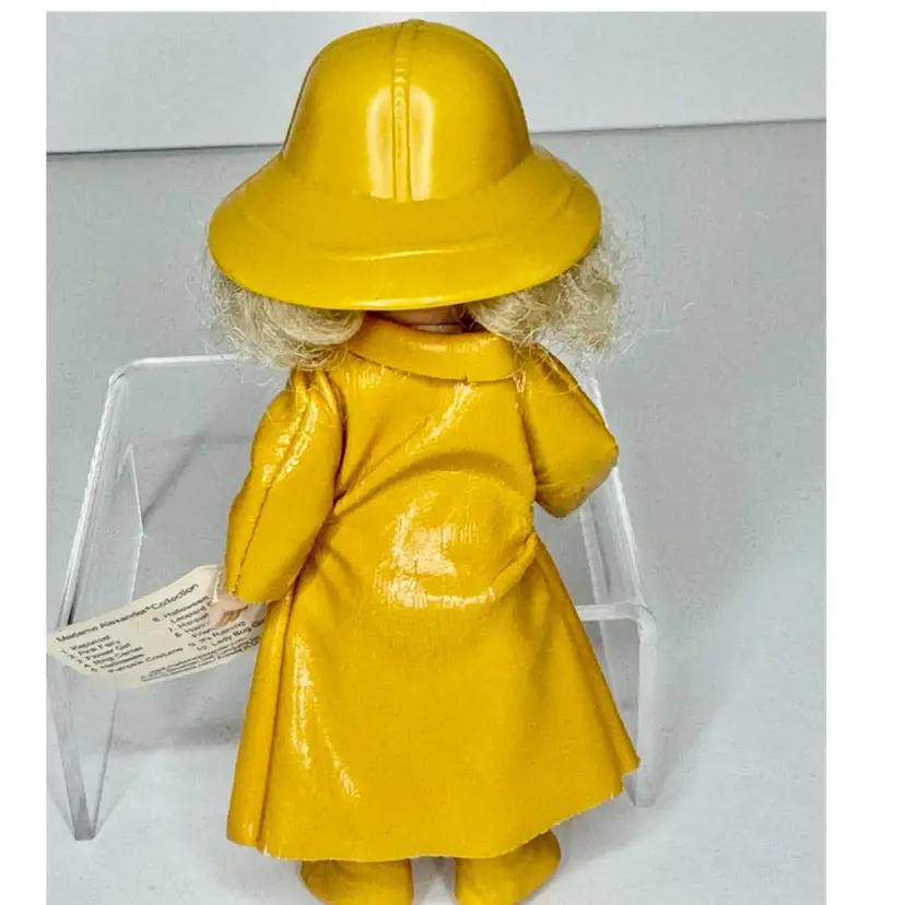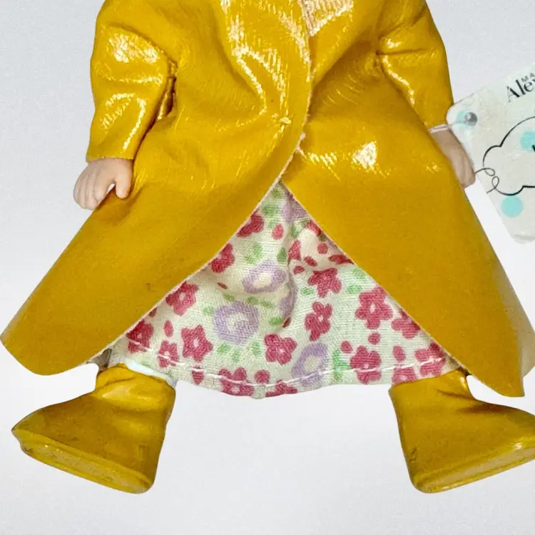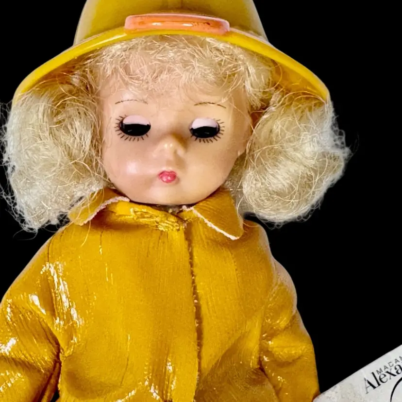 Little miss 'It's Raining' measures 5" tall and is in perfect condition with her original tag. She has sleepy eyes when she is laid down. There are 10 different Alexander Dolls in this collection which would be fun to collect. Her legs bend and she can sit. Her arms and head also move.