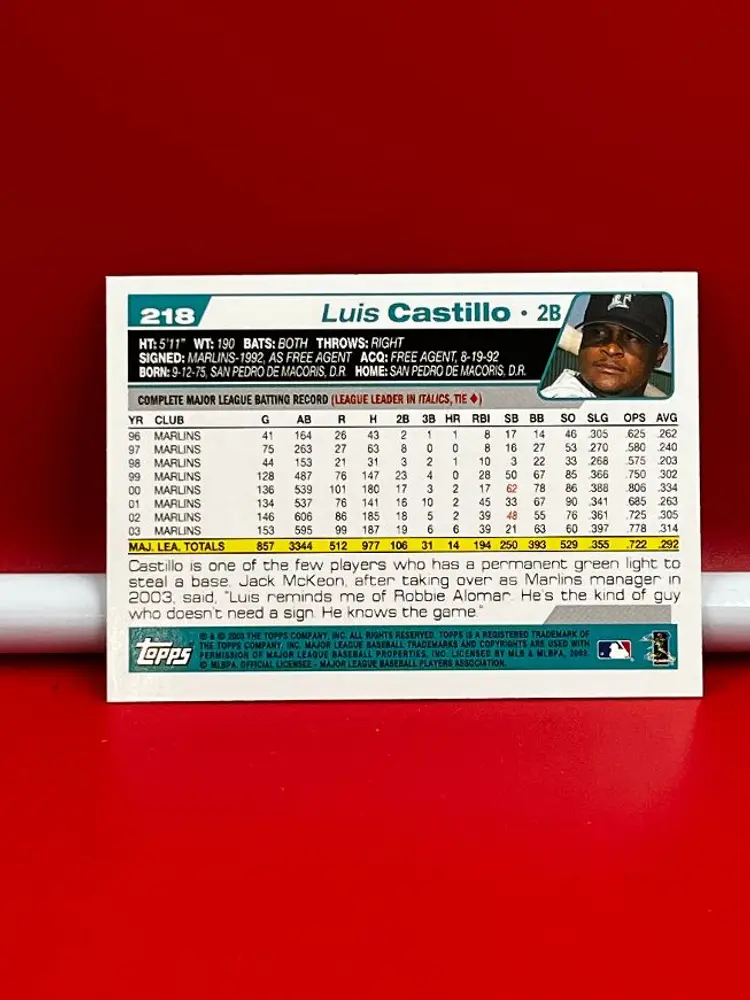 Hello, what we have is a Collector Trading Card by: Topps. Year: 2003. Team: Marlins. Player: Luis Castillo. Number: 218.