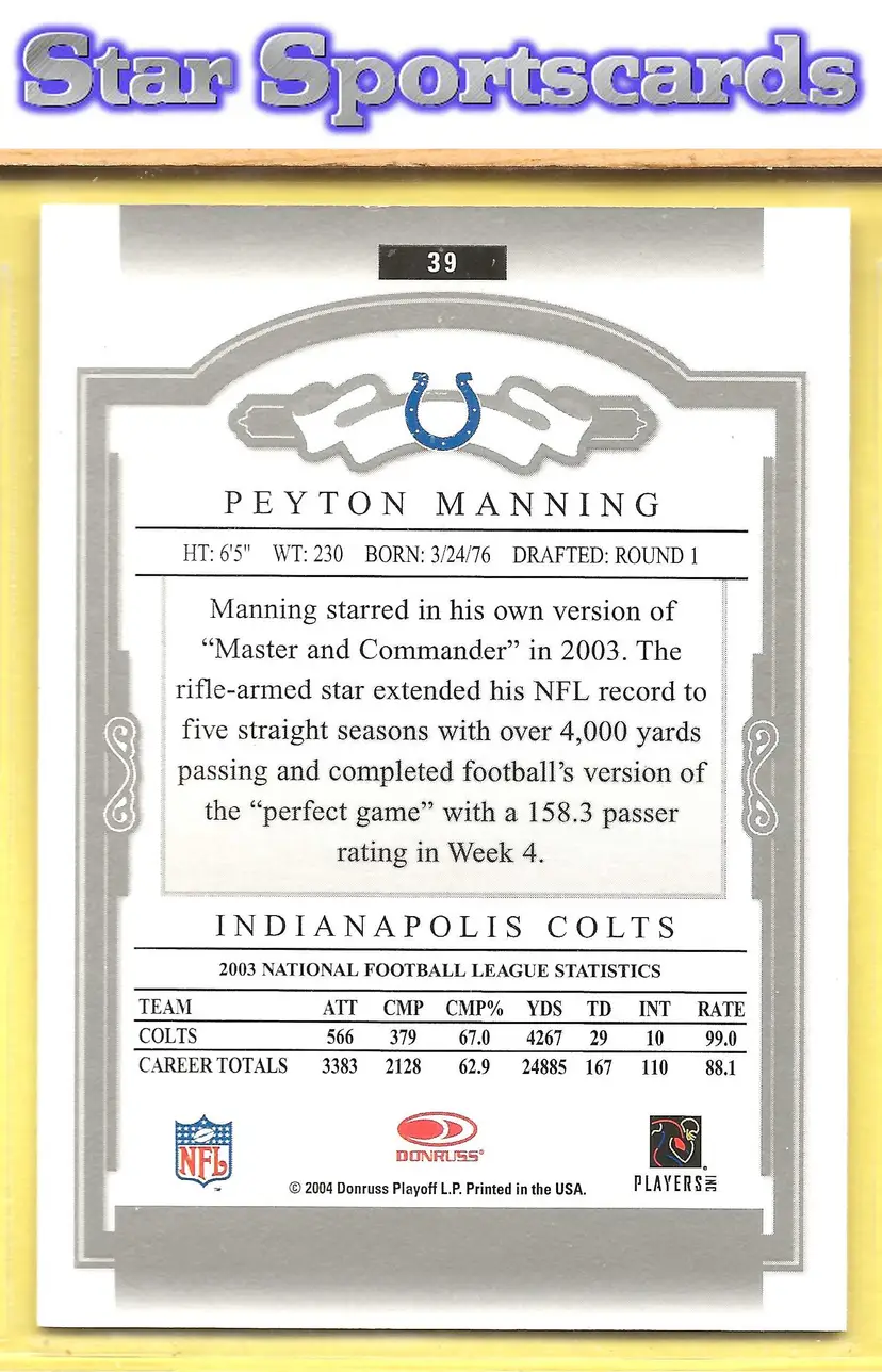 This is a nice example of a 2004 Donruss Classics #39 Peyton Manning .Other important information about this card: In Peyton Manning played for the Indianapolis Colts.Please check out our other listings for more great cards.