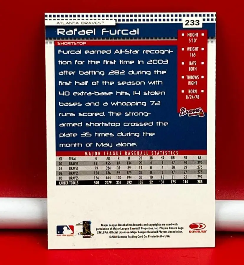 Hello, what we have is a Collector Trading Card by: Donruss. Year: 2004. Team: Braves. Player: Rafael Furcal. Number: 233.